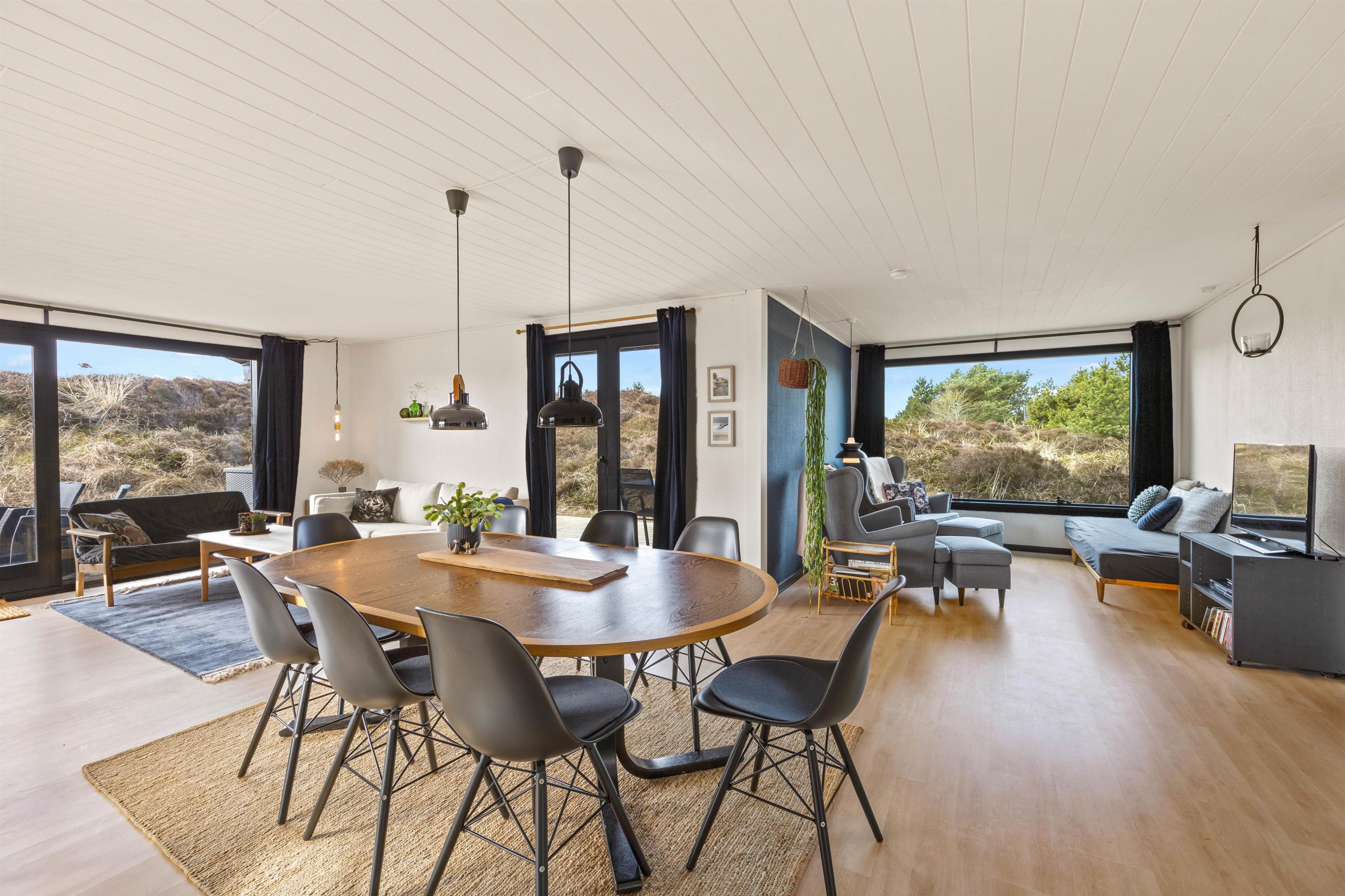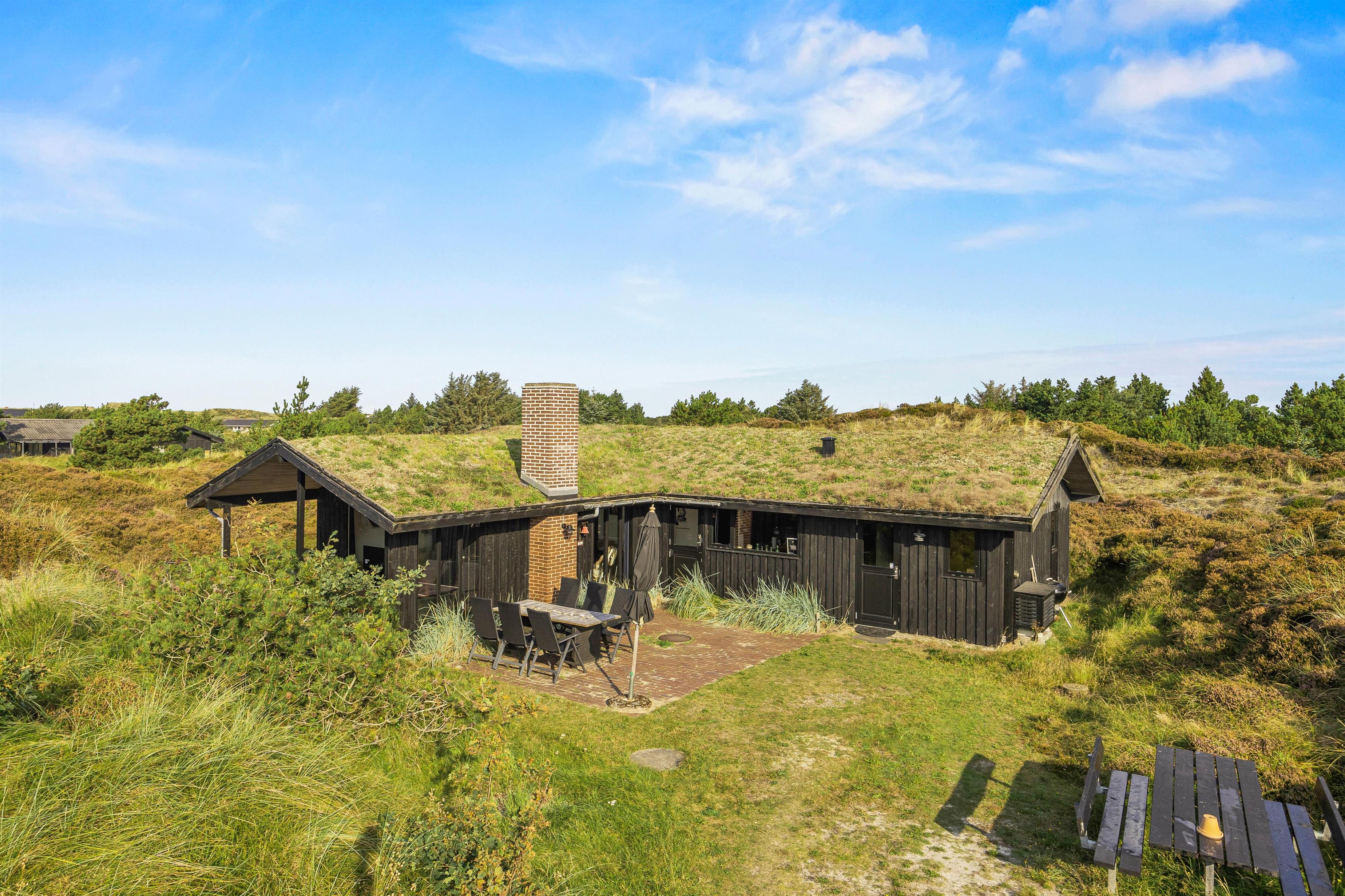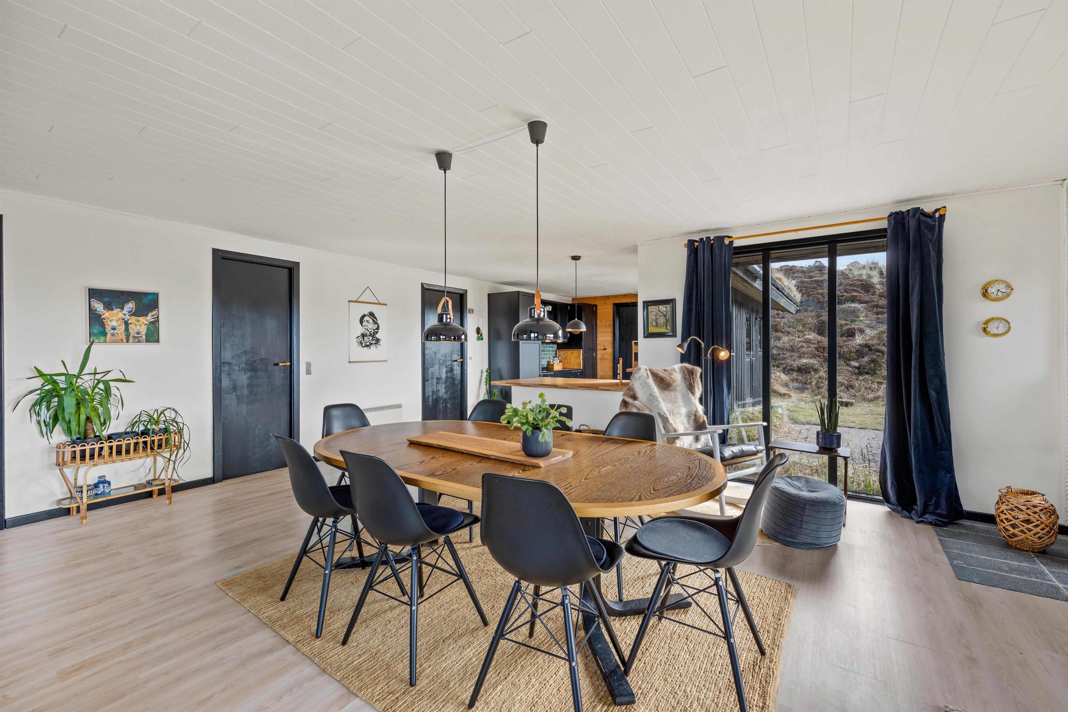 Velkommen til dette moderne og rustikt indrettede feriehus, kun 700 meter fra Vesterhavet. Her er 120 rummelige kvadratmeter til 4 personer, så I har alle muligheder for en afslappende vestkystferie. Den kuperede naturgrund indeholder essensen af vestjysk natur, nemlig lyng og klitter, og med sit græstag falder feriehuset naturligt sammen med omgivelserne. I sensommeren kan I – som vejnavnet antyder – også være heldige at finde revlingebær lige udenfor døren.