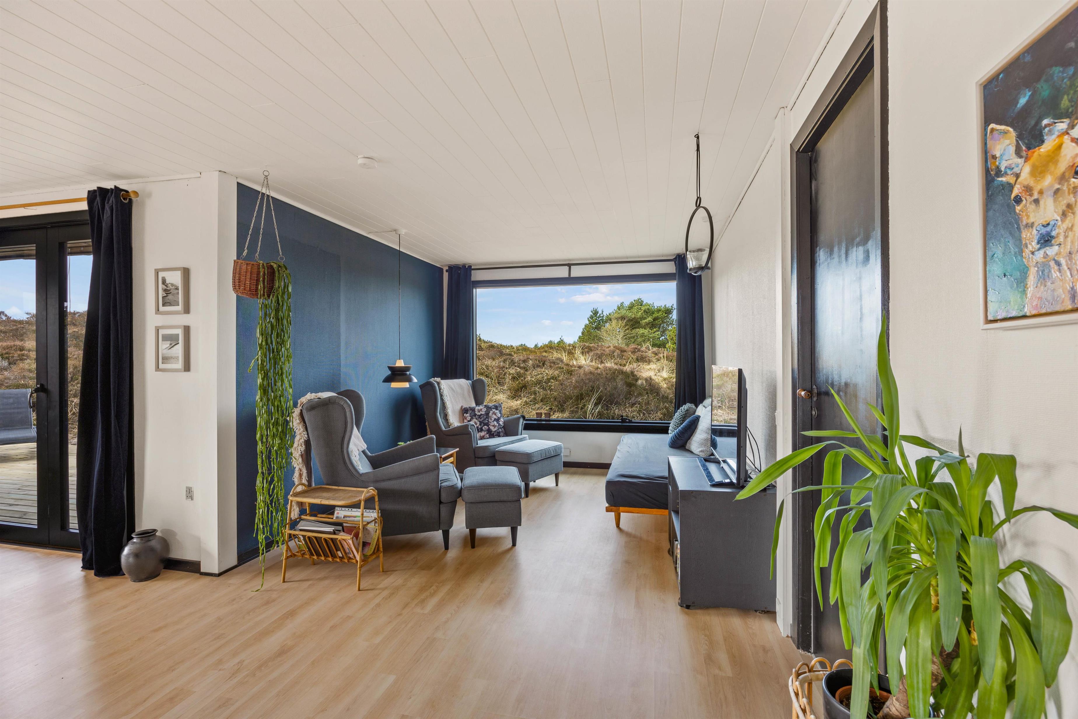 Fra stuen kan I nyde udsigten over den omkringliggende natur, når I ikke er ude i den. Får I brug for at slappe af midt på dagen, er der en separat afdeling med en daybed og et par gode lænestole.