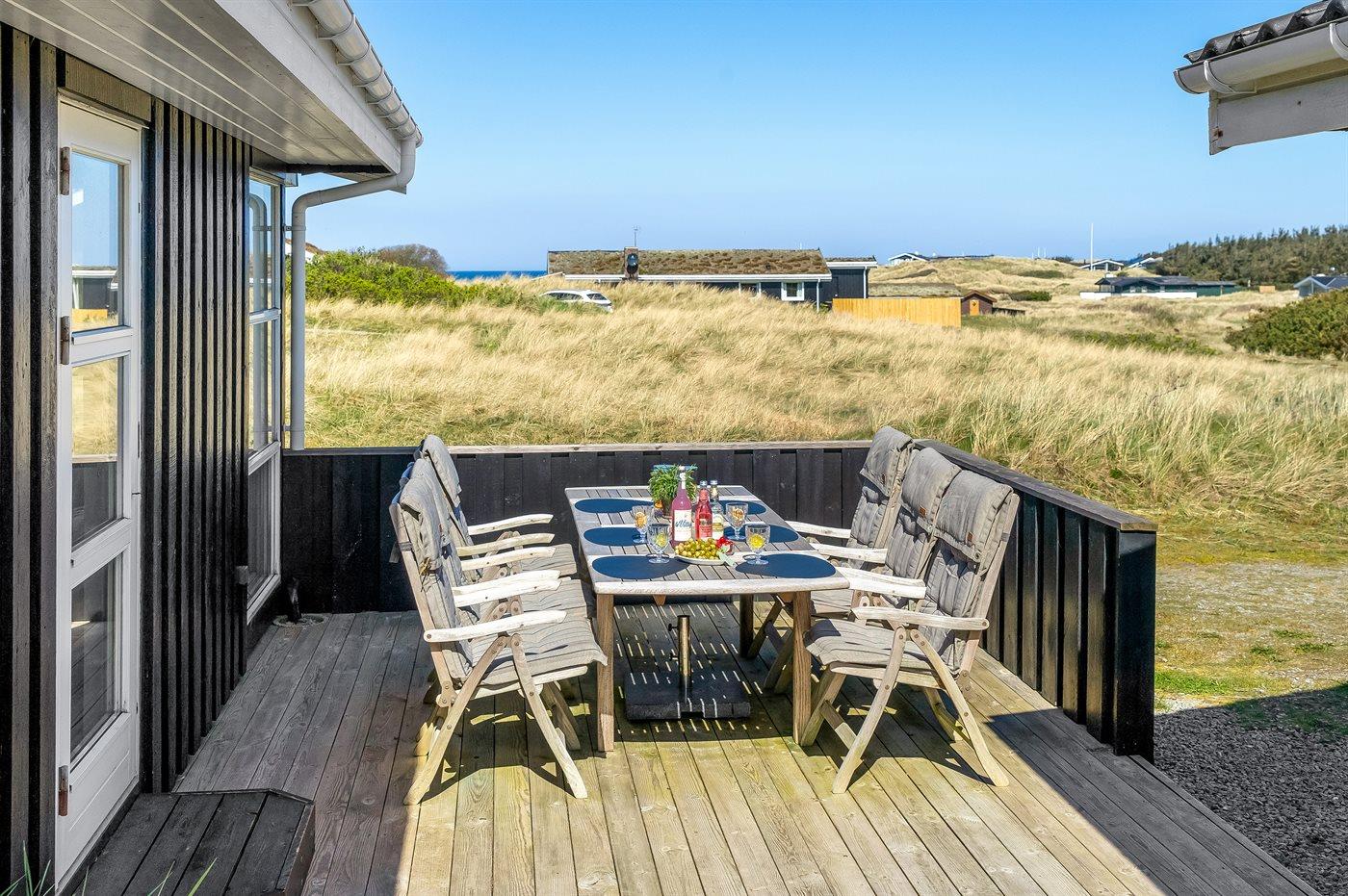 På en stærkt kuperet klitgrund i det naturskønne ferieområde Grønhøj ligger dette herlige sommerhus med udsigtsstue, hvor der er kig til Vesterhavet. Fra bænken på toppen af grunden kan man sidde og nyde udsigten og solnedgangen over havet.