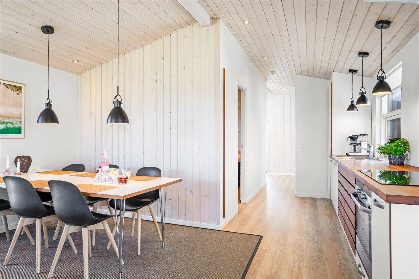 Køkkenet er udstyret med 1 køleskab. Der er 4 keramiske kogeplader, varmluftovn, mikrobølgeovn samt opvaskemaskine.