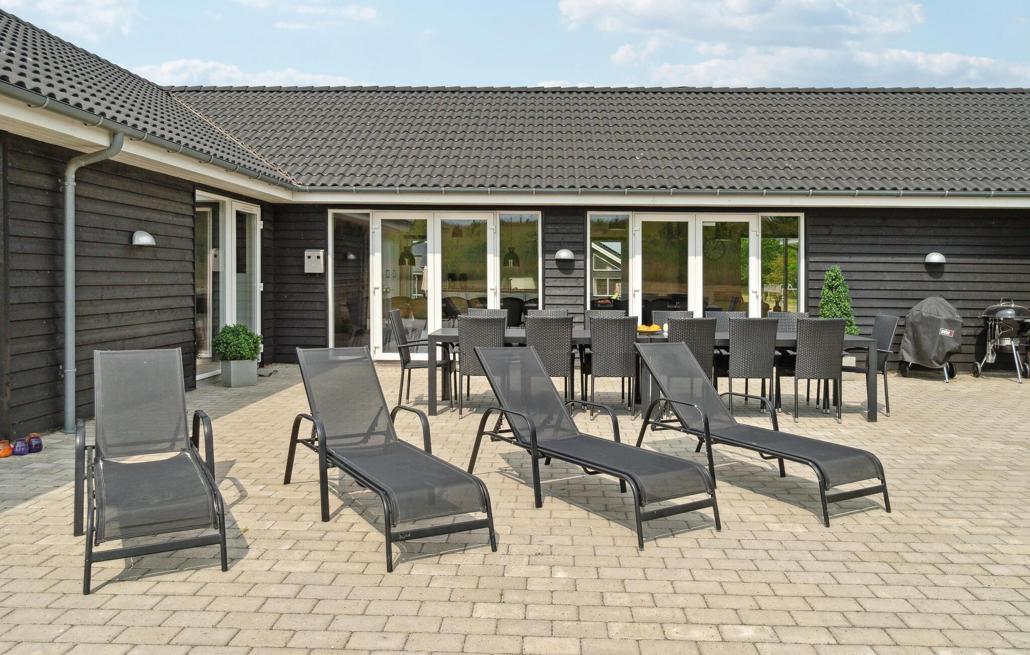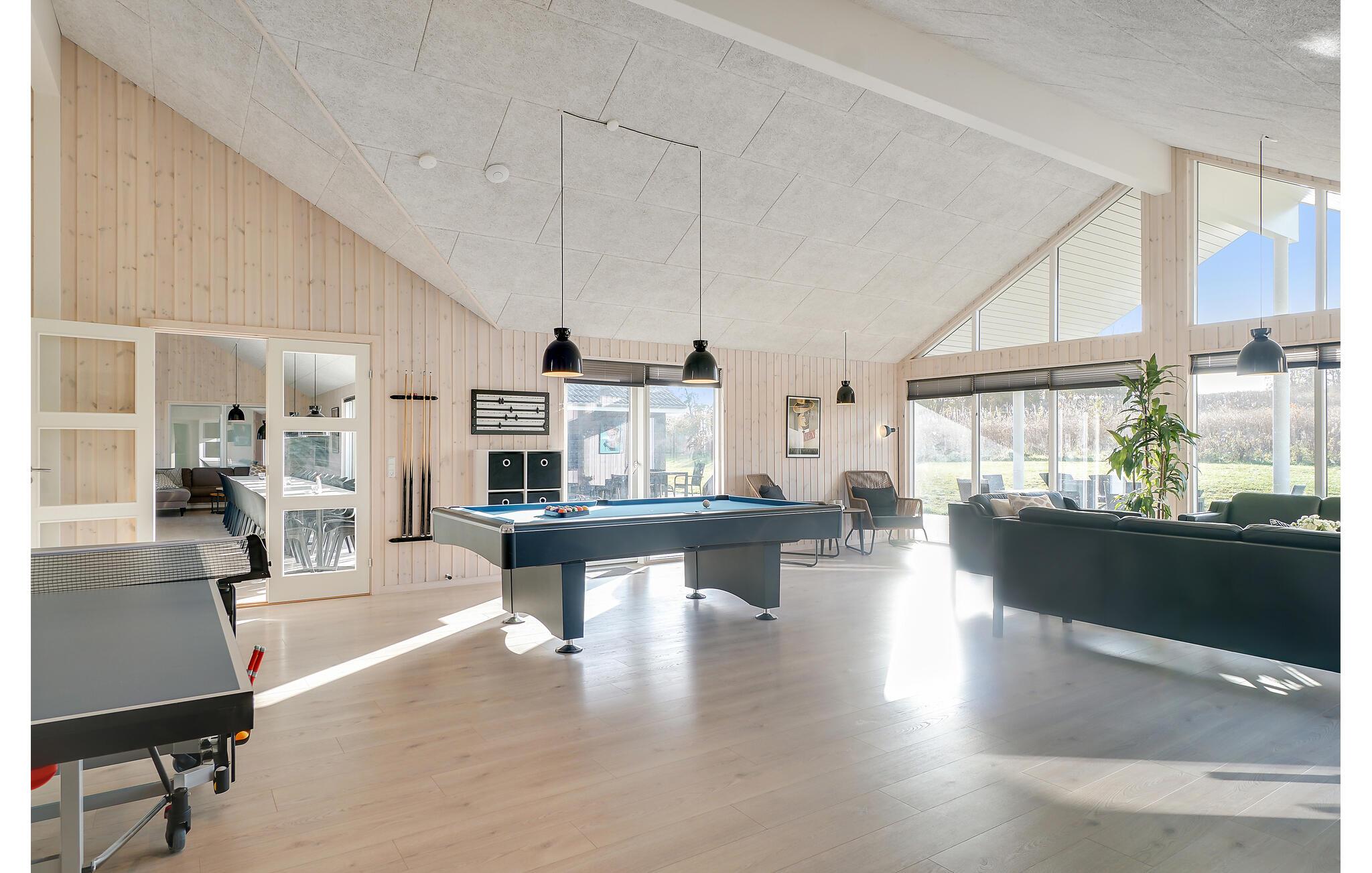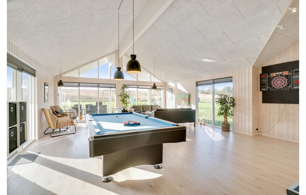 Dette skønne sommerhus byder velkommen syd for Grenaa. Her er plads til op til flere familier og en række gennemtænkte faciliteter giver de bedste vilkår for en behagelig og hyggelig ferie. Spil Playstation eller udfordr hinanden til et spil pool eller bordfodbold. Husets hovedattraktion er den smukke pool med modstrømssystem og vandrutsjebane til mange timers badesjov. Drag fordel af det rummelige, moderne køkken, mens I laver mad, og nyd feriemåltiderne i en hyggelig atmosfære om aftenen. Der er også plads udenfor til at lege og spille bold. Når vejret er godt, kan I tilbringe hyggelige timer på terrassen og lave en lækker grillmiddag, mens børnene hygger sig på trampolinen eller i legetårnet.