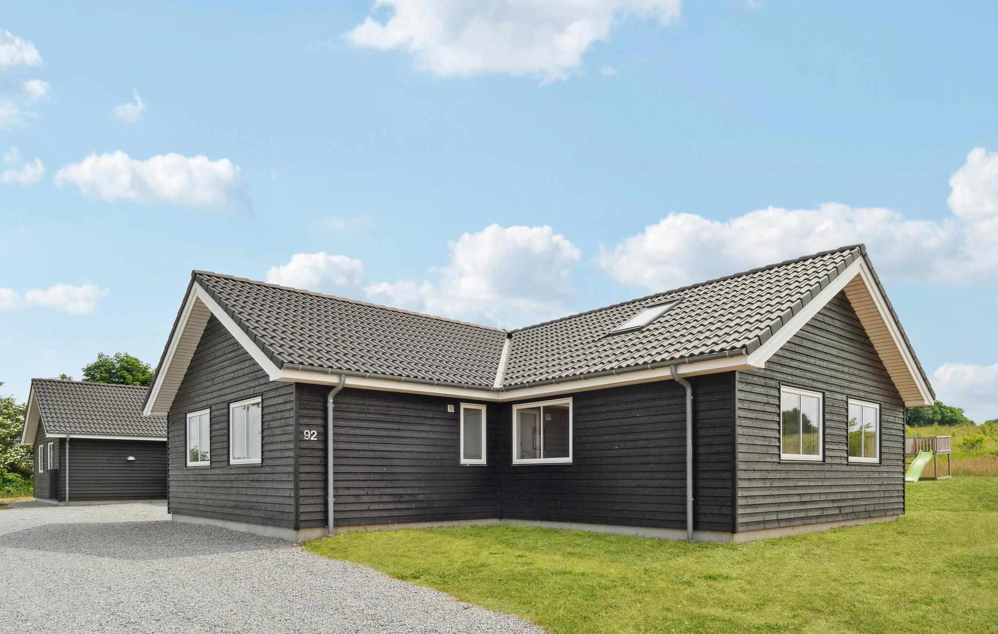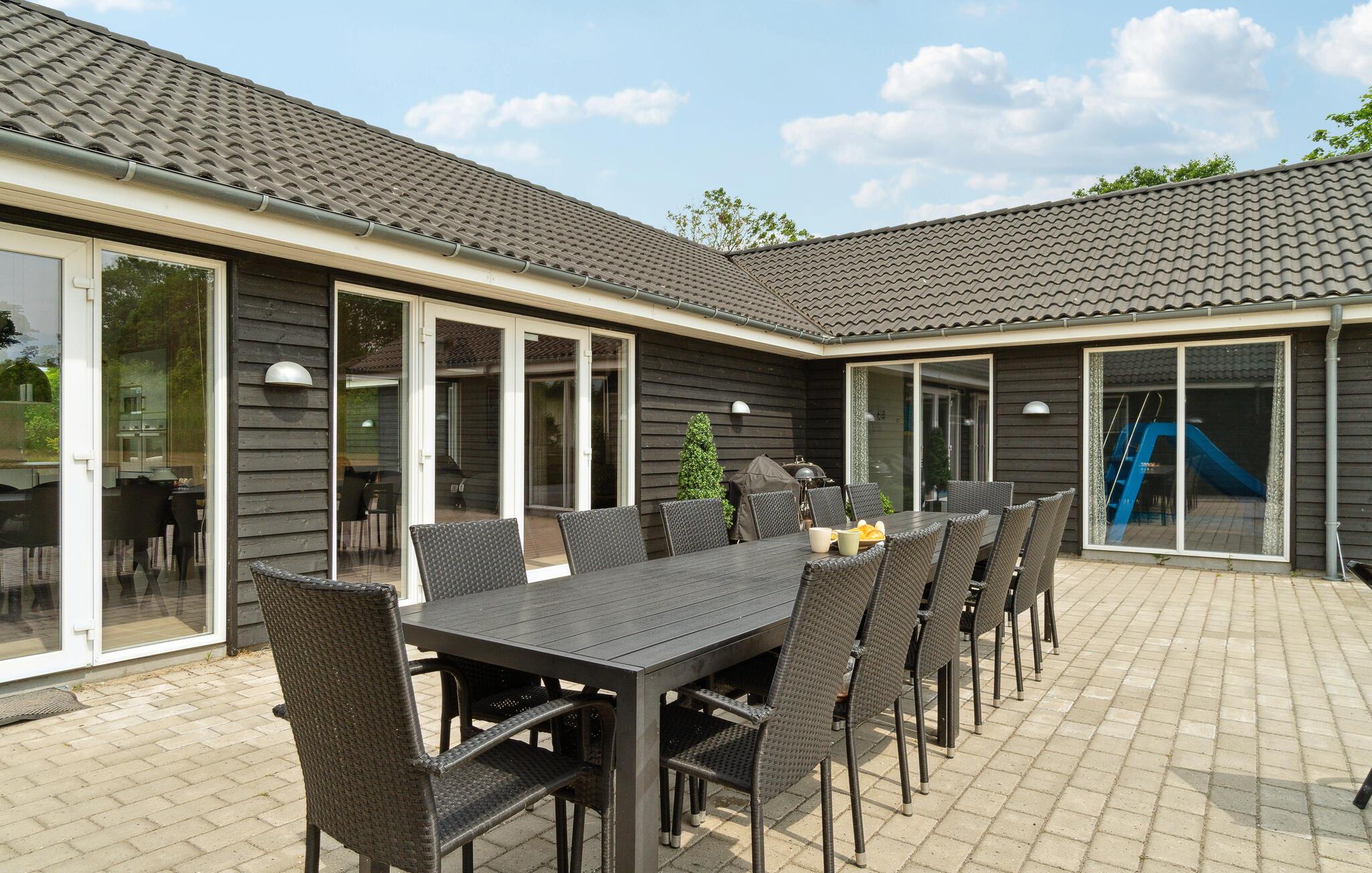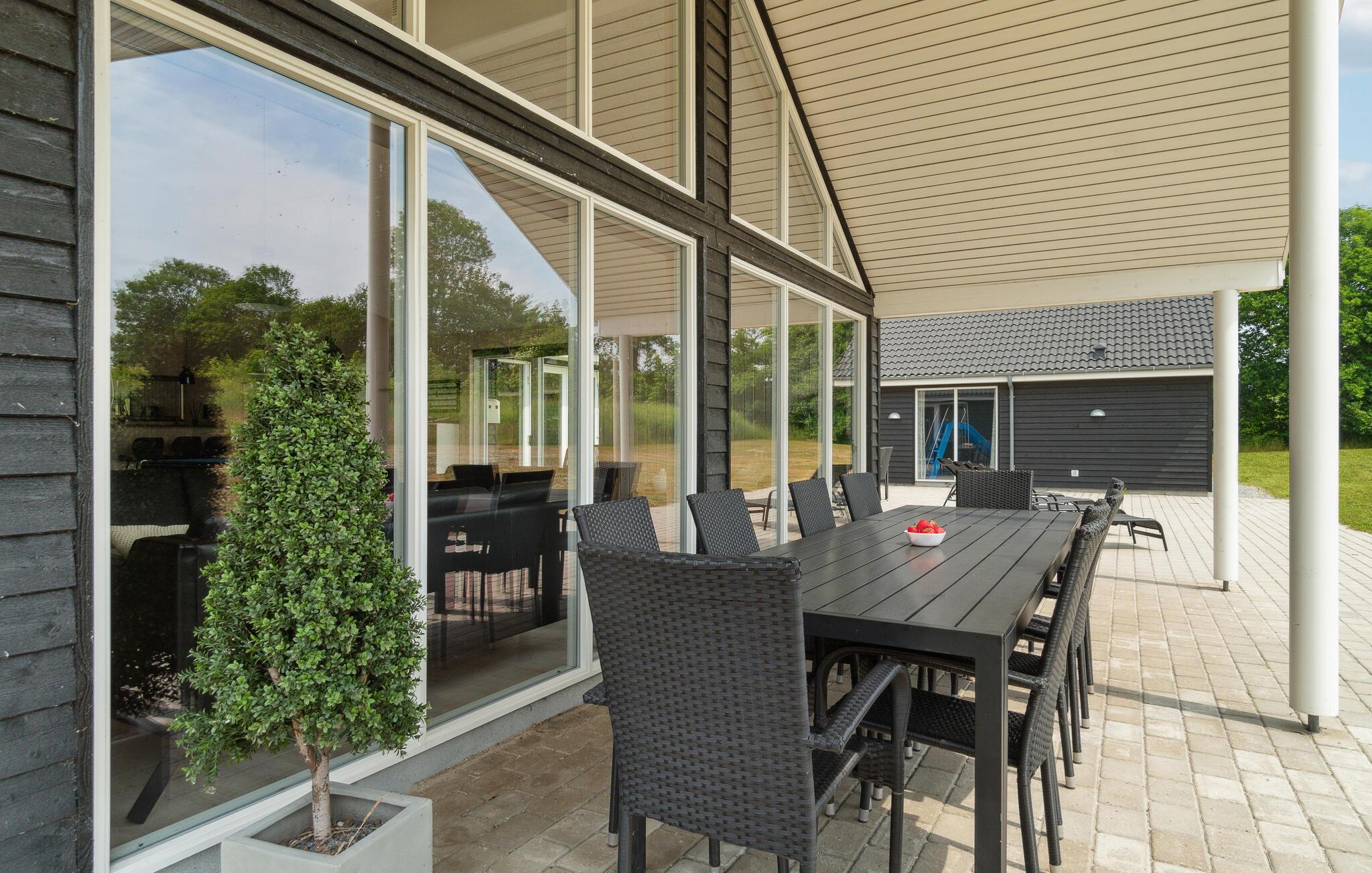 Dette skønne sommerhus byder velkommen syd for Grenaa. Her er plads til op til flere familier og en række gennemtænkte faciliteter giver de bedste vilkår for en behagelig og hyggelig ferie. Spil Playstation eller udfordr hinanden til et spil pool eller bordfodbold. Husets hovedattraktion er den smukke pool med modstrømssystem og vandrutsjebane til mange timers badesjov. Drag fordel af det rummelige, moderne køkken, mens I laver mad, og nyd feriemåltiderne i en hyggelig atmosfære om aftenen. Der er også plads udenfor til at lege og spille bold. Når vejret er godt, kan I tilbringe hyggelige timer på terrassen og lave en lækker grillmiddag, mens børnene hygger sig på trampolinen eller i legetårnet.