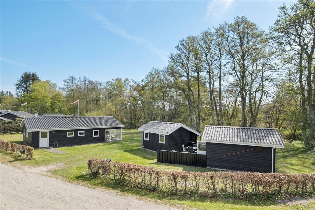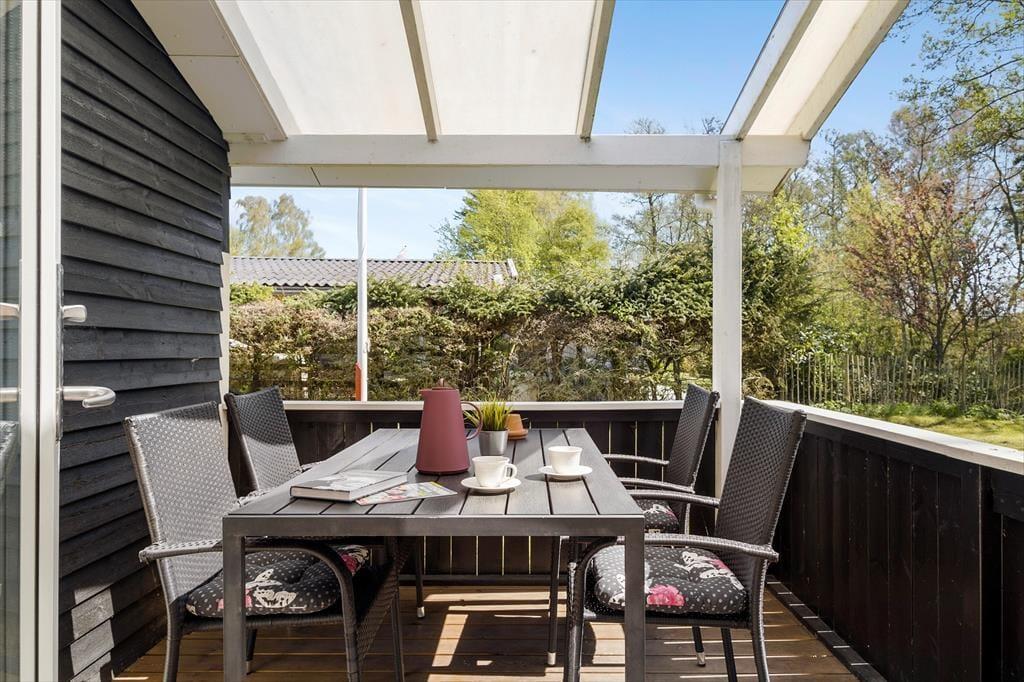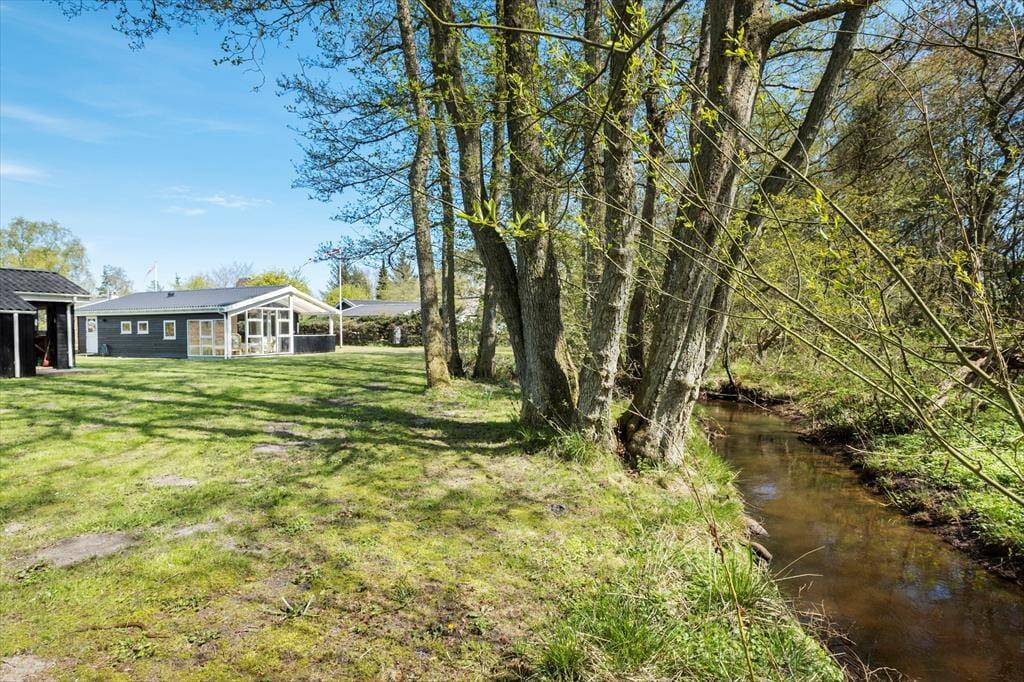 Grunden er enkelt anlagt med græsplæne og en bøgehæk ud mod vejen, og et lille vandløb løber forbi baghaven. Trænger I til at slappe af i en god havestol, er der terrasse ved både annekset og sommerhuset. Sidstnævnte terrasse er både overdækket og aflukket med hegn, og den ligger på smart vis i forlængelse af udestuen.