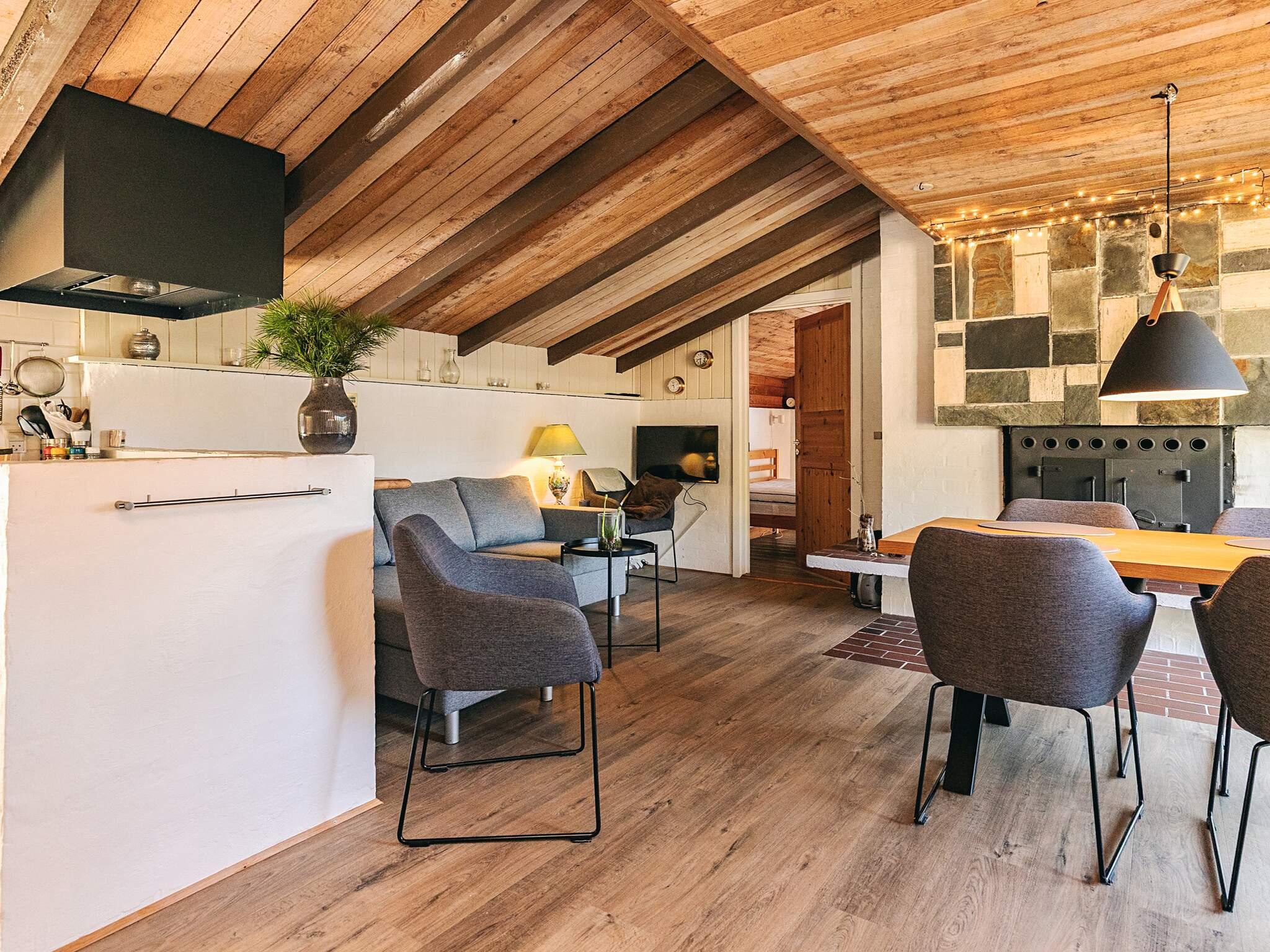 Køkkenet er åbent ud til opholdsrummet, hvilket byder op til det social skal fortsætte, selvom madlavningen går i gang. Opholdsrummet består af en fælles stue/spisestue, med plads til 6 personer ved spisebordet og i sofaarrangementet. I opholdstuen finder man også en pejs som kan tændes op i kolde tider.