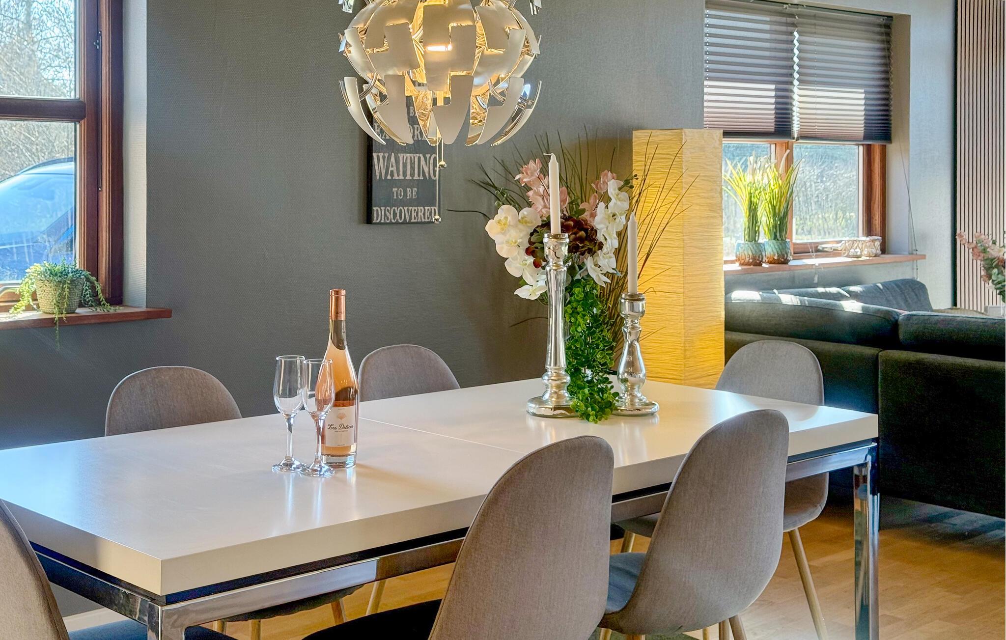 Der er lagt op til nogle forrygende feriedage i dette skønne hus, som emmer af komfort og er udstyret med de herligste faciliteter. Boligens stilfulde indretning, rummelige værelser og den solrige terrasse skaber de optimale rammer til en ferie, hvor I kun skal tænke på at slappe af og have det rart. Træd ind i den lyse stue med højt til loftet og store vinduespartier. Sæt jer til rette i den komfortable sofa og lad blikket vandre over de grønne omgivelser. Brændeovnen bidrager med hyggelig varme på kølige dage. Der er plads til alle rundt om det store spisebord, og det åbne køkken er udstyret med kvalitetsløsninger, så her bliver madlavningen nemt til en hyggestund.
