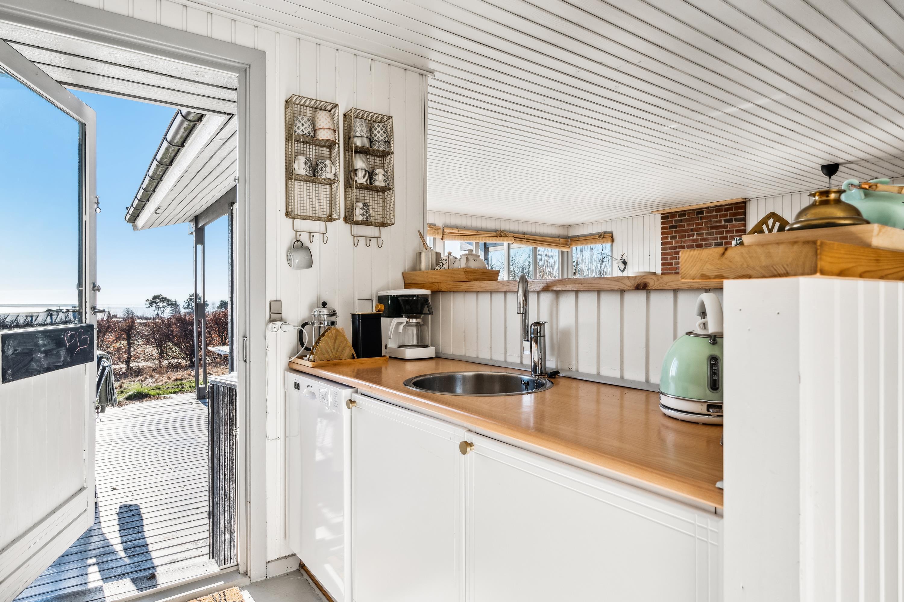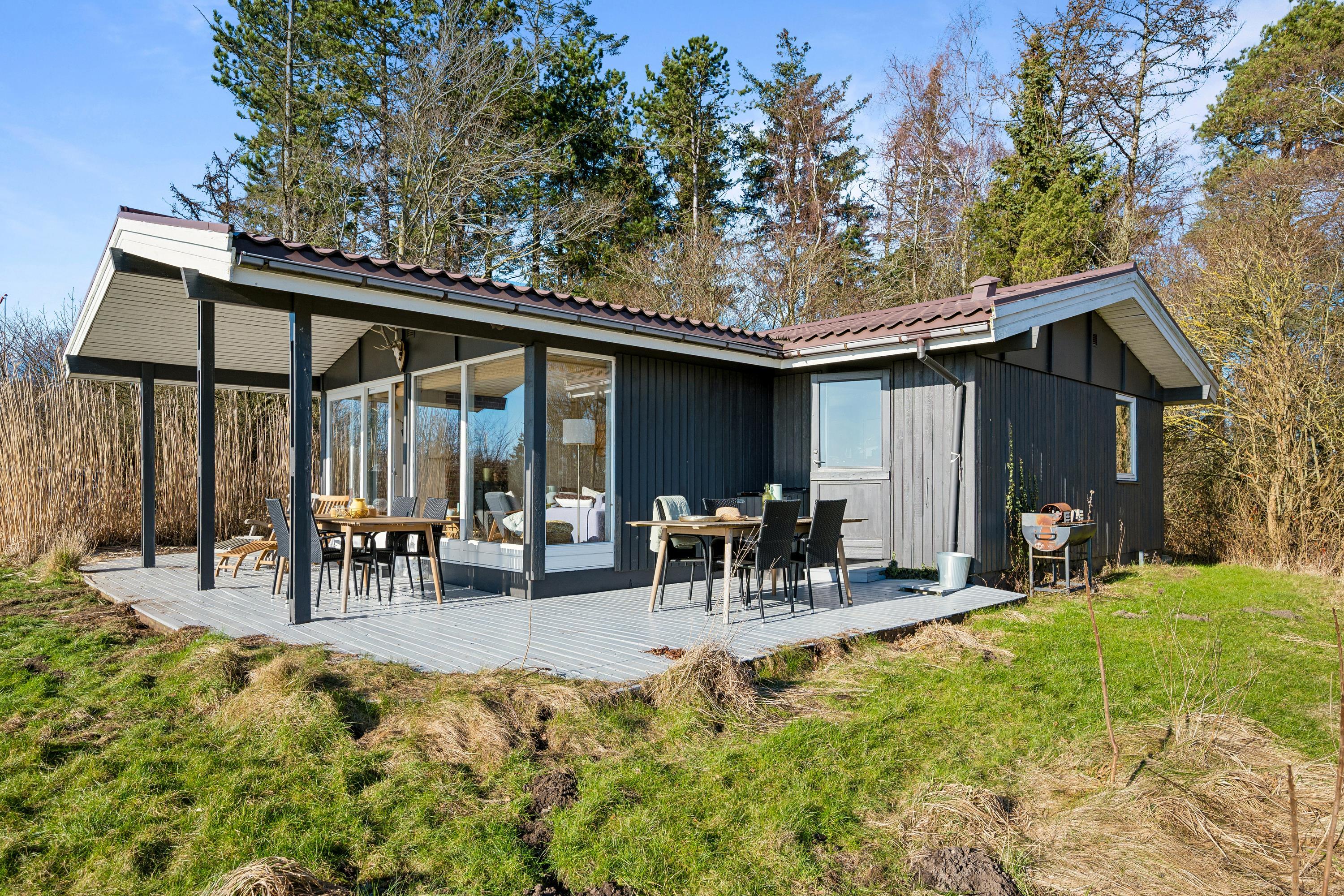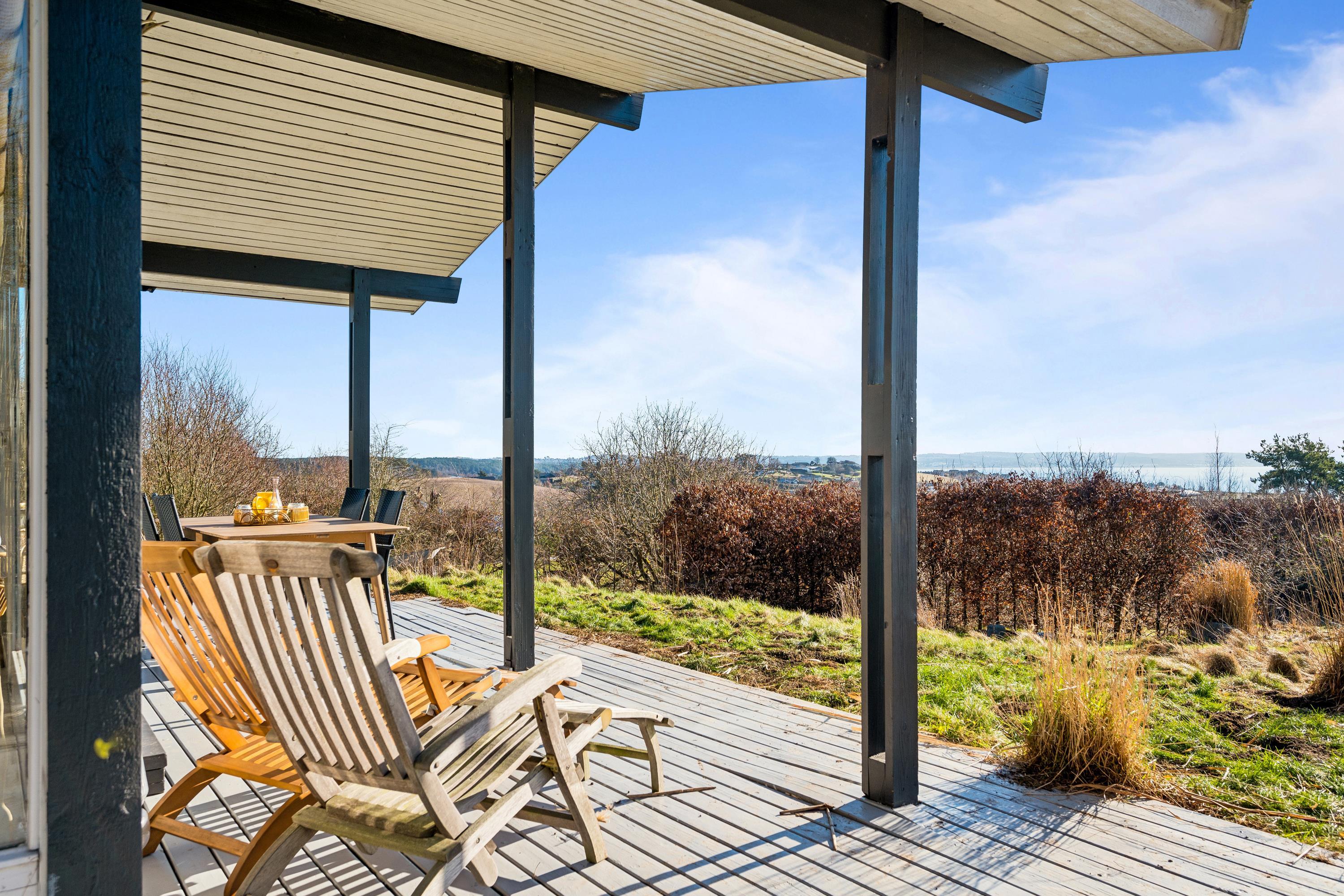 Højt beliggende på en skøn naturgrund finder man dette hyggelige feriehus. Huset indeholder en hyggelig og velmøbleret stue med brændeovn. Herfra er der udgang til en skøn overdækket terrasse med havemøbler og hvorfra har man en fantastisk udsigt over vandet ved Handrup strand. I forbindelse med stuen finder man det mindre, men funktionelle køkken med b.la. opvaskemaskine og hvorfra er der udgang til endnu en terrasse. Hvad er skønnere end at siden udendørs med sin morgenkaffe og nyde havudsigten. Husets sovepladser fordeler sig i tre værelser, heraf et værelse med en dobbeltseng, et værelse med to enkeltsenge og et værelse med køjesenge. Pænt badeværelse med bruseniche, gulvvarme og vaskemaskine. Tv foregår via Chromecast og internet. Husets dybfryser står lige udenfor døren ved køkkenet på terrassen. Har man mod på at sove udendørs, så er der et dejligt stort shelter til rådighed. Huset er beliggende på en skrående naturgrund hvor græsset gror vildt, men er slået de steder hvor der er behov for det. B.la er der lavet en sti til det hyggelige shelter og til bål stedet.