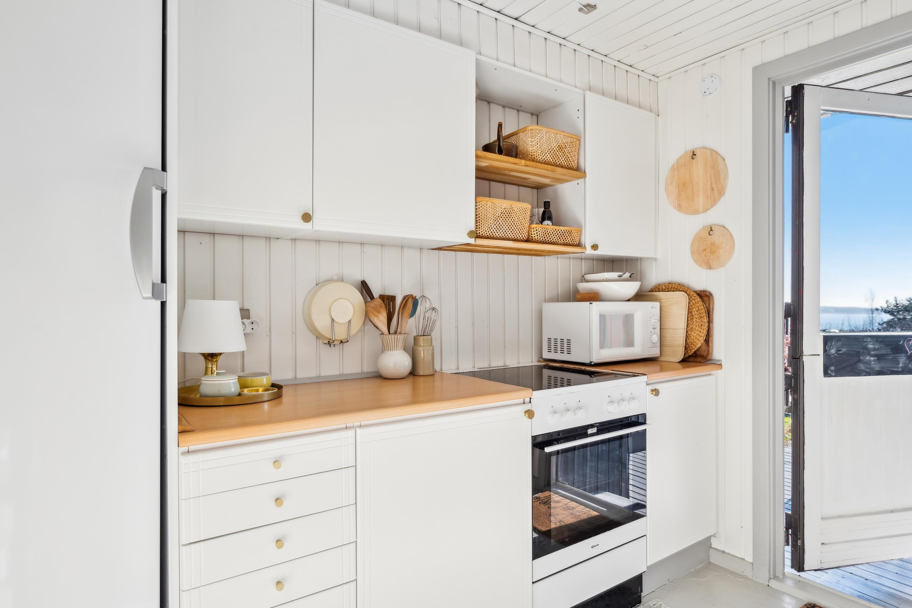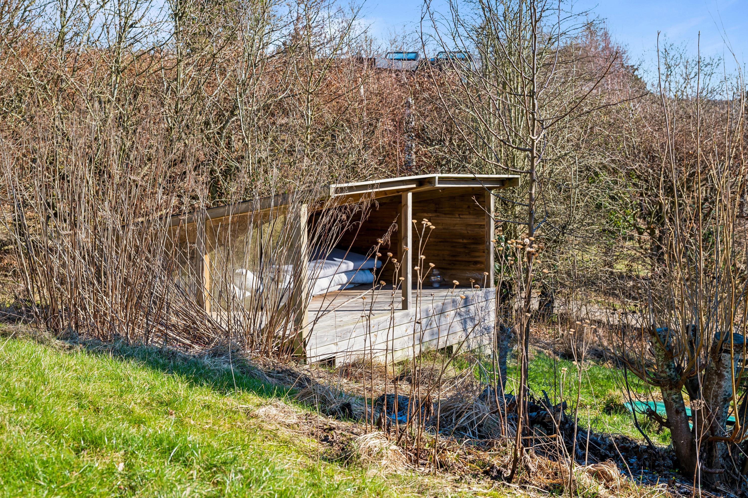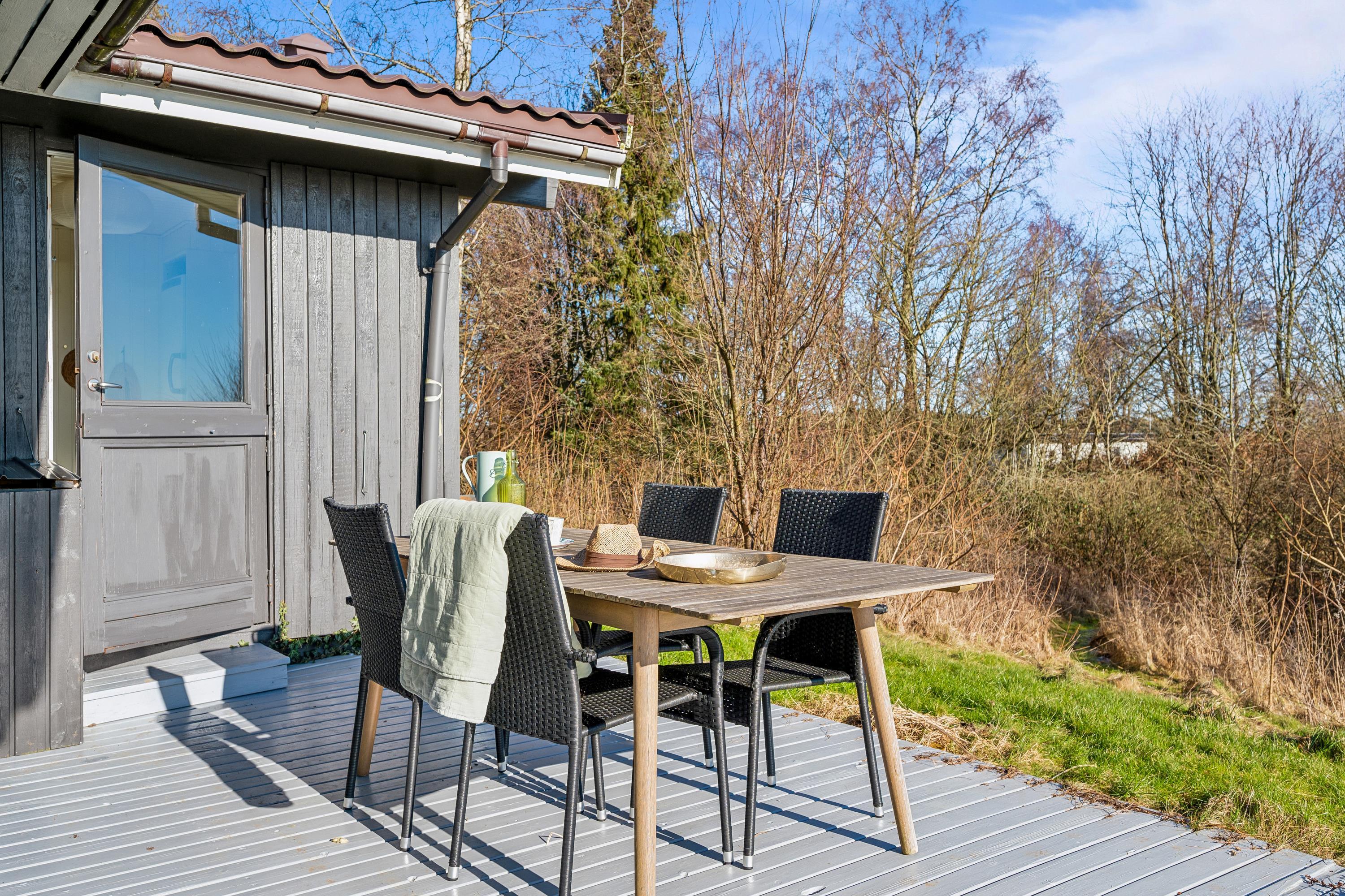 Højt beliggende på en skøn naturgrund finder man dette hyggelige feriehus. Huset indeholder en hyggelig og velmøbleret stue med brændeovn. Herfra er der udgang til en skøn overdækket terrasse med havemøbler og hvorfra har man en fantastisk udsigt over vandet ved Handrup strand. I forbindelse med stuen finder man det mindre, men funktionelle køkken med b.la. opvaskemaskine og hvorfra er der udgang til endnu en terrasse. Hvad er skønnere end at siden udendørs med sin morgenkaffe og nyde havudsigten. Husets sovepladser fordeler sig i tre værelser, heraf et værelse med en dobbeltseng, et værelse med to enkeltsenge og et værelse med køjesenge. Pænt badeværelse med bruseniche, gulvvarme og vaskemaskine. Tv foregår via Chromecast og internet. Husets dybfryser står lige udenfor døren ved køkkenet på terrassen. Har man mod på at sove udendørs, så er der et dejligt stort shelter til rådighed. Huset er beliggende på en skrående naturgrund hvor græsset gror vildt, men er slået de steder hvor der er behov for det. B.la er der lavet en sti til det hyggelige shelter og til bål stedet.