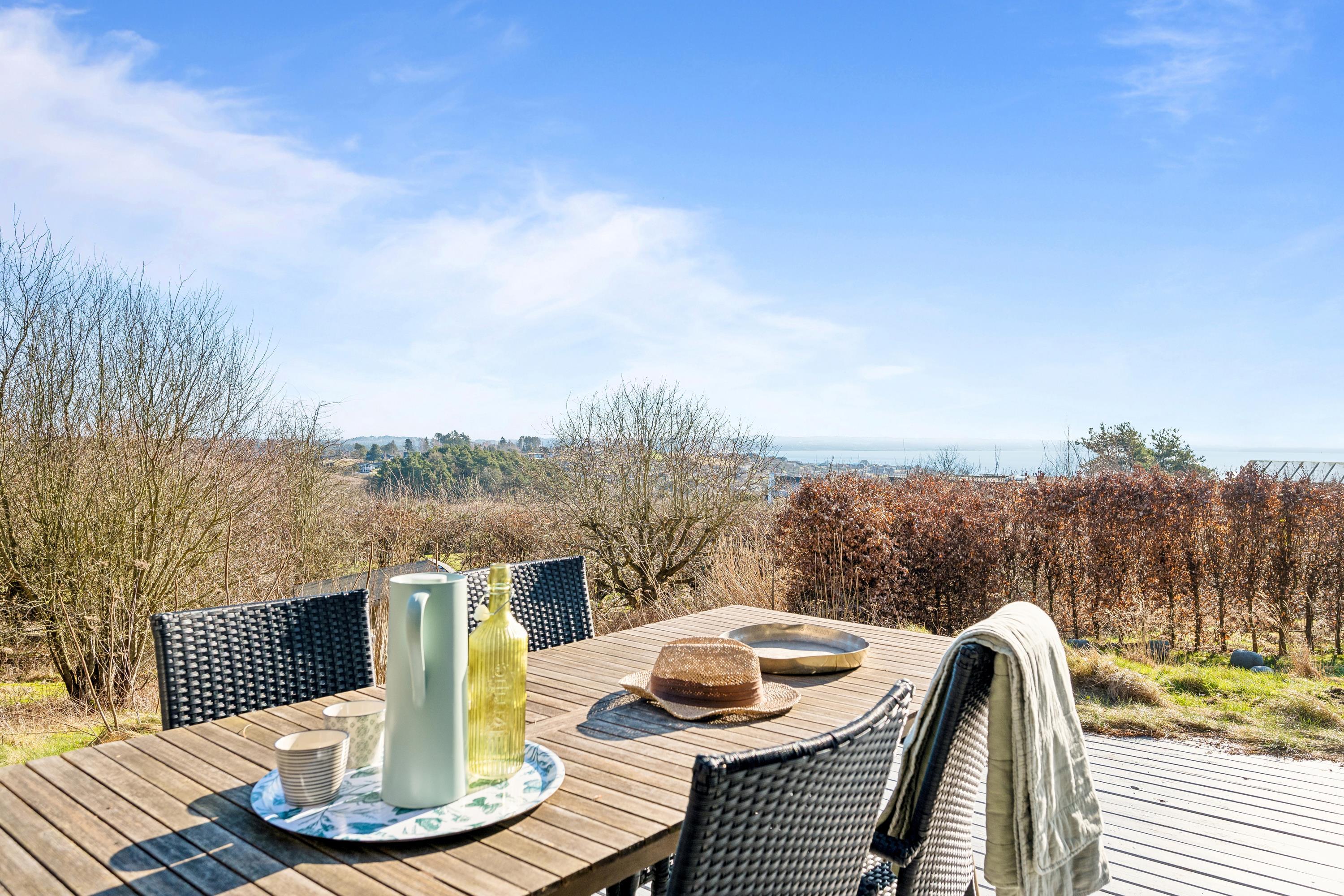 Hyggeligt feriehus i naturskønne omgivelser med havudsigt, brændeovn og shelter nær Handrup Strand.