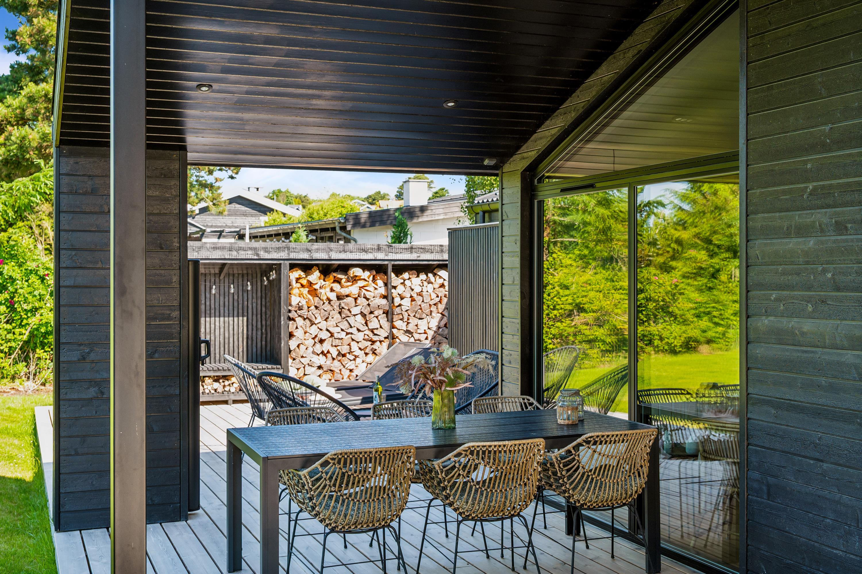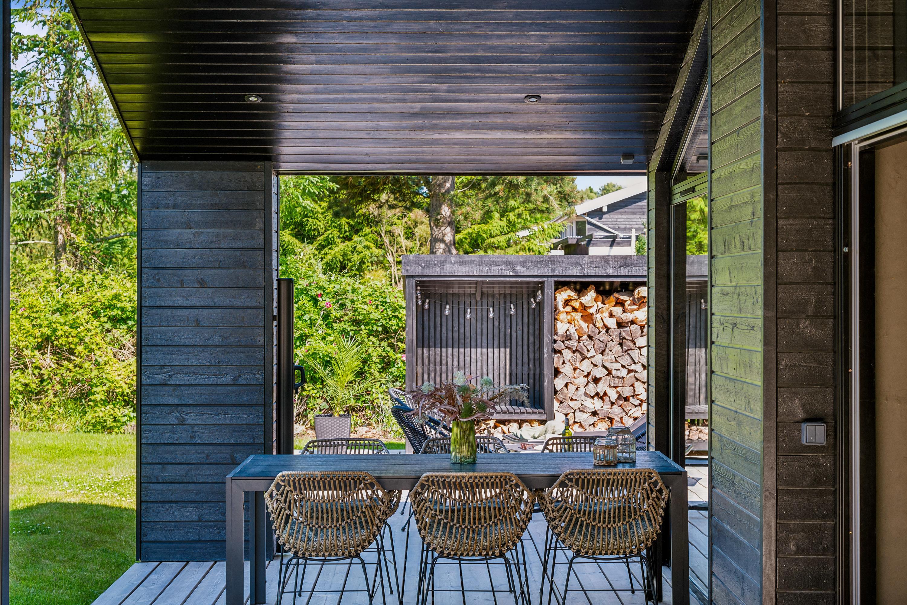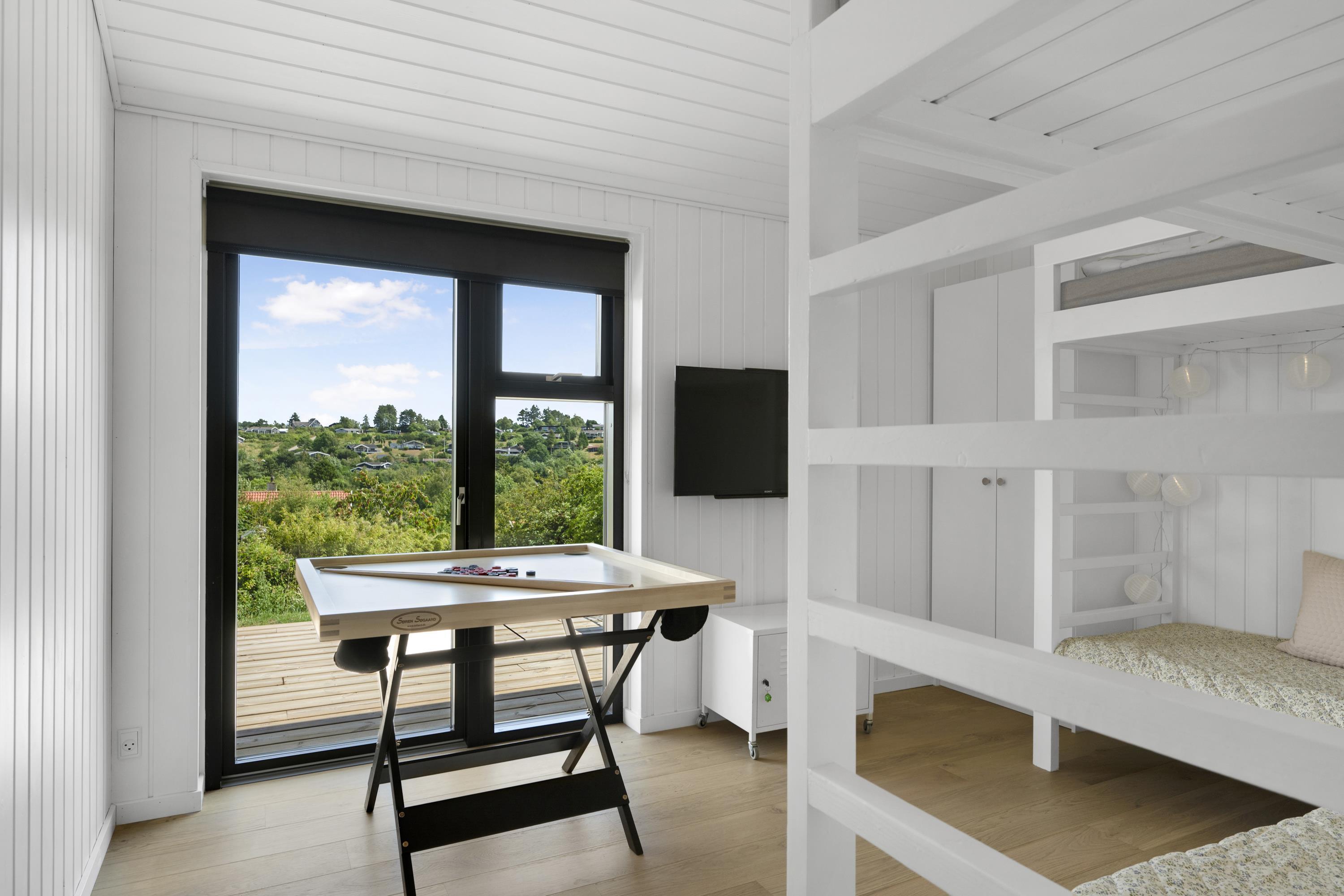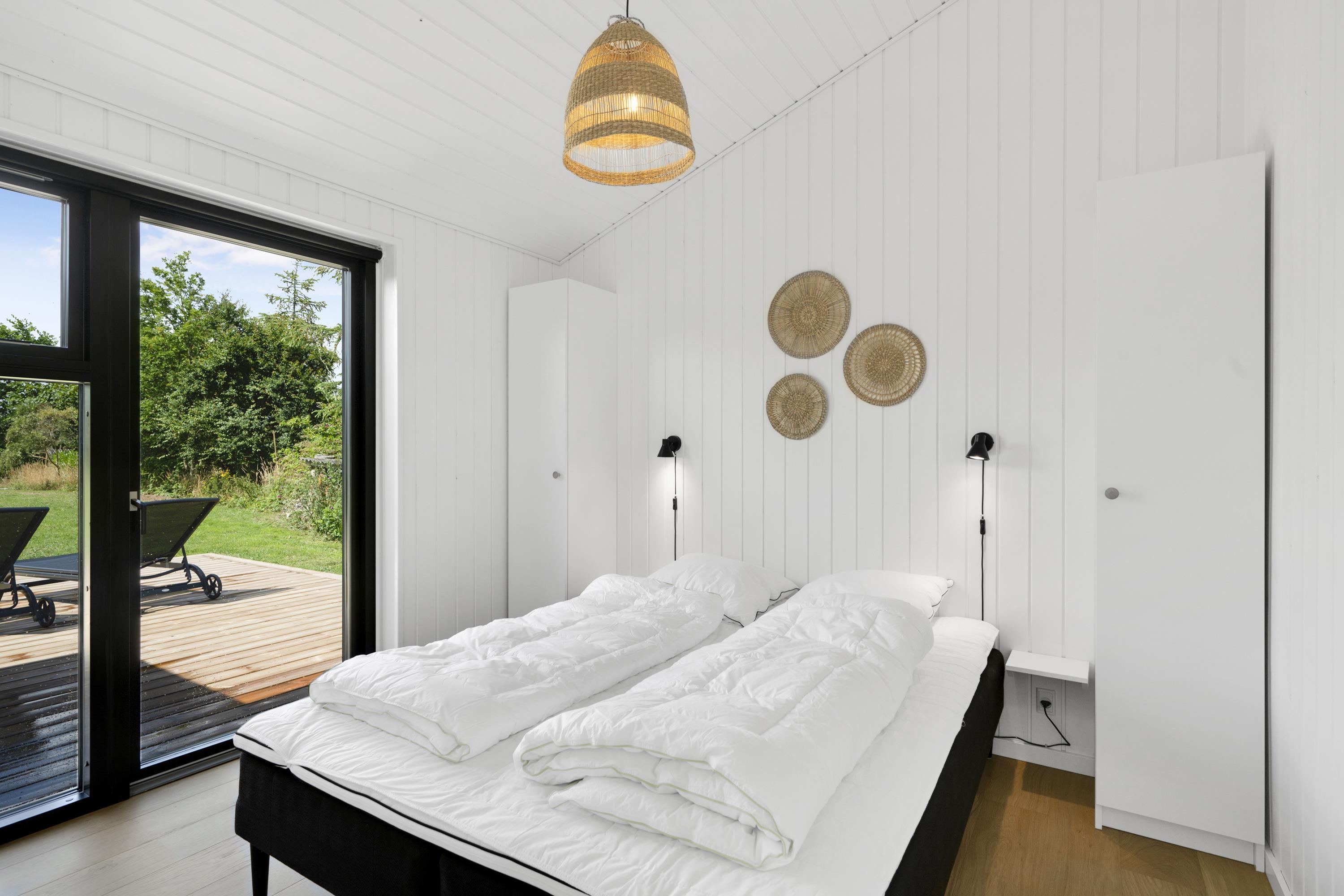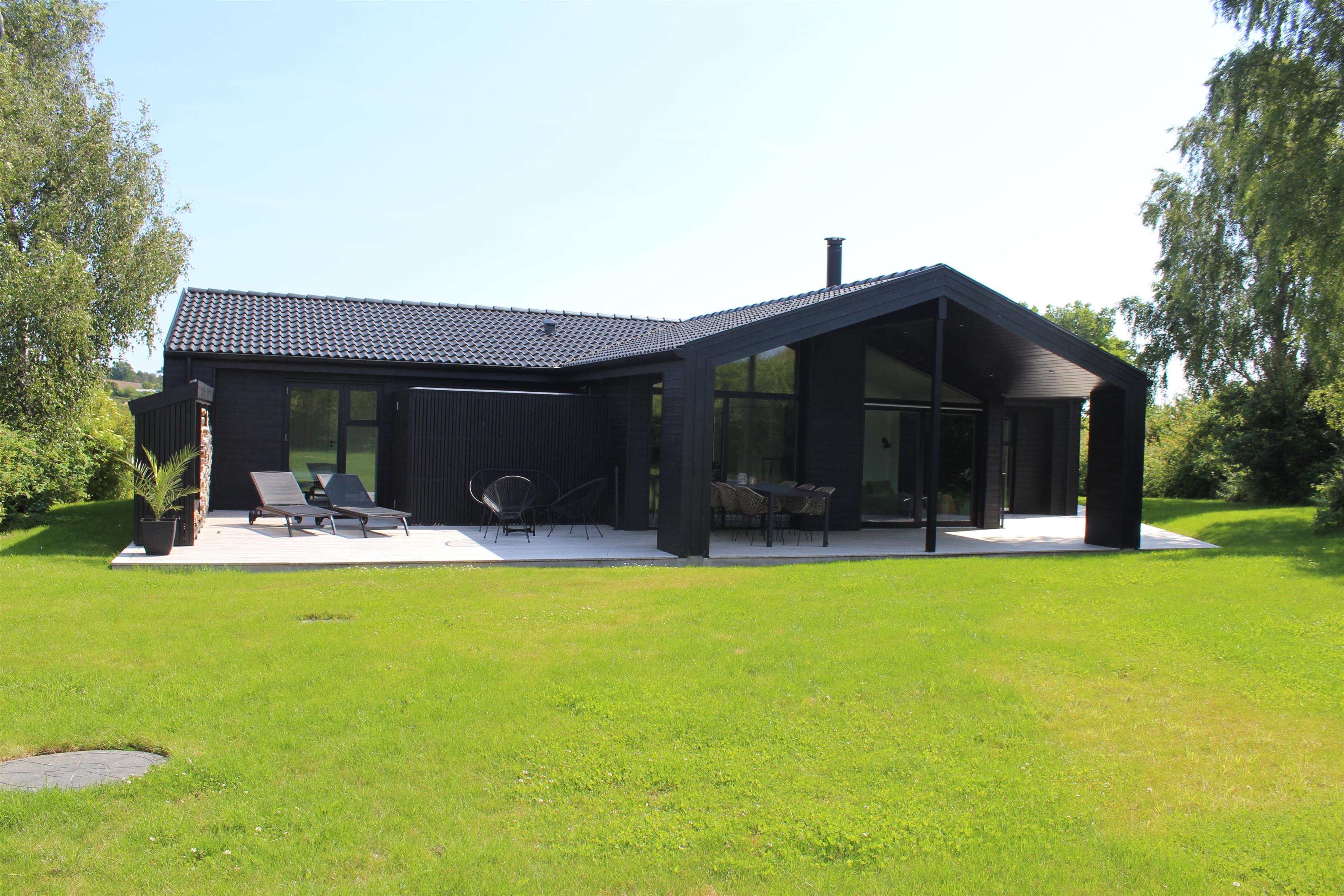 Mindre end 10 min kørsel fra Ebeltoft, finder man dette flotte nye hus. Huset indeholder en flot lys stue med spiseafdeling, hvorfra man har en virkelig smuk udsigt over det kuperede terræn i Handrup. TV' et har danske gratis kanaler og fungerer derudover med streaming fra egen device. Flot køkkenafdeling med b.la opvaskemaskine. Fire flotte soveværelser, heraf tre med dobbeltsenge og et værelse med en køjeseng. Køjeværelset fungerer også som et multirum med TV, Wii med diverse spil til og bobspil. Et hygge rum for børn, unge og hele familien. To skønne badeværelser med bruseniche - det ene har ene har adgang til udebruser. Der er vaskemaskine til rådighed. Hele huset er udstyret med gulvvarme. Udendørs er der store terrassearealer med havemøbler, liggestole og grill samt et fint shelter på grunden. Der er bålplads med pander og gryder så man kan laver mad over bålet. Blot få skridt fra huset finder man en lille bakketop med bænke, hvor man har panoramaudsigt over hele Ebeltoft Vig og udsigt til både Samsø og Tunø.