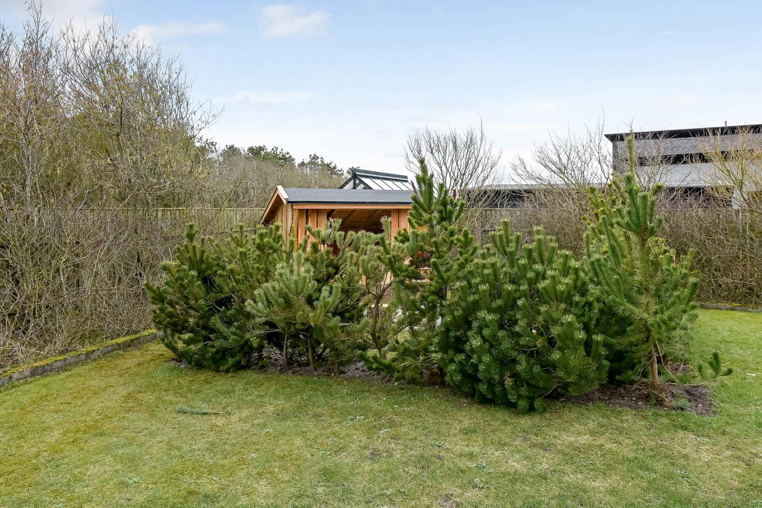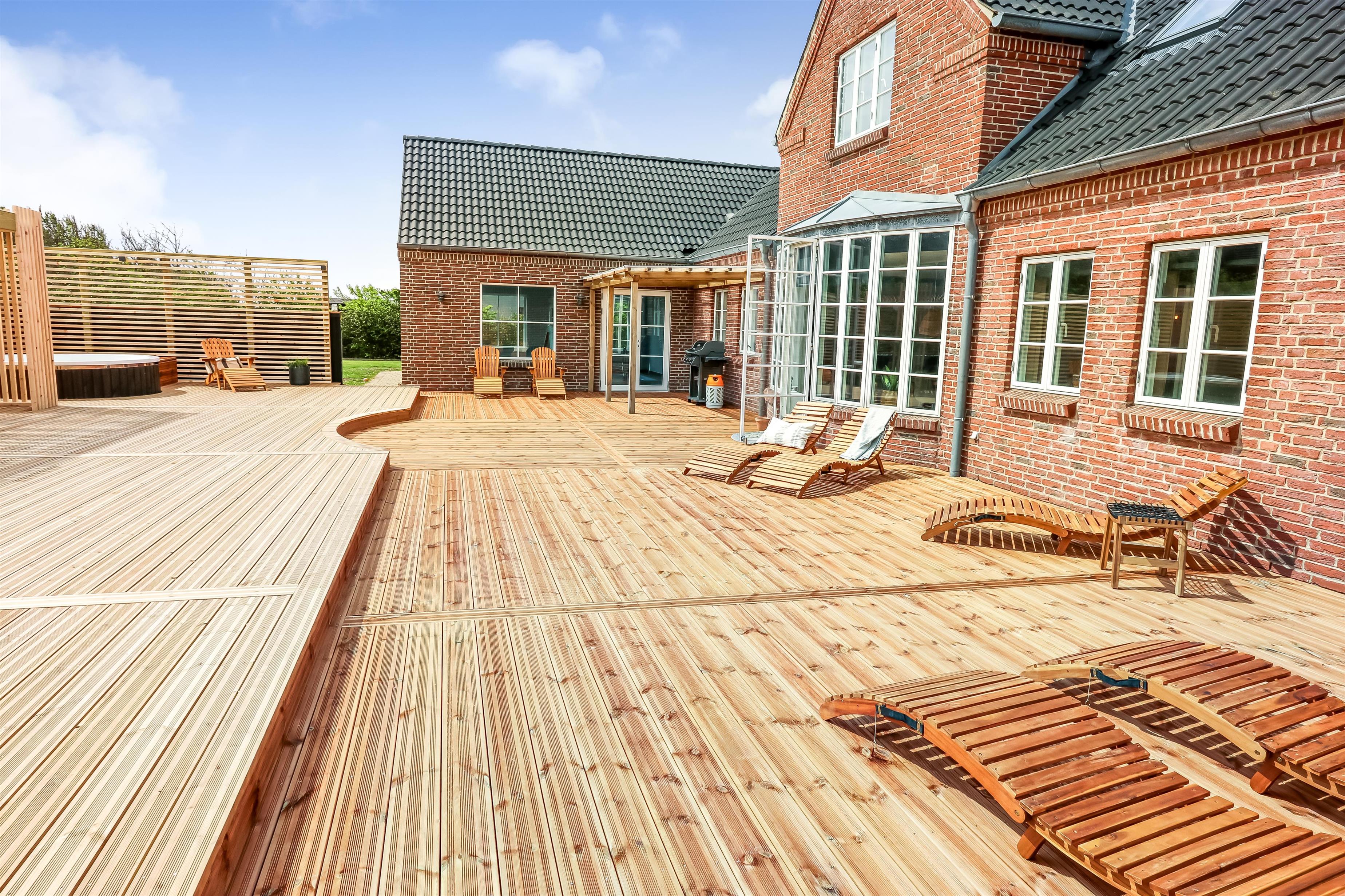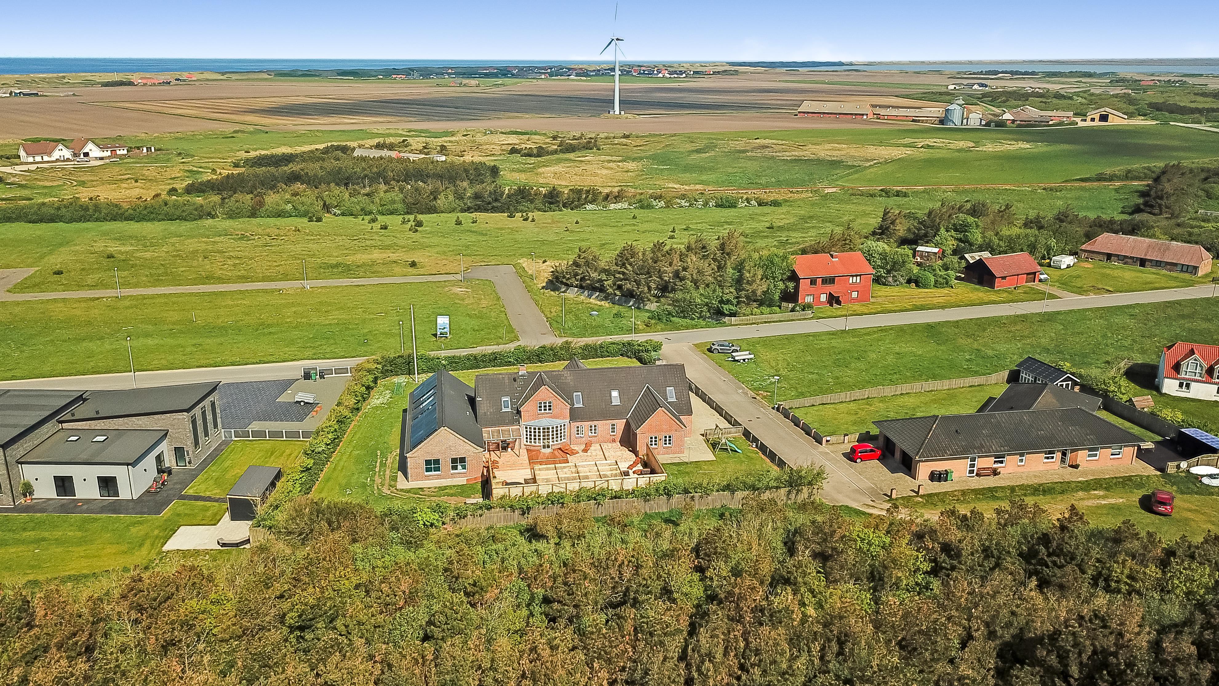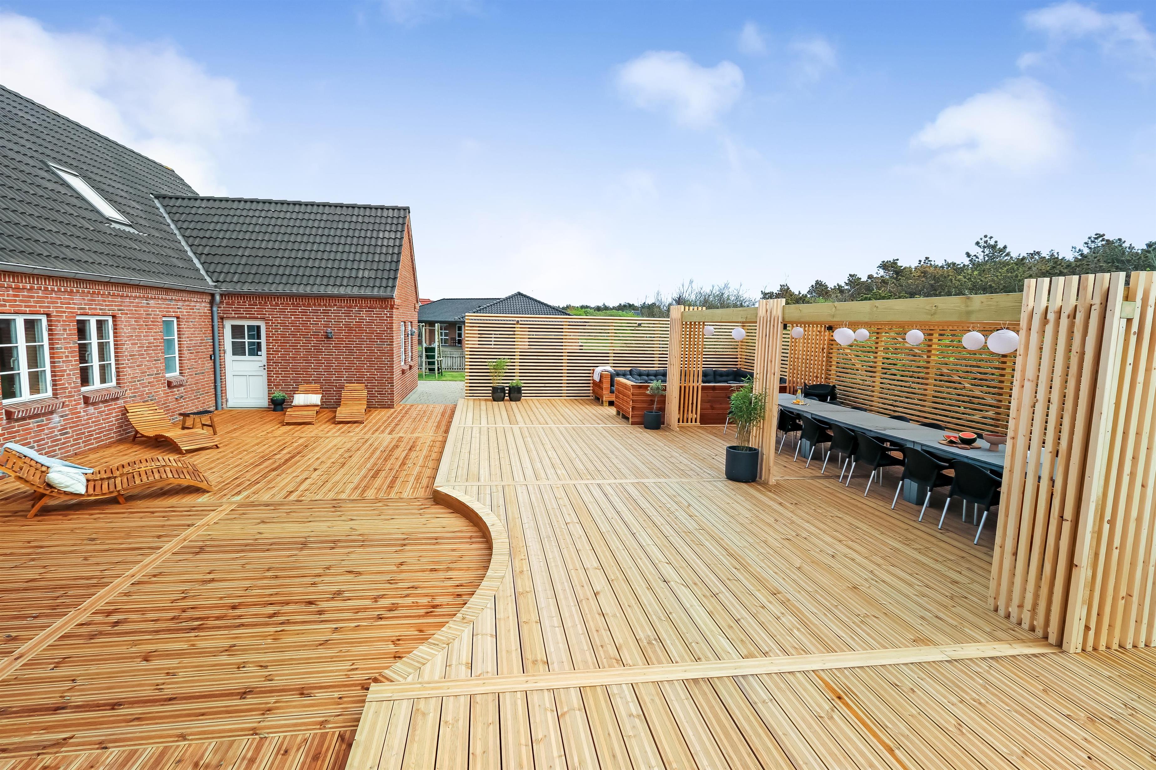 Centralt beliggende på en 100% indhegnet, velholdt grund tæt ved indkøb og spisemuligheder og kun 800 m fra Vesterhavet. Udearealerne er også et kapitel for sig. Store, velholdte terrasser med havemøbler. Bag huset er der et helt nyopført terrasseanlæg i træ, som skaber en "sydlandsk" stemning. Der er loungesæt, liggestole, pergola med stort havebord og stole, afdeling med udebruser og nedsænket spabad til 4-6 personer – det perfekte sted at nyde udendørs livet. Gasgrill forefindes.