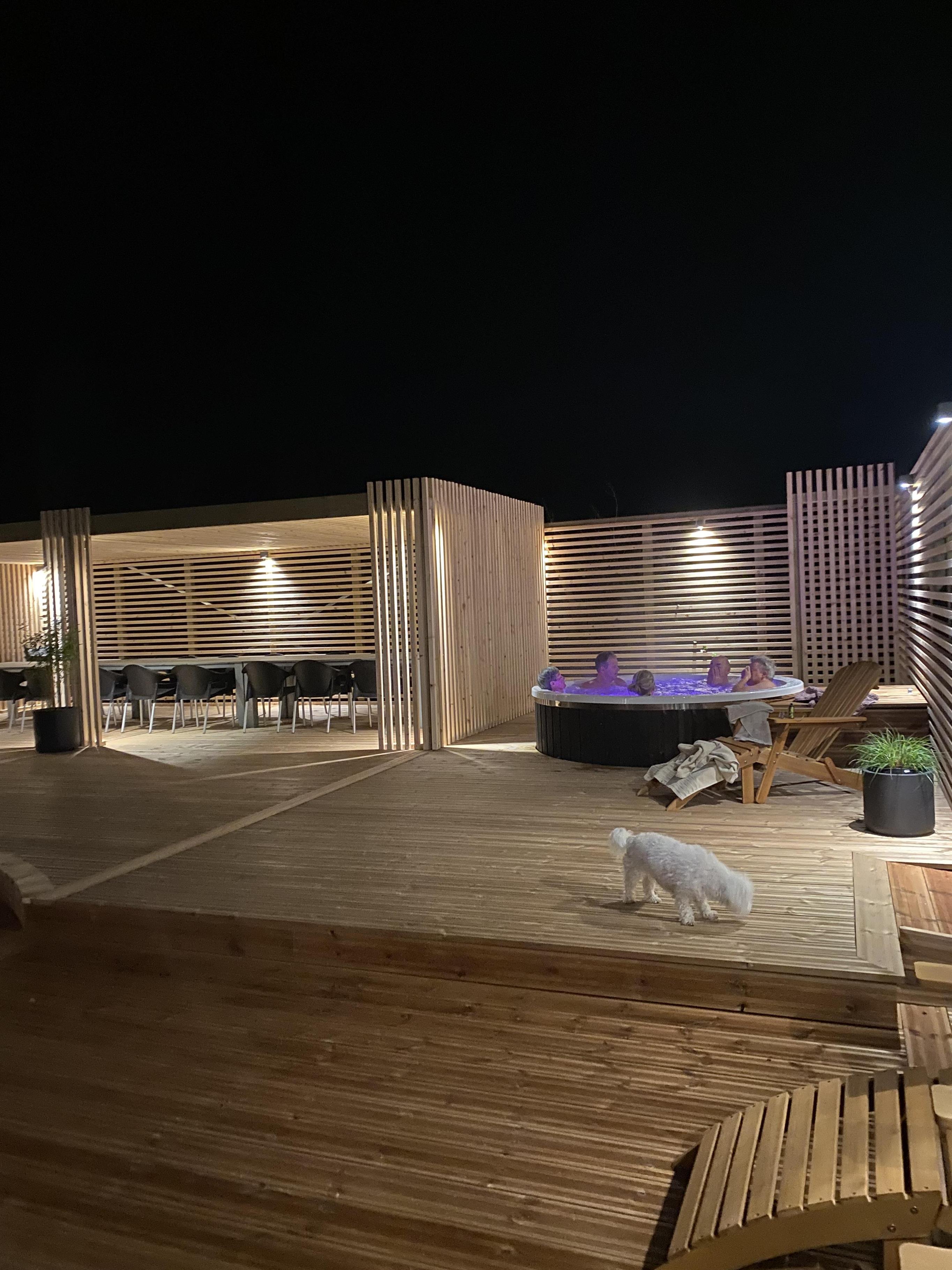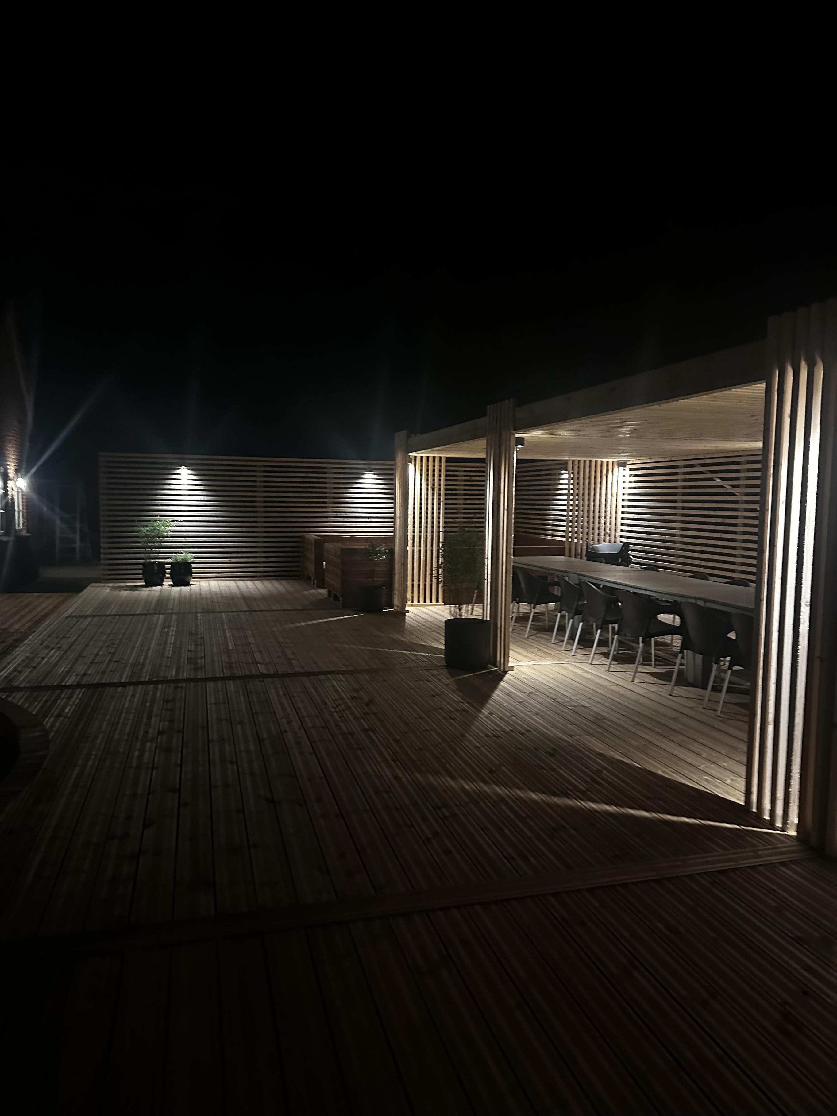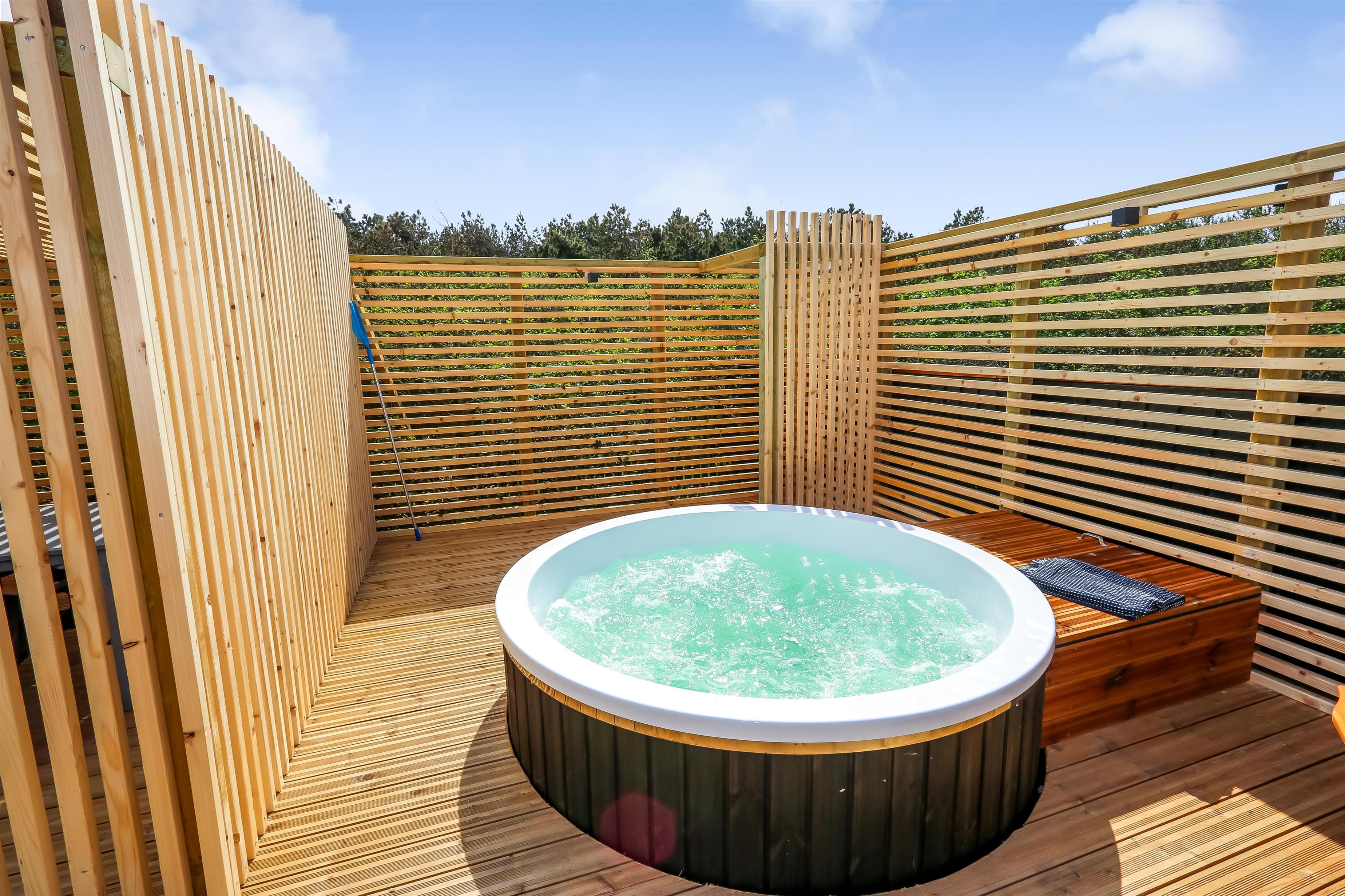 Centralt beliggende på en 100% indhegnet, velholdt grund tæt ved indkøb og spisemuligheder og kun 800 m fra Vesterhavet. Udearealerne er også et kapitel for sig. Store, velholdte terrasser med havemøbler. Bag huset er der et helt nyopført terrasseanlæg i træ, som skaber en "sydlandsk" stemning. Der er loungesæt, liggestole, pergola med stort havebord og stole, afdeling med udebruser og nedsænket spabad til 4-6 personer – det perfekte sted at nyde udendørs livet. Gasgrill forefindes.