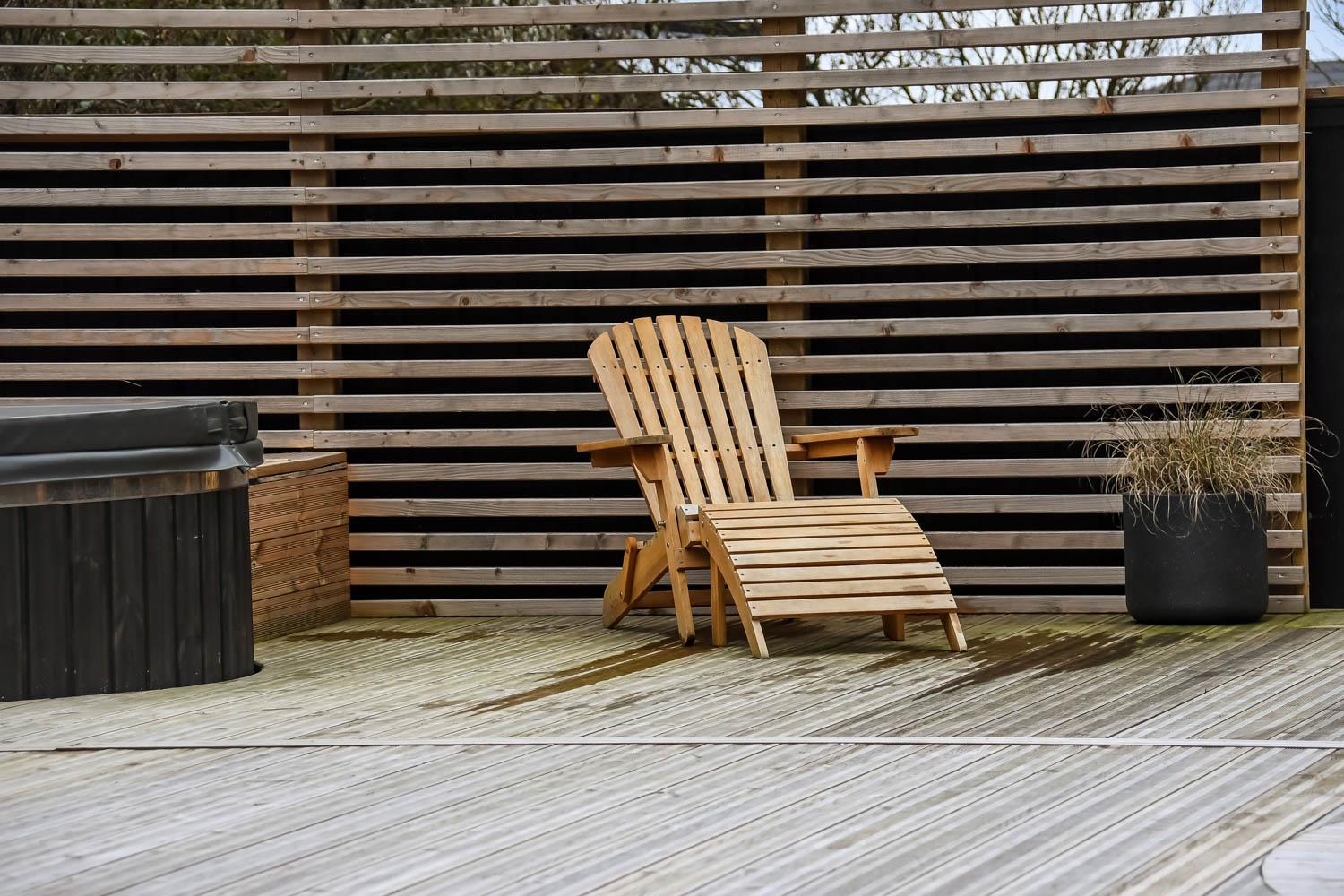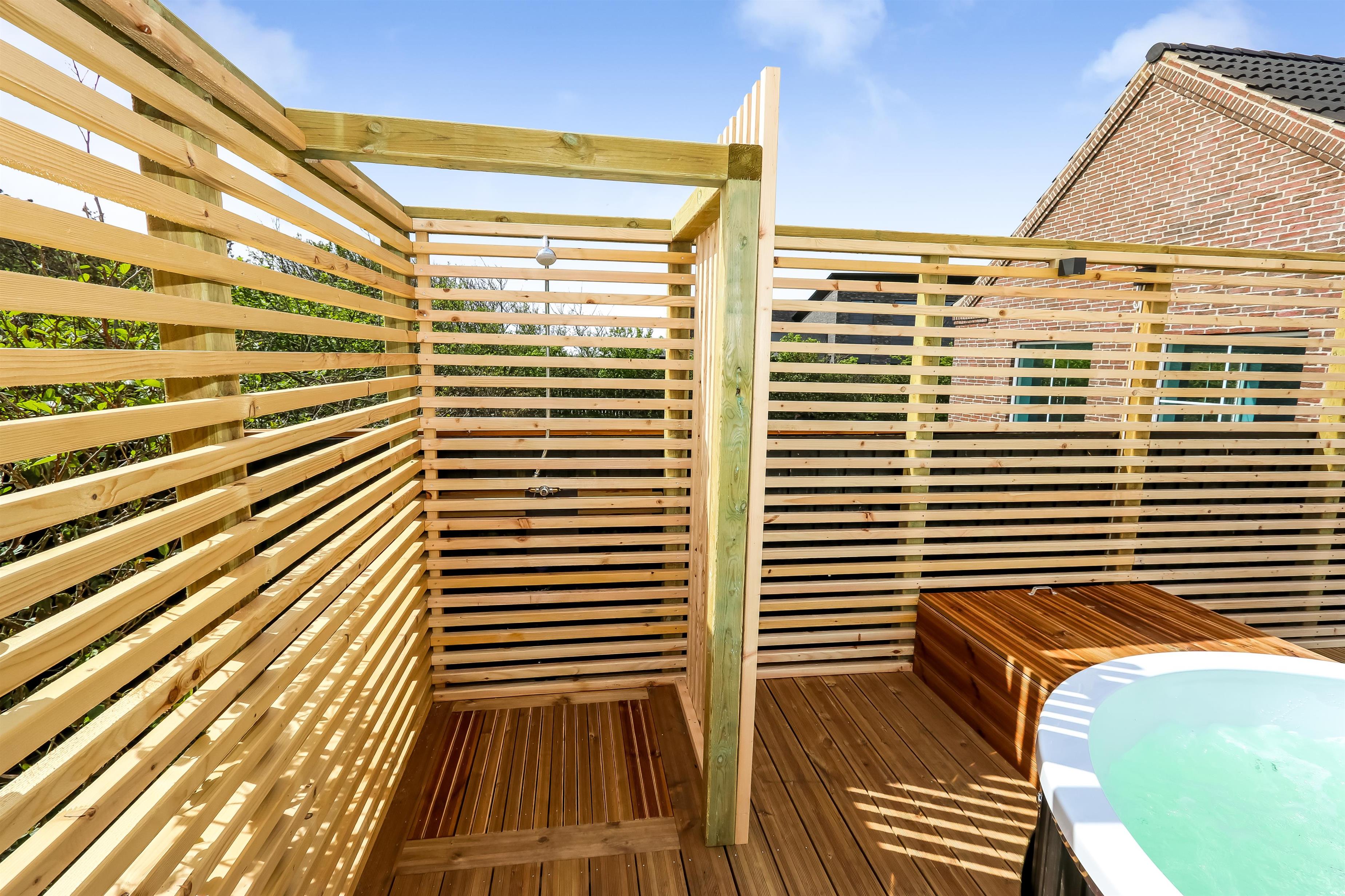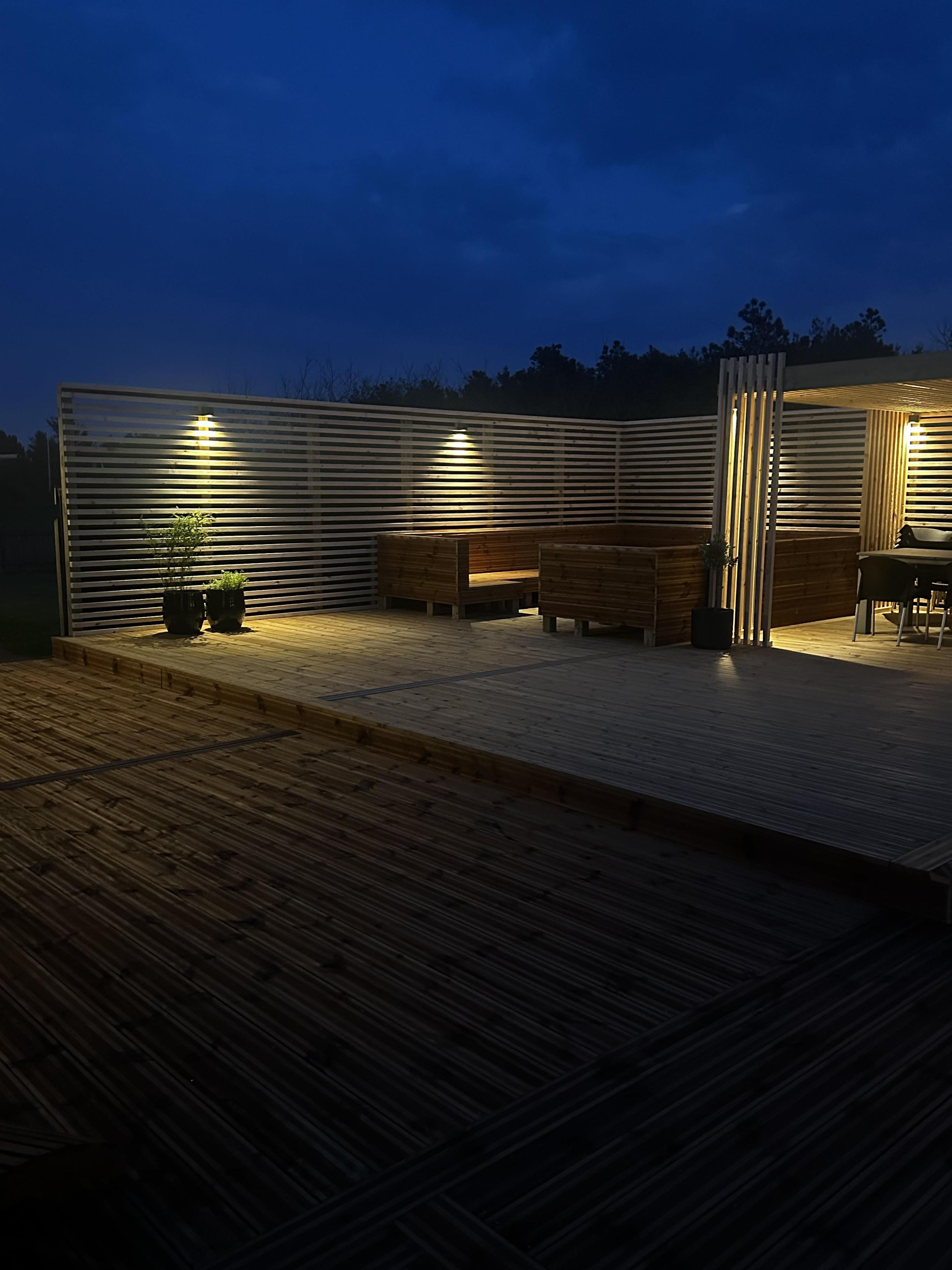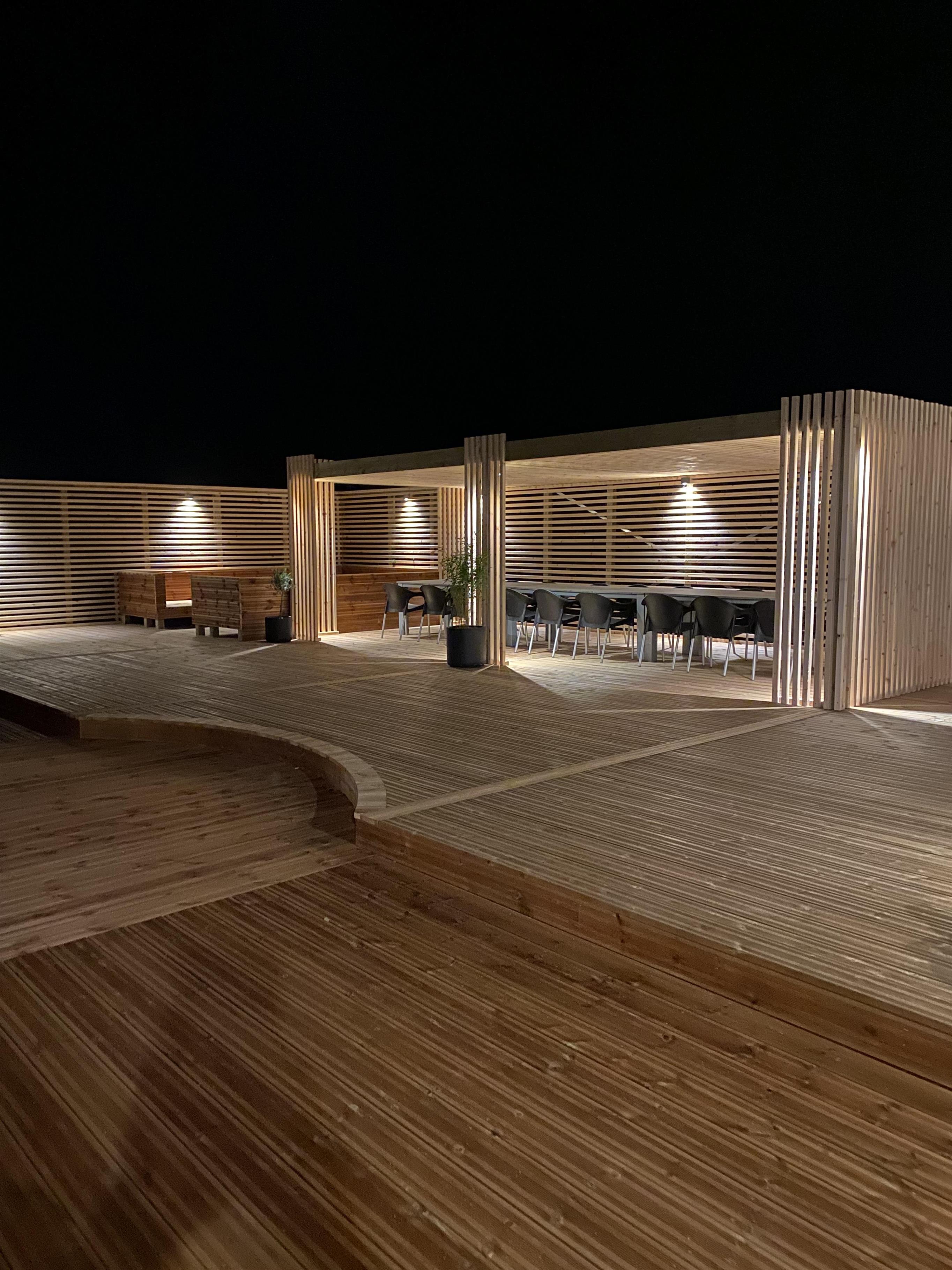 Centralt beliggende på en 100% indhegnet, velholdt grund tæt ved indkøb og spisemuligheder og kun 800 m fra Vesterhavet. Udearealerne er også et kapitel for sig. Store, velholdte terrasser med havemøbler. Bag huset er der et helt nyopført terrasseanlæg i træ, som skaber en "sydlandsk" stemning. Der er loungesæt, liggestole, pergola med stort havebord og stole, afdeling med udebruser og nedsænket spabad til 4-6 personer – det perfekte sted at nyde udendørs livet. Gasgrill forefindes.