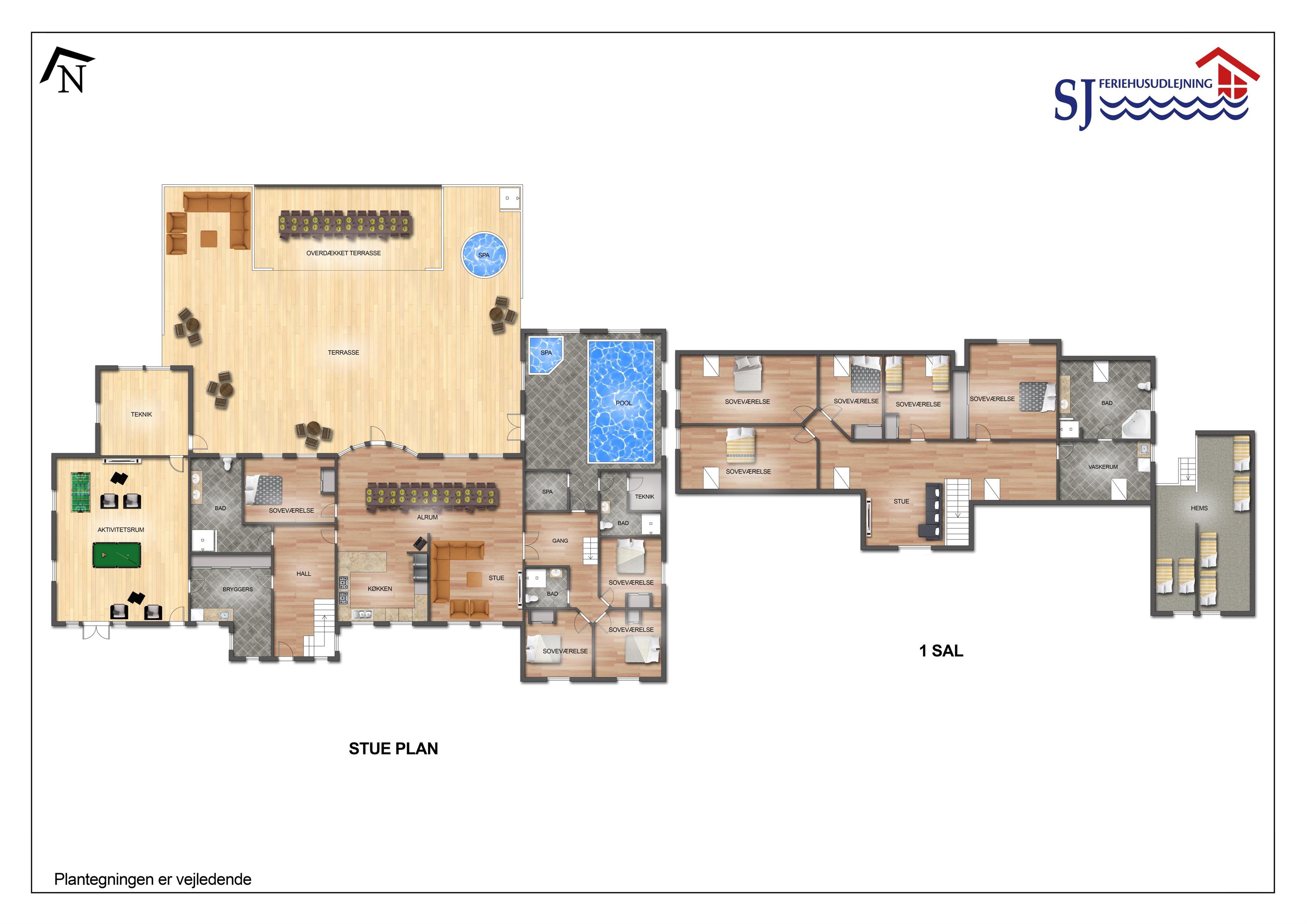 Huset er på 550 m2 og har internet. Husets primære rum er det store køkkenhjørne, som er kombineret med en stor, rummelig opholdsstue med gulvvarme, spiseplads og gode muligheder for afslapning. Køkkenet er fuldt udstyret, og der kan nemt laves en fantastisk middag til alle husets beboere. Dørene i huset er 90 cm brede, og man kan gå direkte i soveværelset fra køkkenalrummet, så det er forholdsvis handicapvenligt. I de dejlige møbler kan man nyde såvel danske som tyske kanaler på fjernsynet, hvor der også kan afspilles DVD. På de kølige aftener kan der tændes op i brændeovnen, som giver ekstra hygge. Huset har stor wellnessafdeling med stor, lækker swimmingpool med rutchebane, sauna og spabad. Der er 4 badeværelser, som alle har både toilet, brus og gulvvarme. I stueetagen er der 4 soveværelser til 8 personer. På første sal er der yderligere en dejlig opholdsstue med TV, 5 soveværelser til 10 personer samt en stor hems med 6 sovepladser. På 1. sal er der også et badeværelse med en dejligt badekar. Er du til aktivitet, så er husets aktivitetsrum lige noget for dig. Billardbord, bordfodbold, airhockey, Playstation 3 og bordtennis er blandt nogle af rummets muligheder. Huset er lavet som et energioptimeret hus, da der opvarmes med fjernvarme - som i Harboøre en en væsentlig billigere opvarmning end el. Pt er prisen for fjernevarme er kr. 2,5 pr enhed. Herudover betales der også for el og vand. Depositum vintersæson kr. 8000 og sommersæson kr. 5000. Har man el-bil eller en Plug-In hybrid, så er der opsat ladeboks fra ca. 1.6.23. Som lejer af dette hus har I gratis adgang til Harbøre Centret.