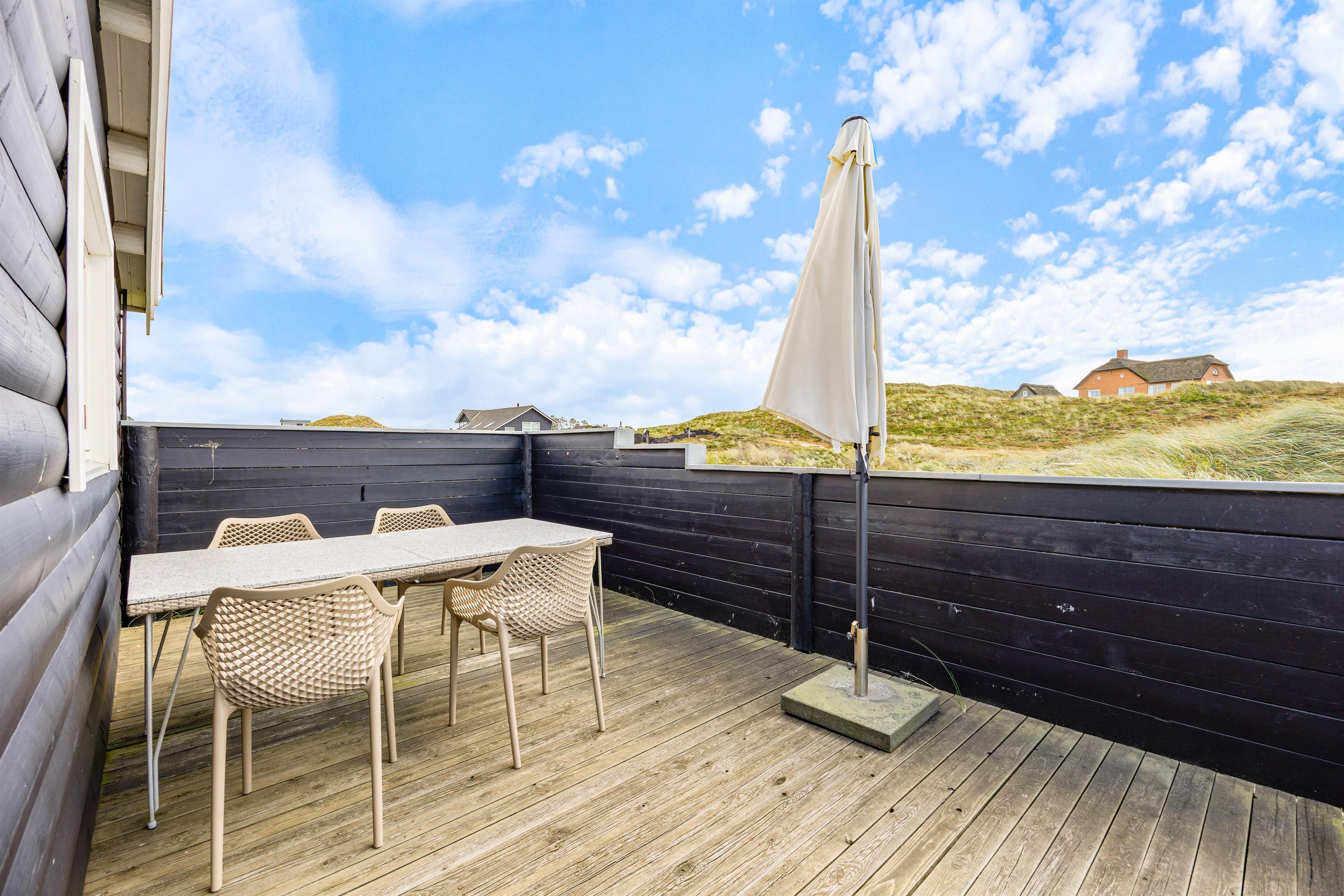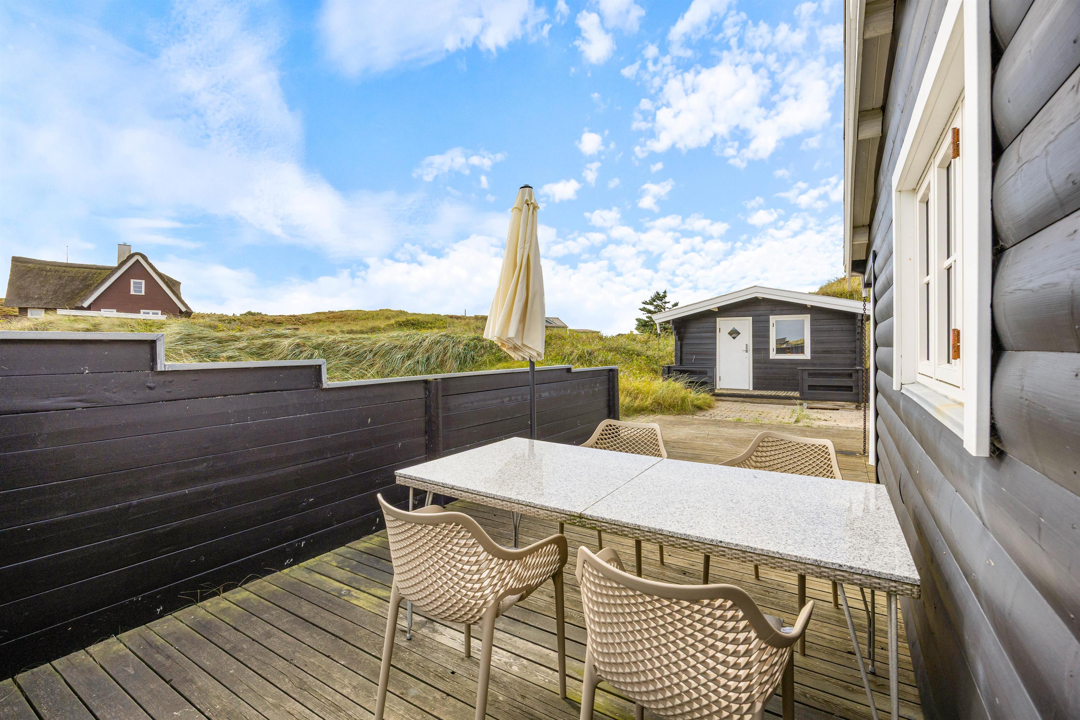 Sommerhusets terrasse har både et åbent-, et afskærmet- og et overdækket område, så her indbydes til lækre grillmiddage og hyggelige stunder under åben himmel. Med 5000 meter til nærmeste indkøb er det let at få fat i lokale råvarer til måltidet, som I kan nyde sammen på terrassen eller indenfor i det hyggelige feriehus. Skulle I få lyst, byder udebruseren på en forfriskende oplevelse efter en dag på stranden.