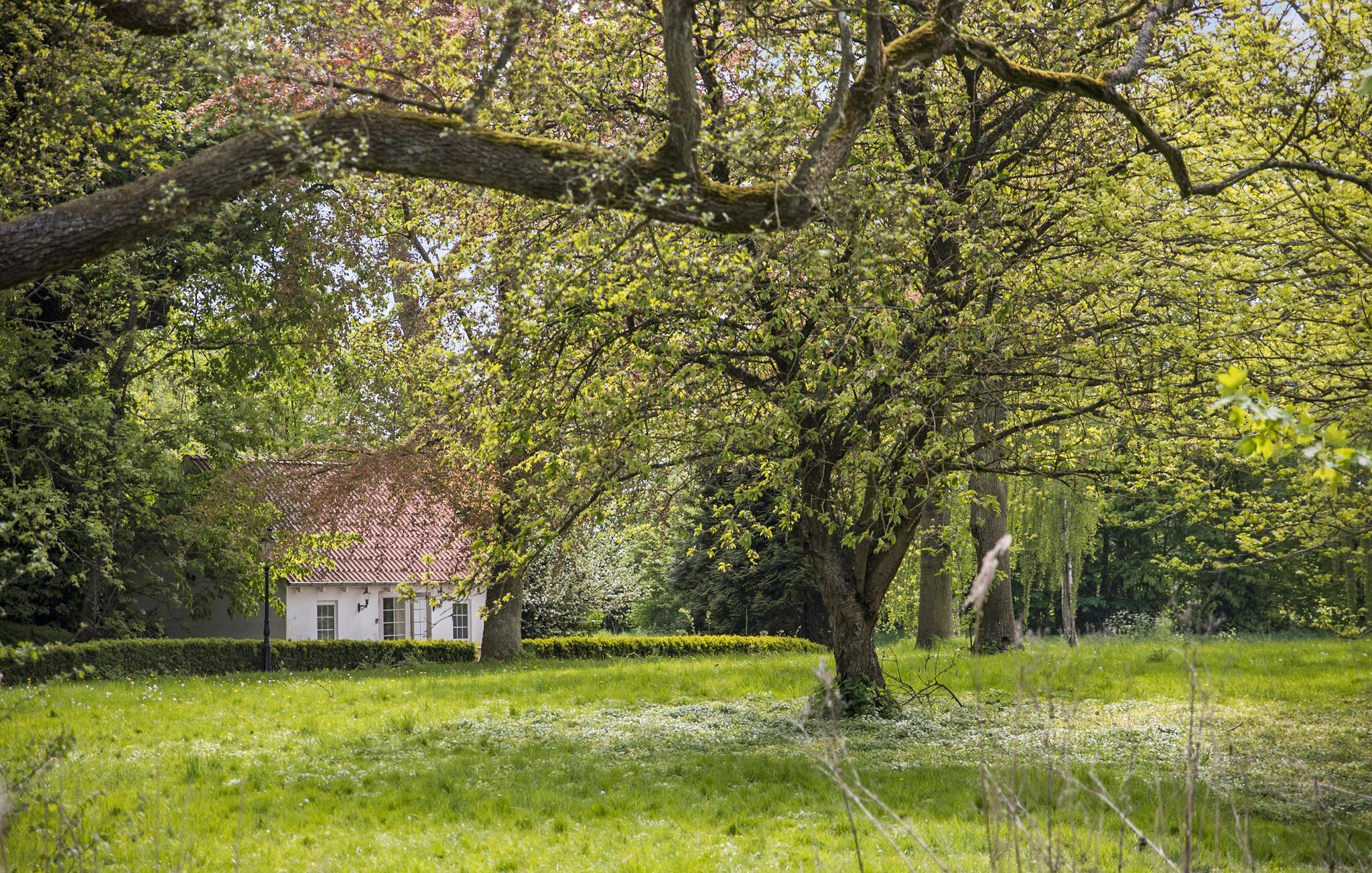 Hyggeligt feriehus i slotsparken ved Hvedholm Slot med stor fælles grund og terrasse i smukke, rolige omgivelser på Sydfyn.