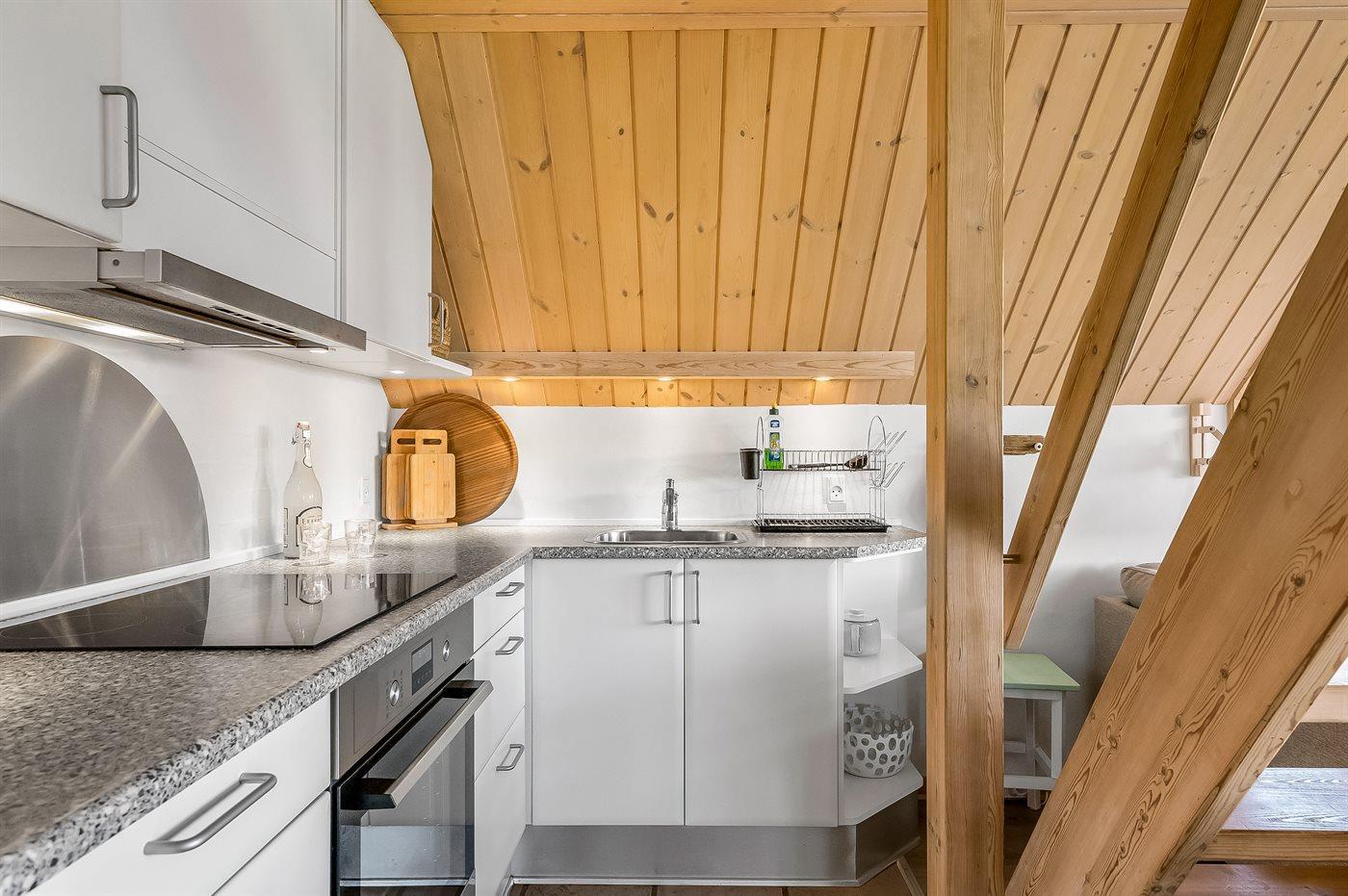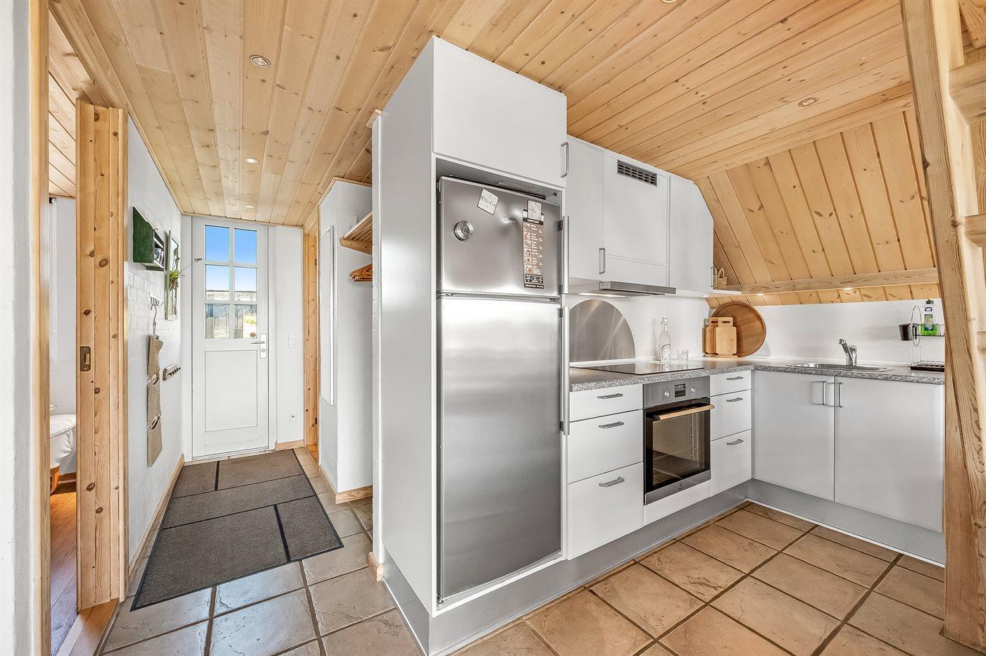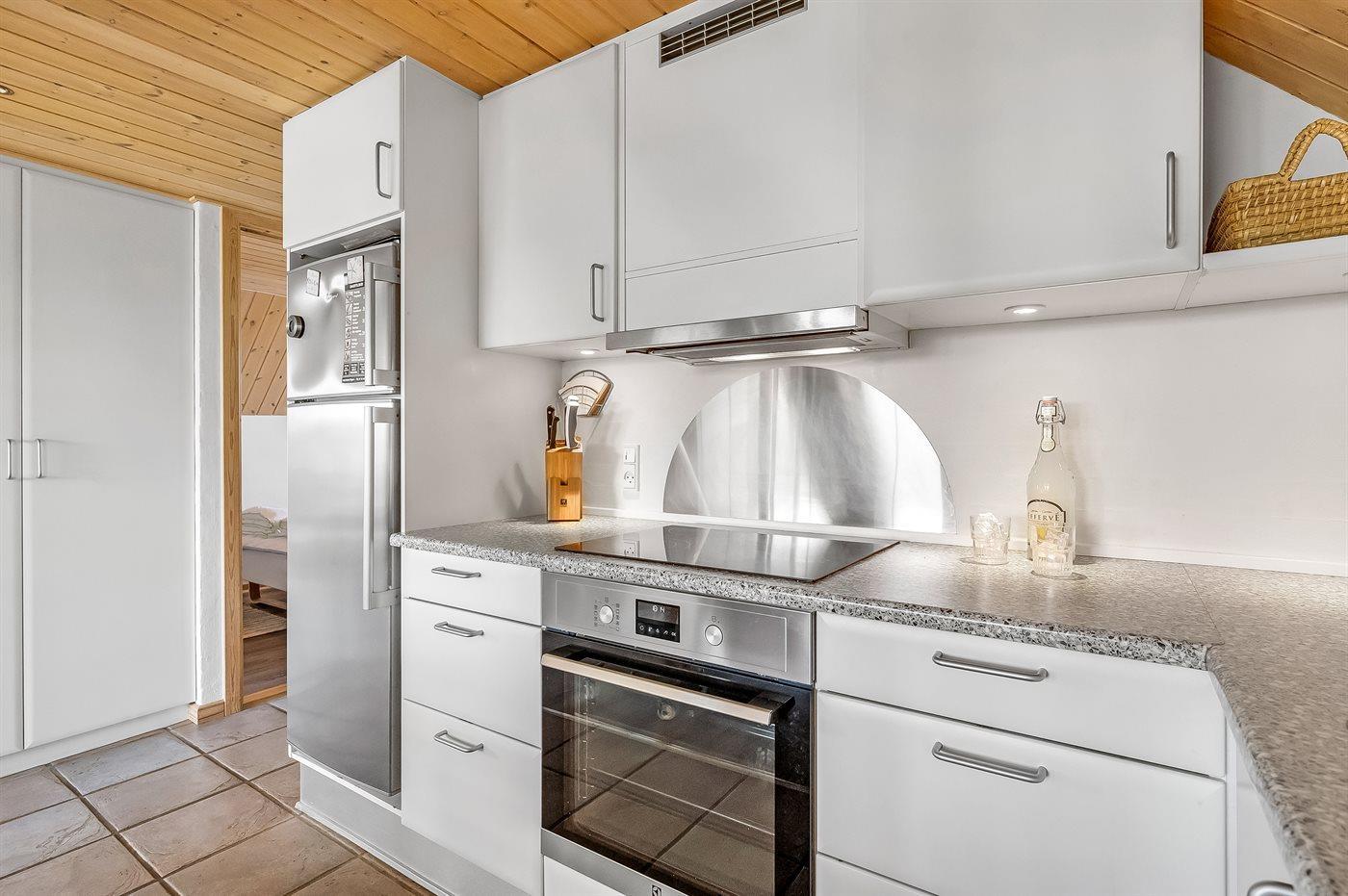 Køkkenet er udstyret med 1 køleskab. Der er 4 keramiske kogeplader, bageovn, mikrobølgeovn Der er gulvvarme i køkkenet.