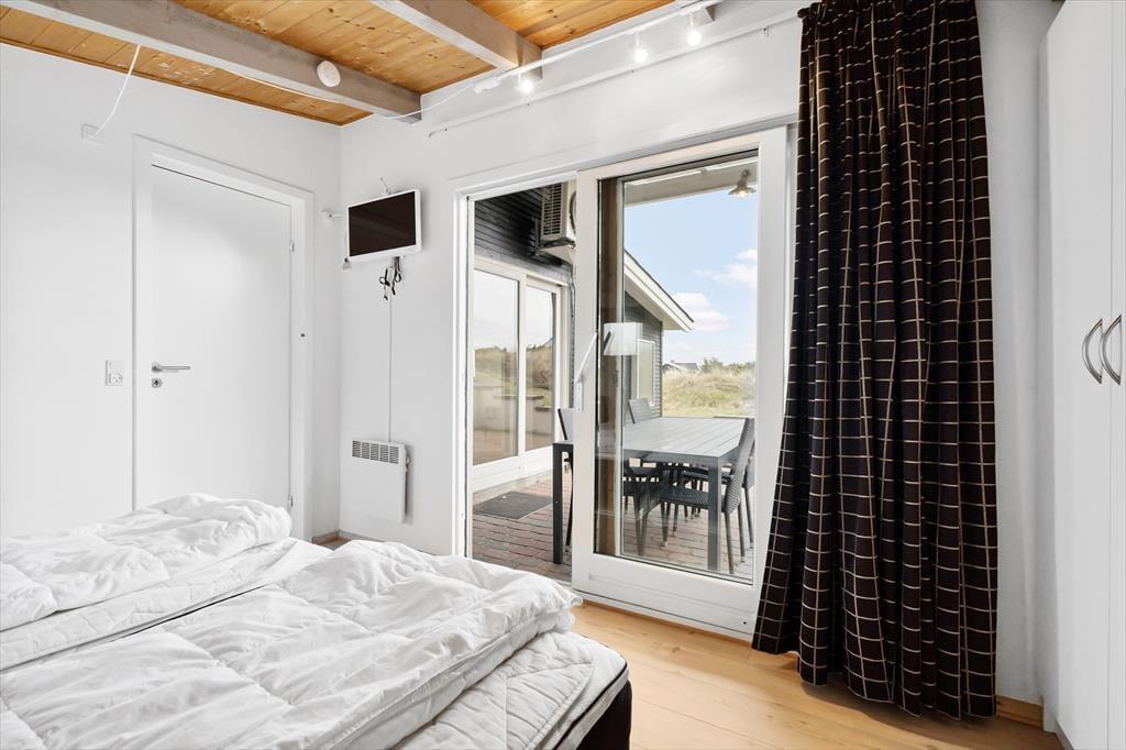 Stuens store vinduespartier giver dig fri udsigt til klitterne, men når du sætter dig helt ud på terrassen, bliver det smukke syn ledsaget af andre sanseoplevelser – de lune solstråler, den salte, friske lugt og måske endda lyden af rullende bølger. En del af terrassen er skærmet af et glasværn, hvis du får brug for læ for vestenvinden, og der er både parasoller og et overdækket areal til de sommervarme dage, hvor det er rart med skygge. Har du været ned for at blive frisket op af en havdukkert, kan du skylle dig under den udendørs bruser, så snart du er tilbage igen ved sommerhuset.