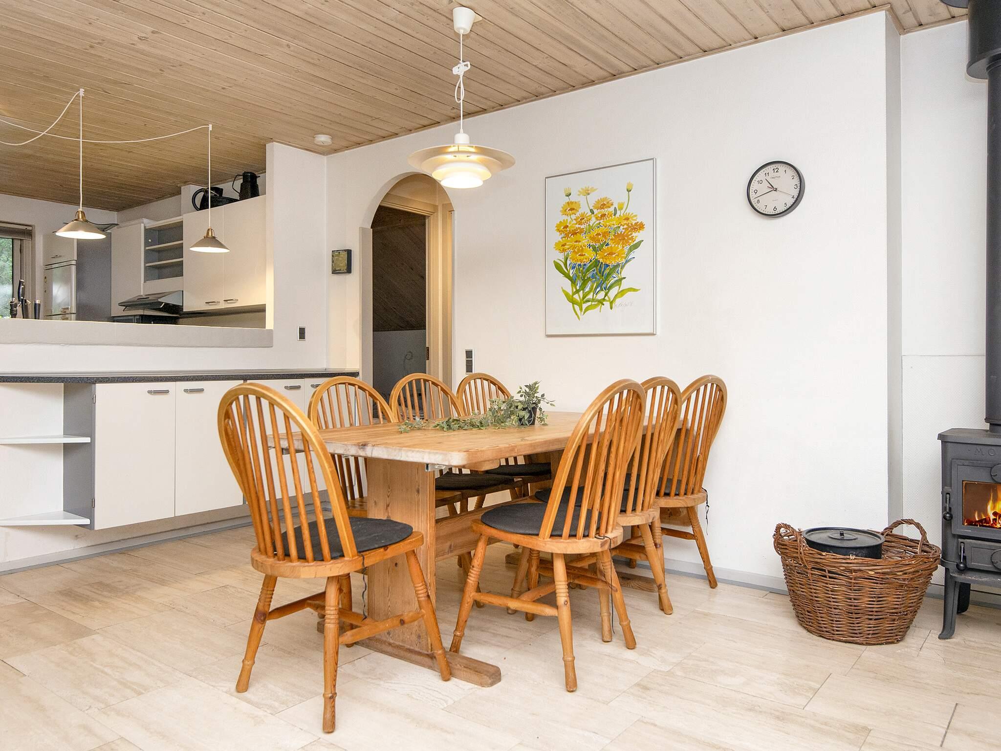 Sommerhuset fremstår med en smagfuldt indrettet stue, der er kombineret med spisestuen og køkkenet. Ved køkkenet findes et viktualierum med arbejdsbord.