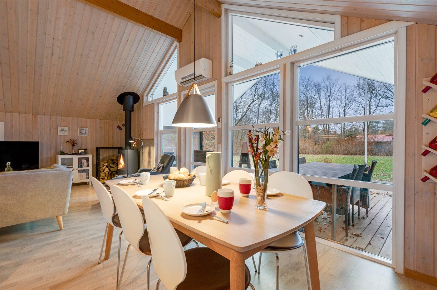 På kolde dage kan I nyde varmen fra brændeovnen i stuen, og den energivenlige luft/luft varmepumpe sikrer et behageligt indeklima året rundt. Der er også en centralstøvsuger, som gør rengøringen nem og bekvem.