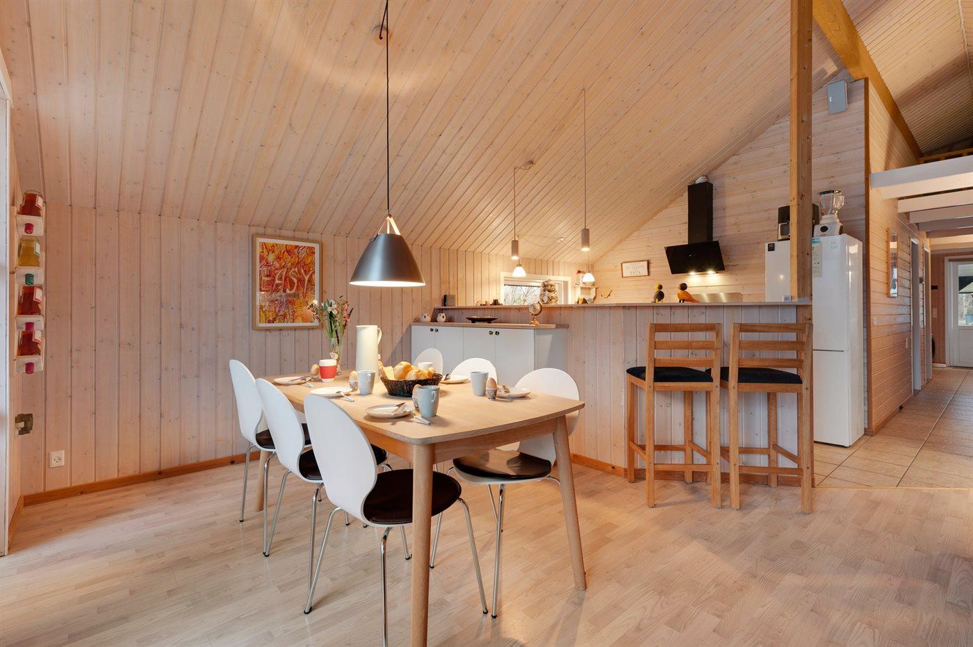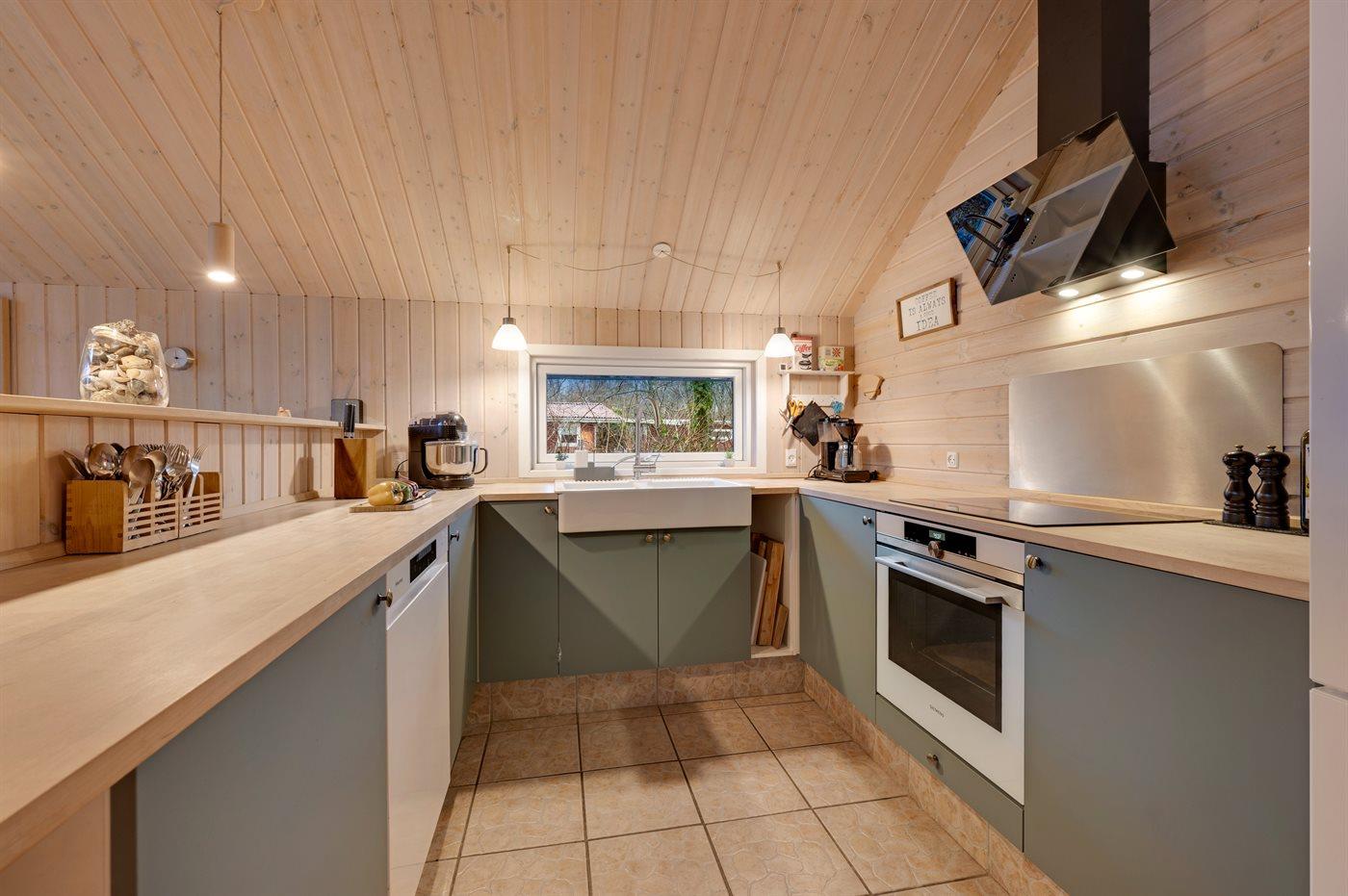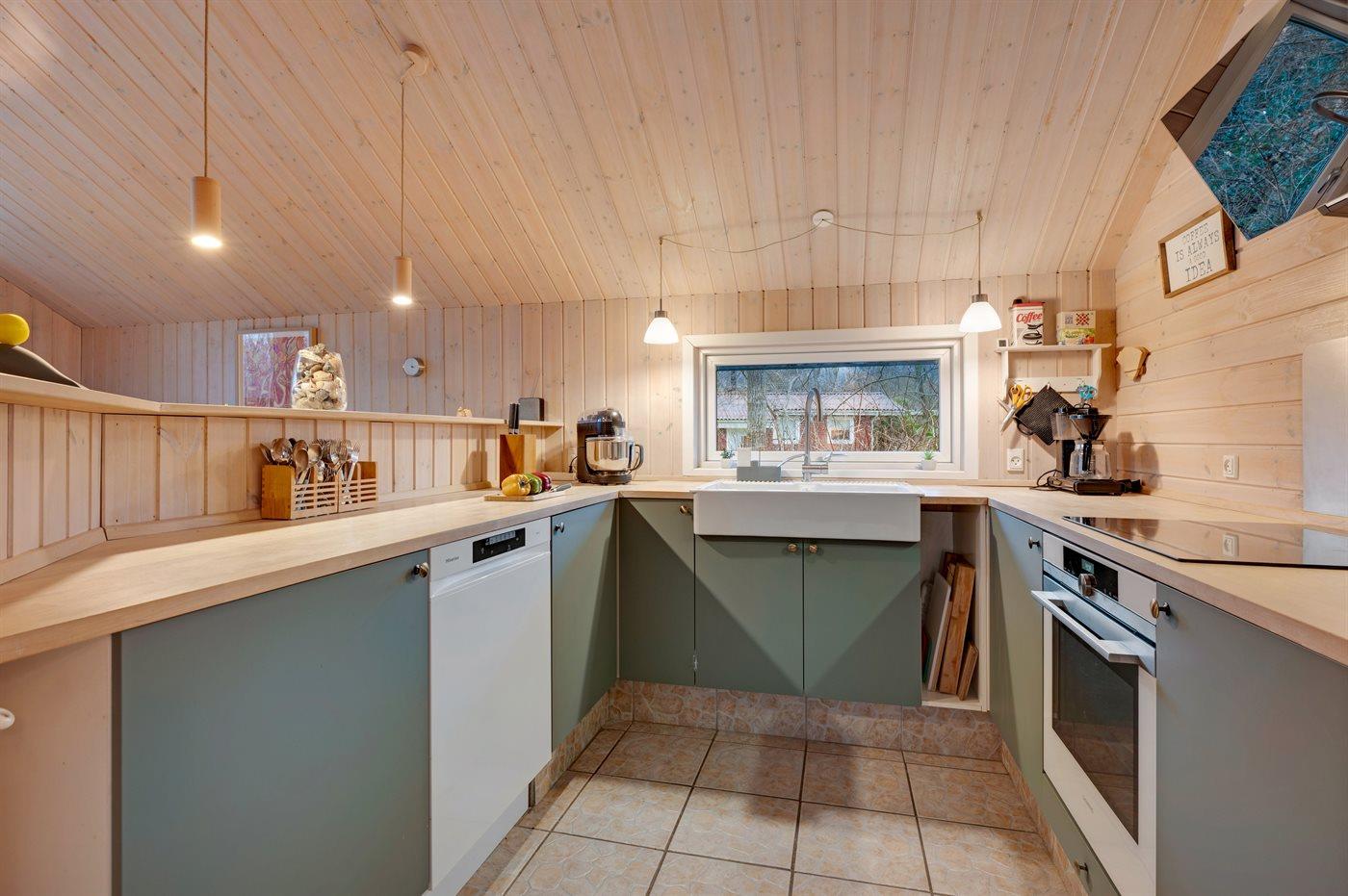 Køkkenet er udstyret med 1 køleskab. Der er 4 induktionskogeplader, varmluftovn, Airfryer samt opvaskemaskine.