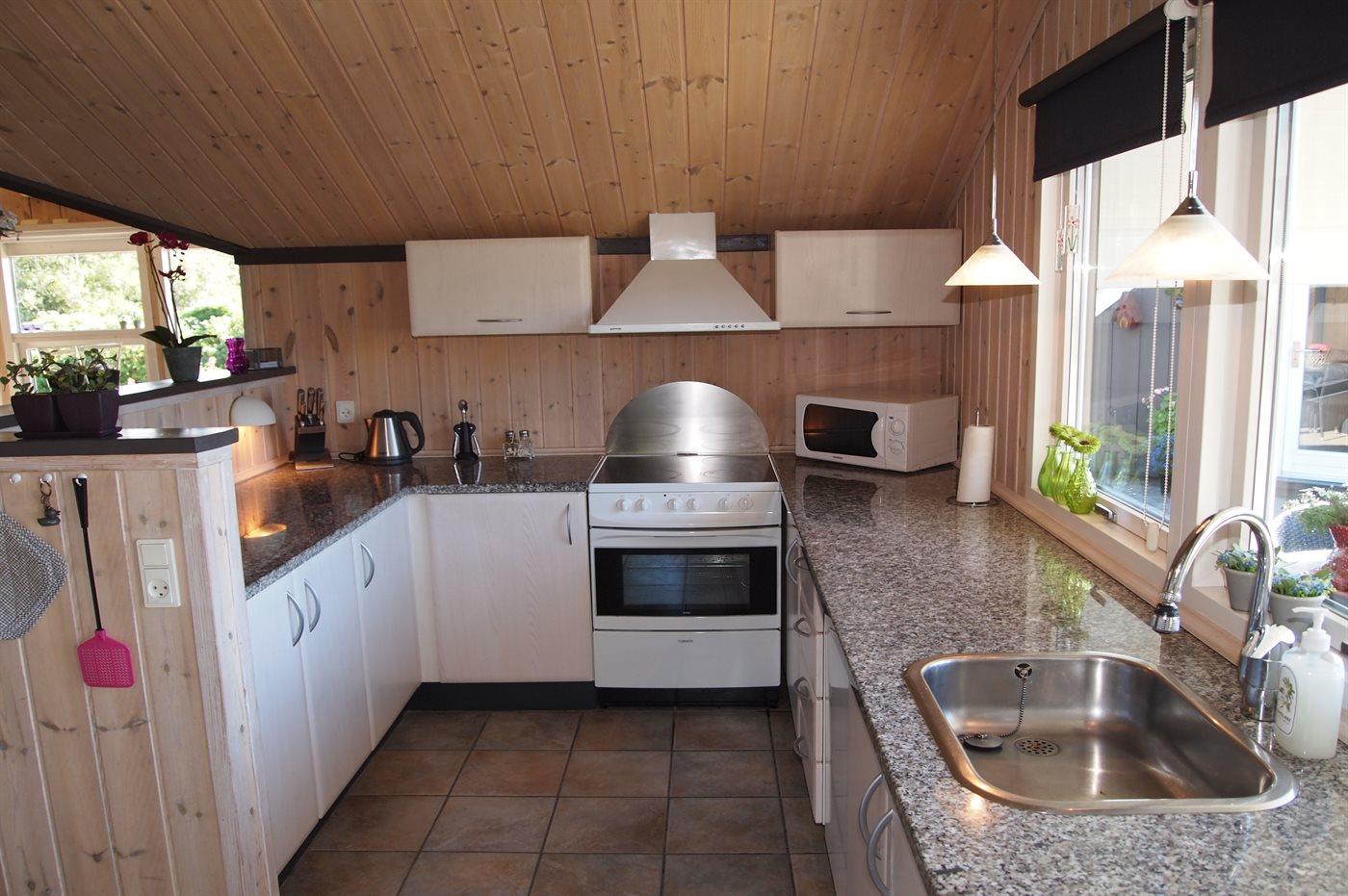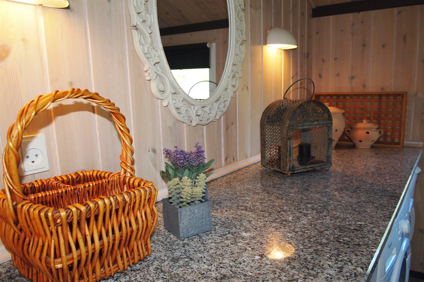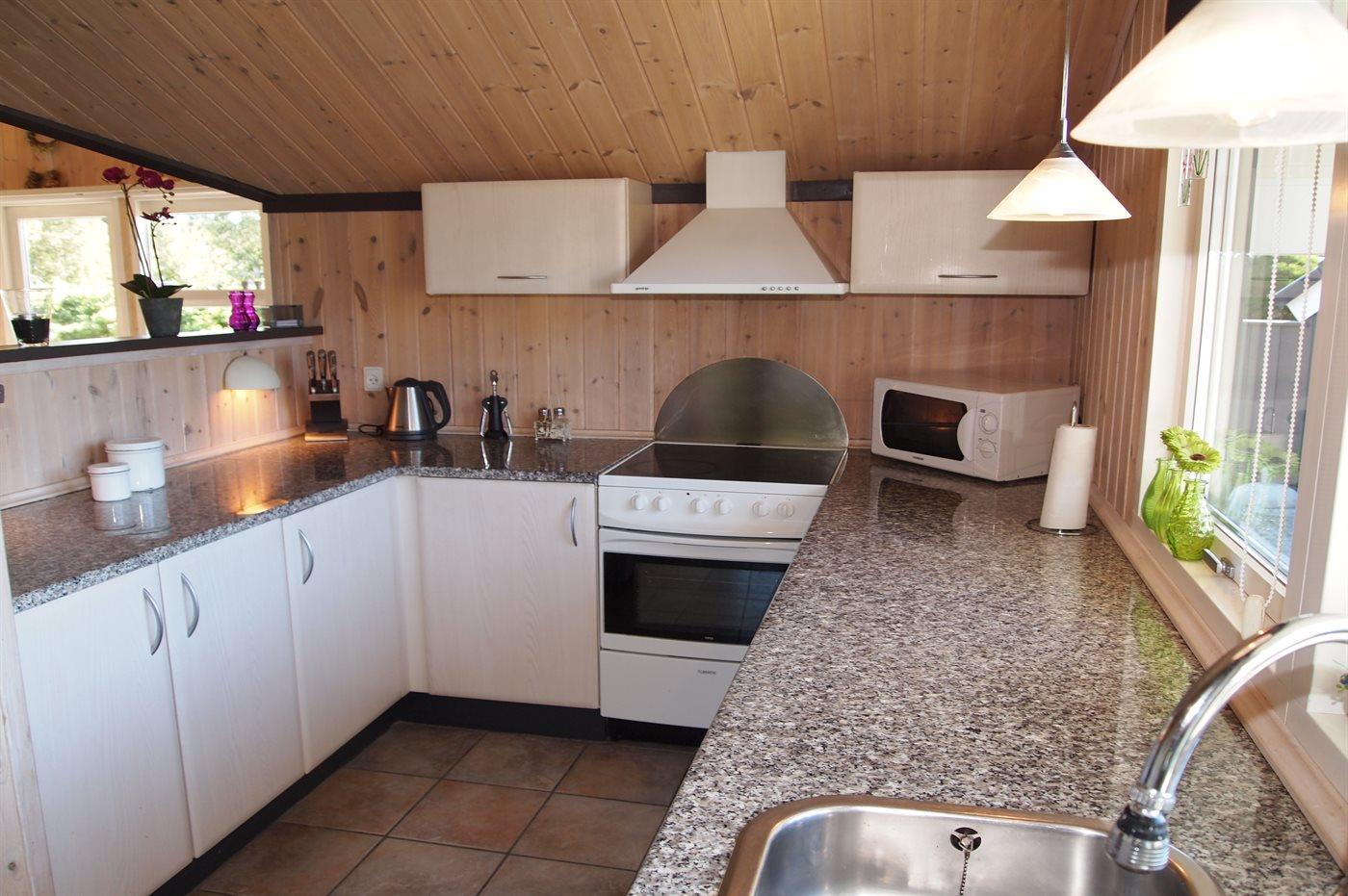 Køkkenet er udstyret med 1 køleskab. Der er 4 keramiske kogeplader, bageovn, mikrobølgeovn samt opvaskemaskine.