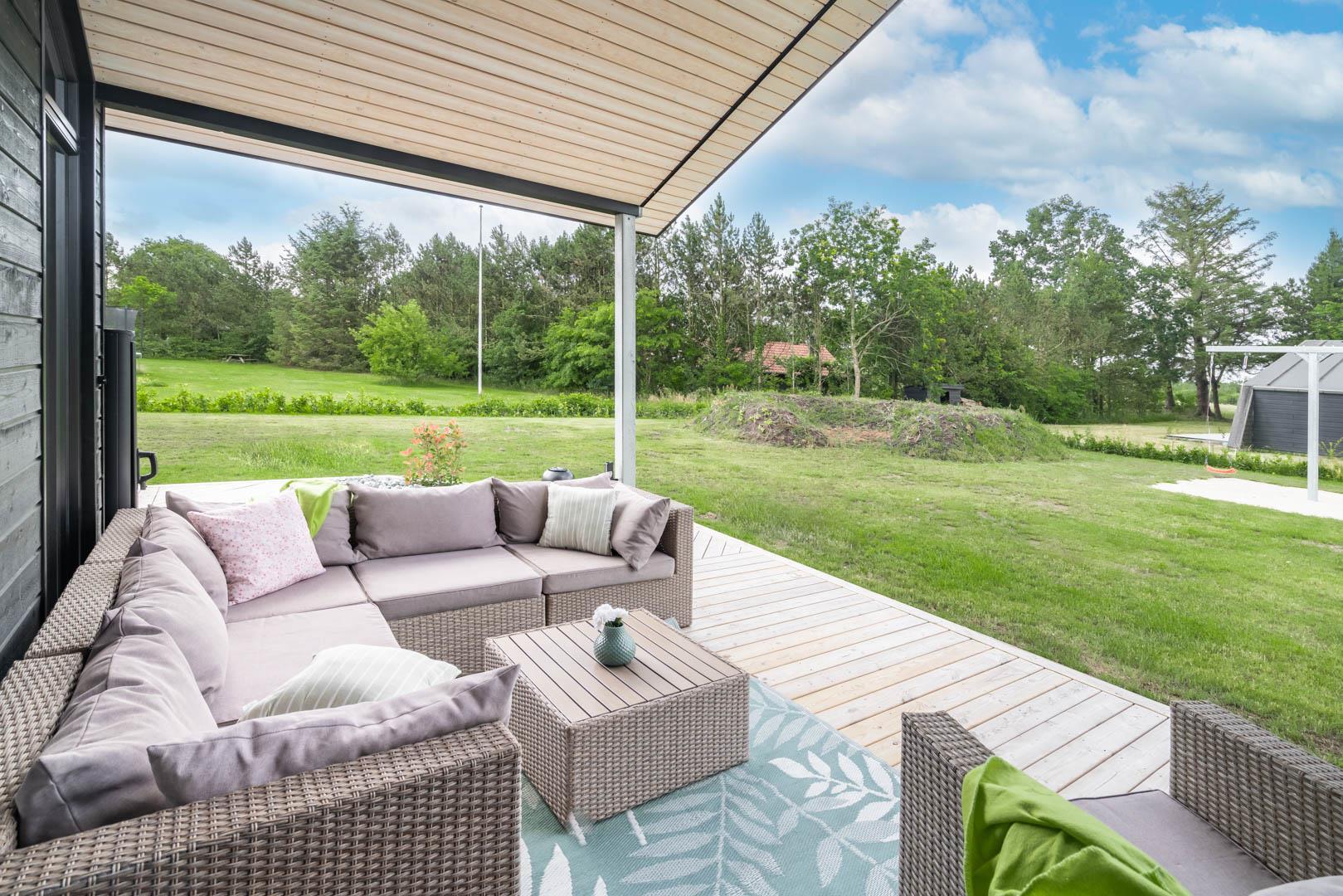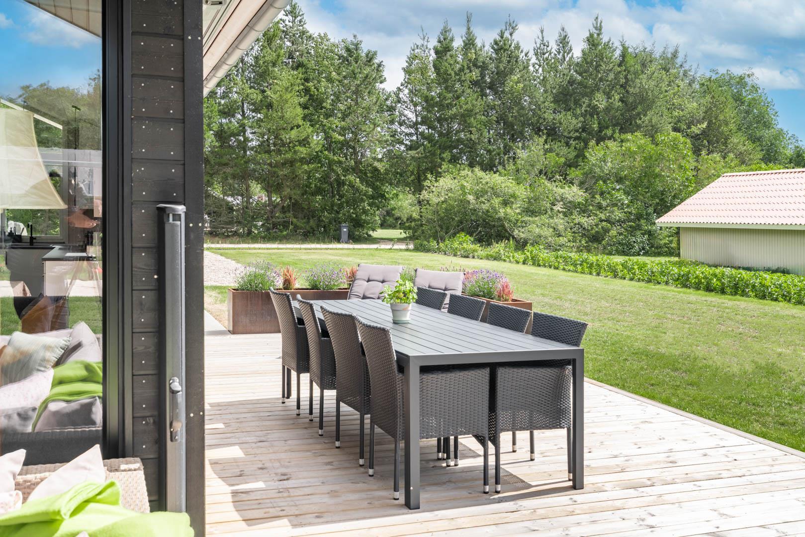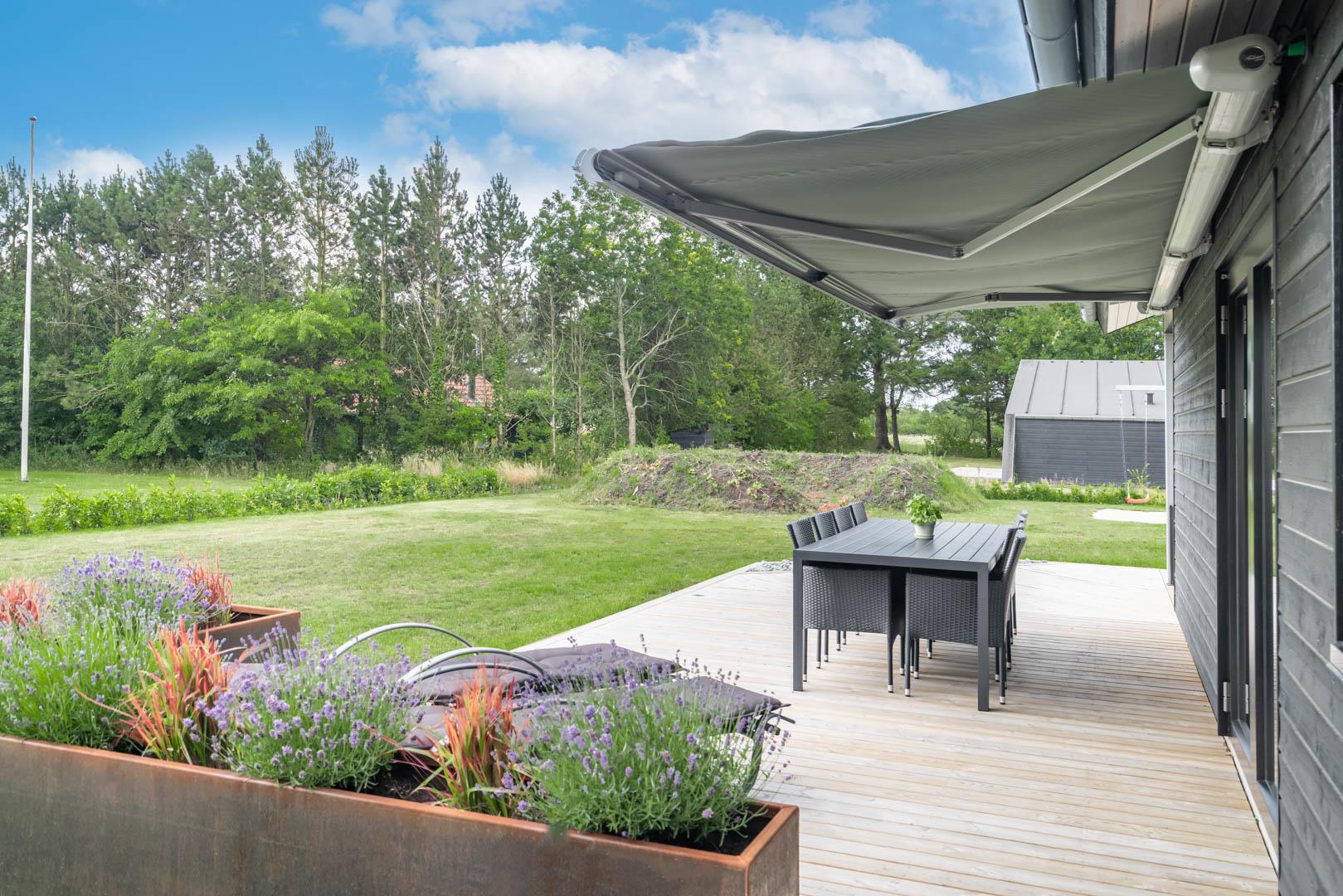 Den store, delvist overdækkede terrasse danner rammen om afslappende feriedage i det fri. Her kan du nyde morgenkaffen i solen, slappe af med en god bog eller samle familien til grillmiddag – uanset vejret.