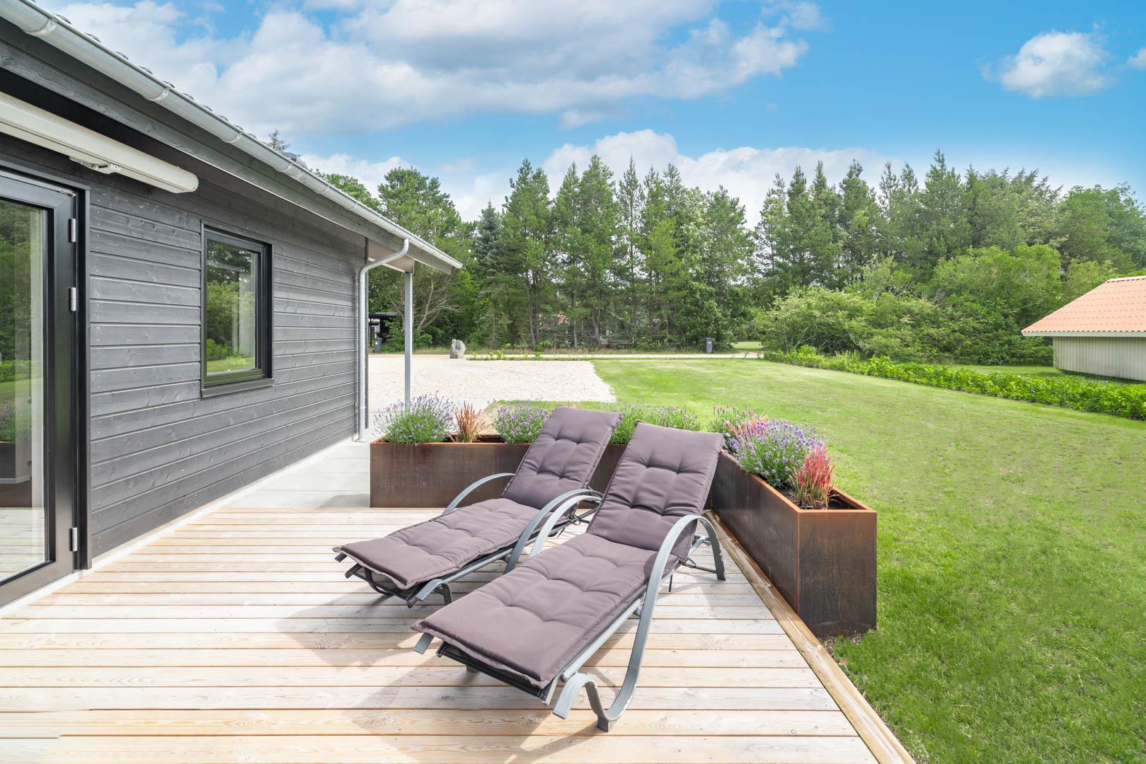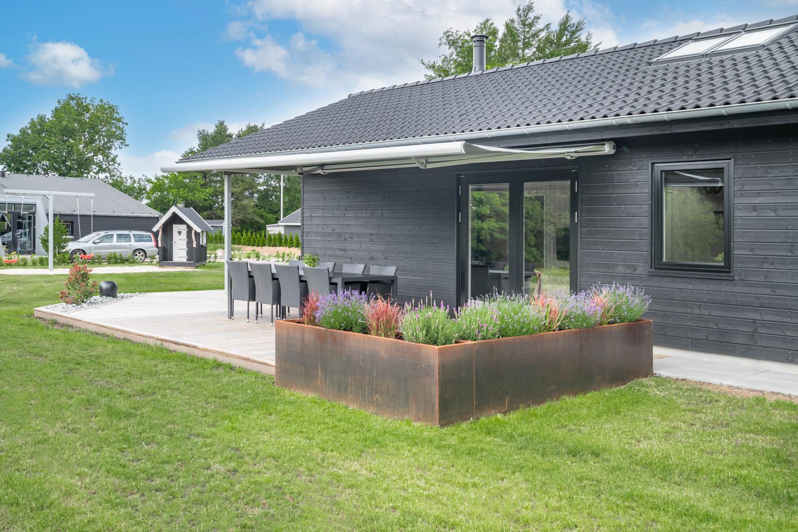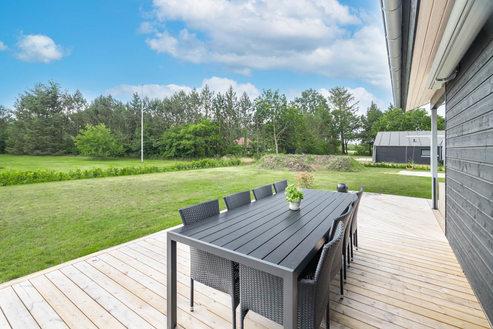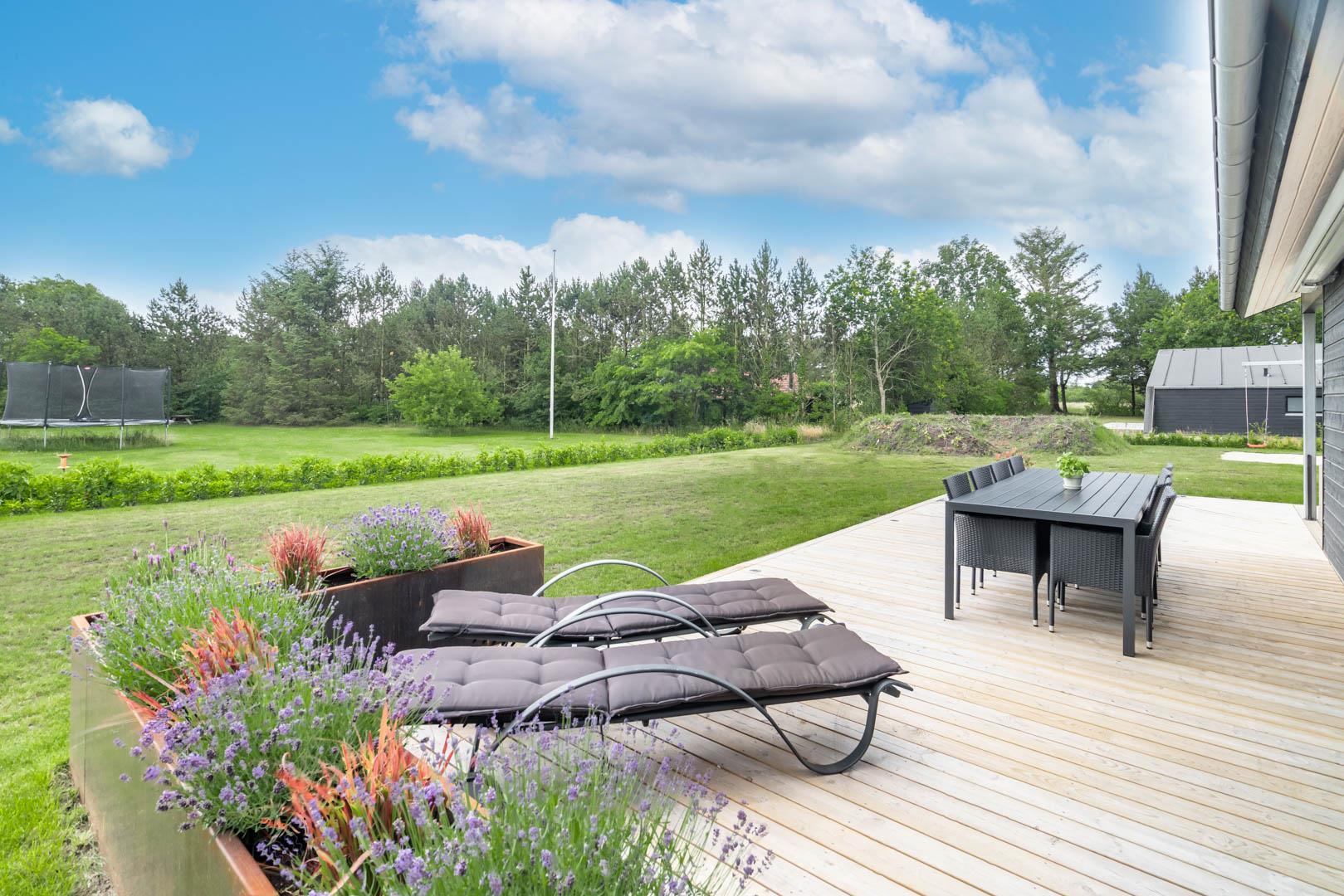 Den store, delvist overdækkede terrasse danner rammen om afslappende feriedage i det fri. Her kan du nyde morgenkaffen i solen, slappe af med en god bog eller samle familien til grillmiddag – uanset vejret.