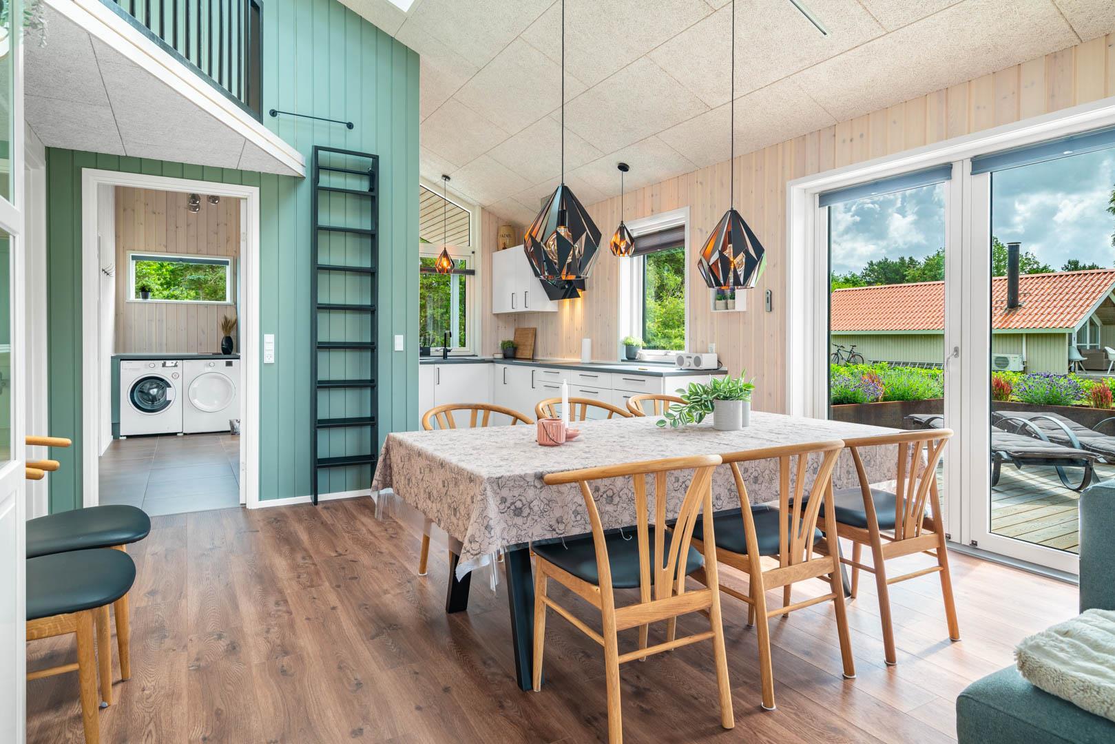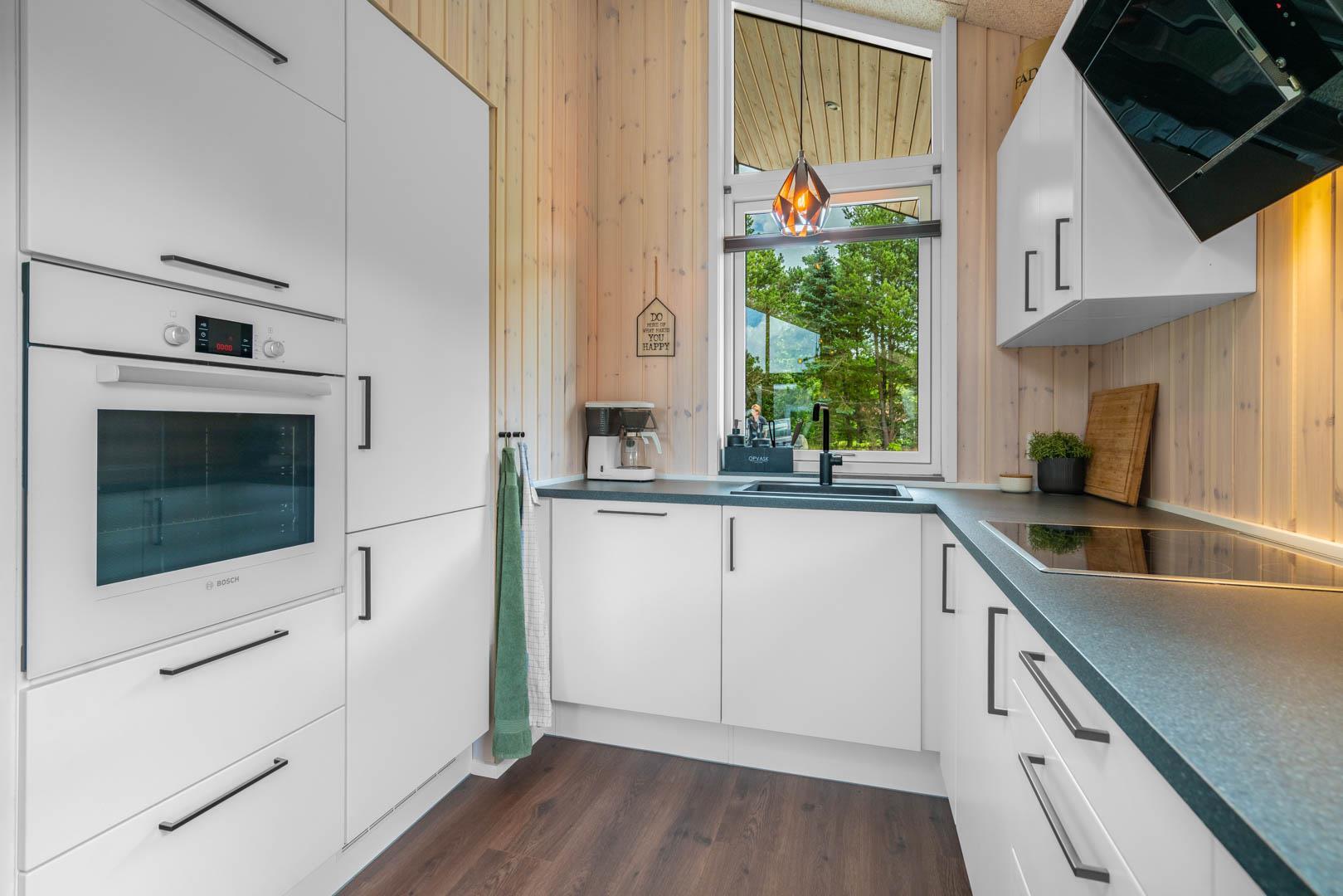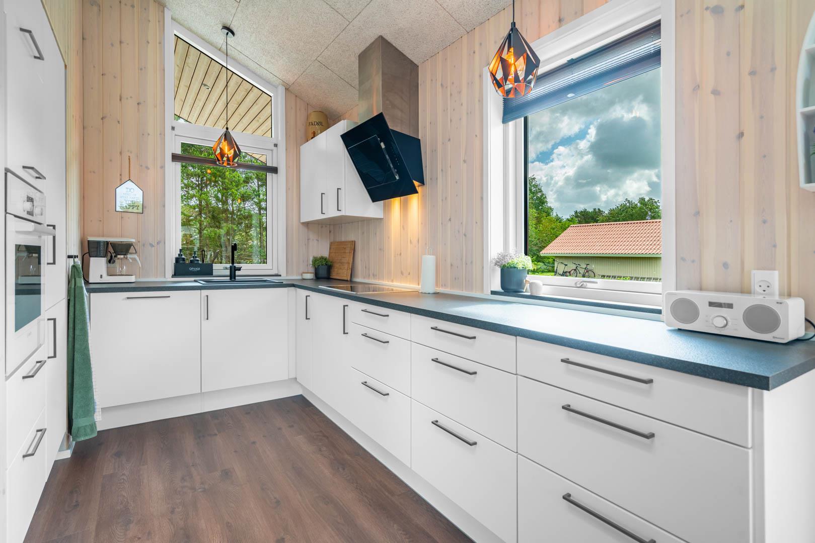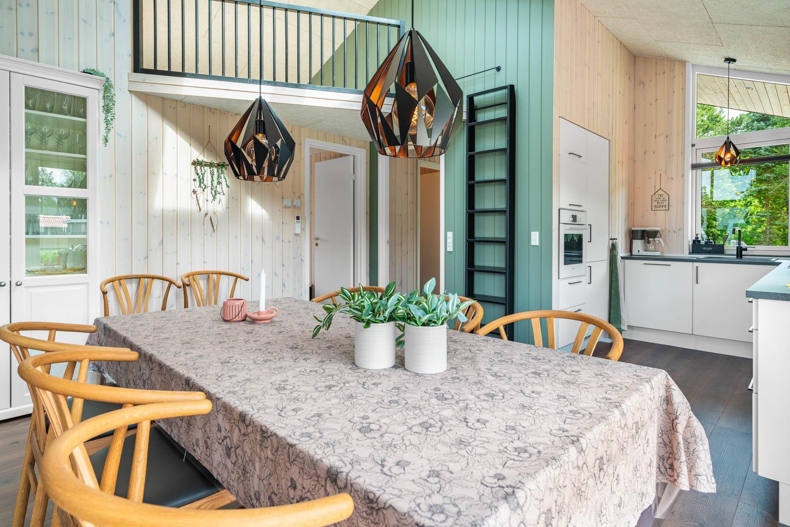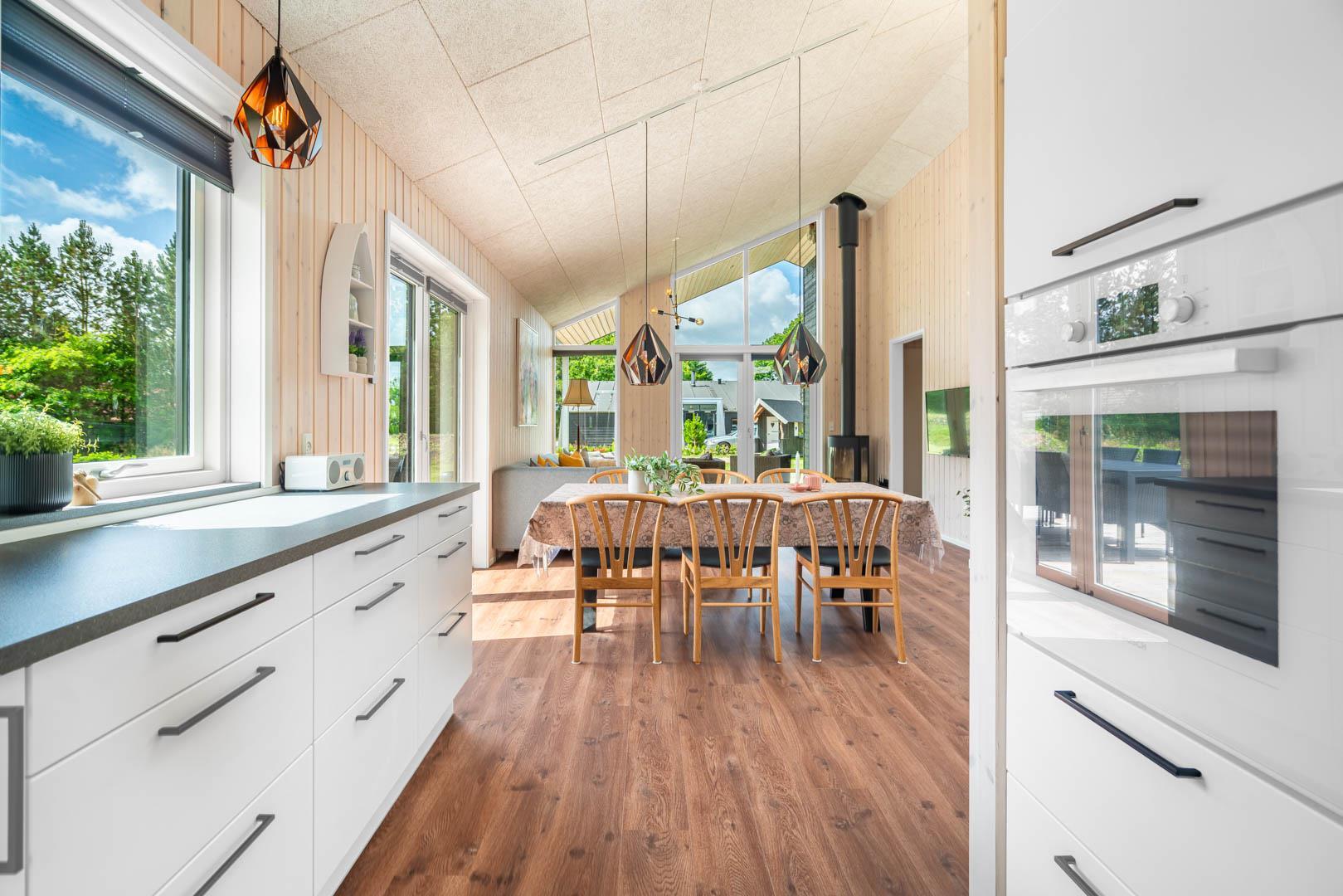 Det åbne køkken er moderne og veludstyret med opvaskemaskine og alt, hvad du skal bruge til feriens måltider. Det store spisebord indbyder til lange middage, brætspil og gode samtaler.