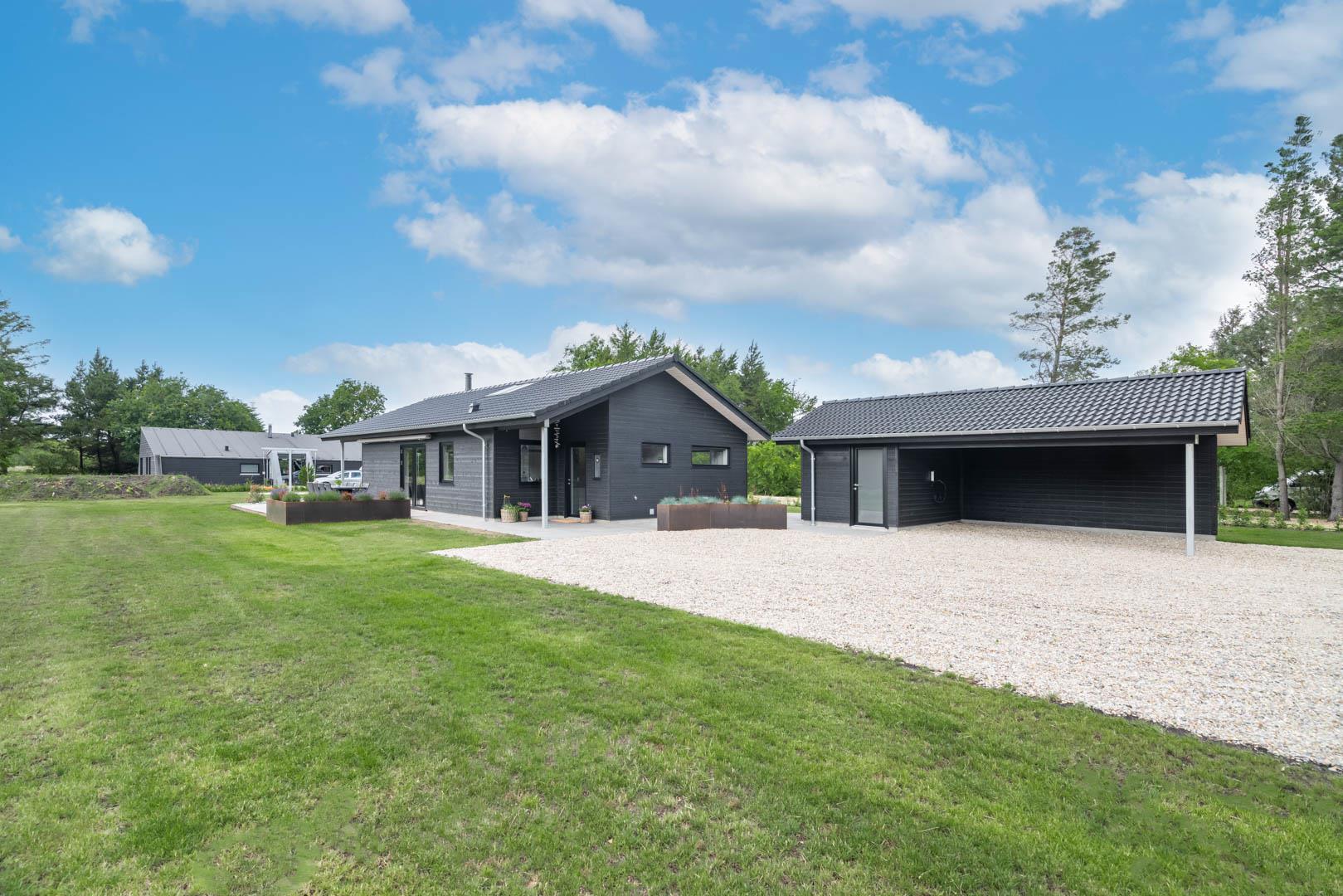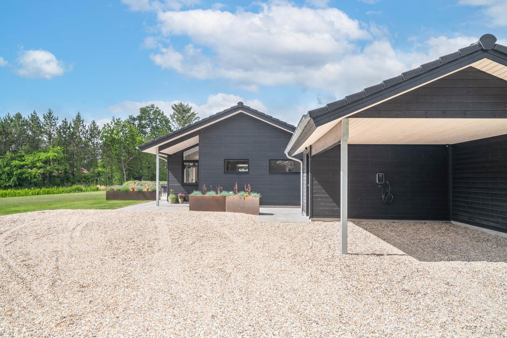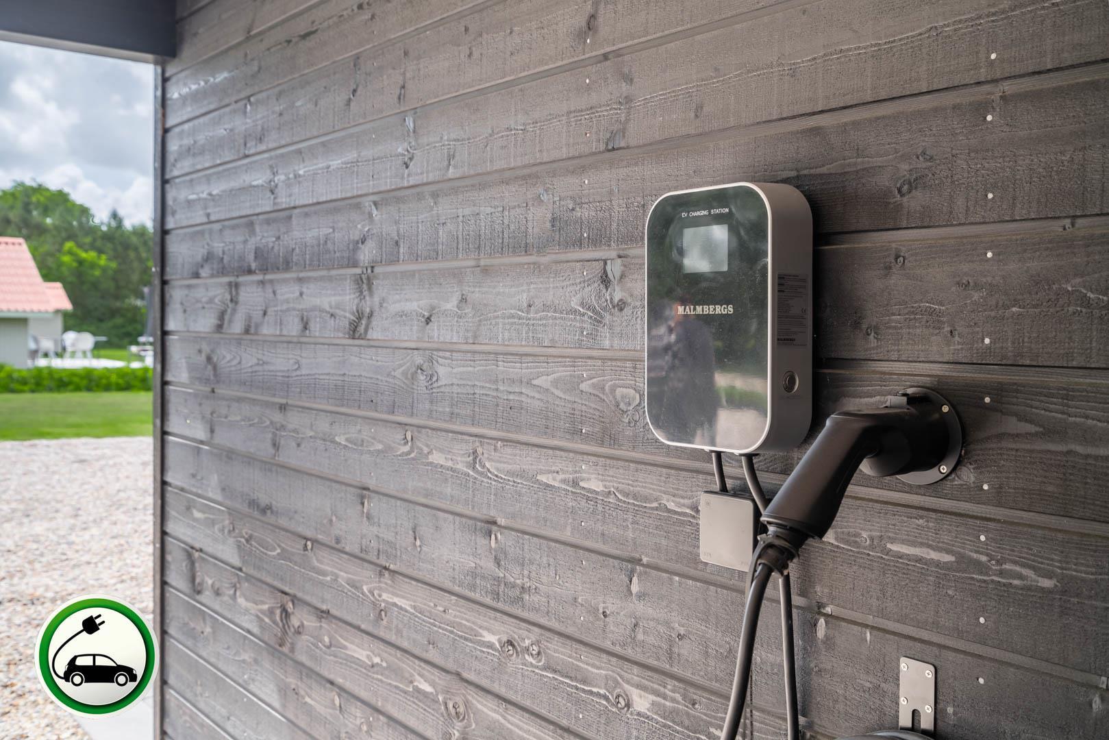Sommerhuset har carport, så bilen står beskyttet mod vejr og vind. Her finder du også en Type 2-ladestander (11 kW), så du nemt kan oplade din elbil under opholdet.