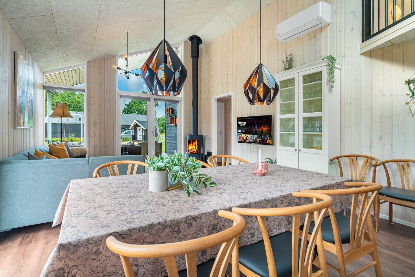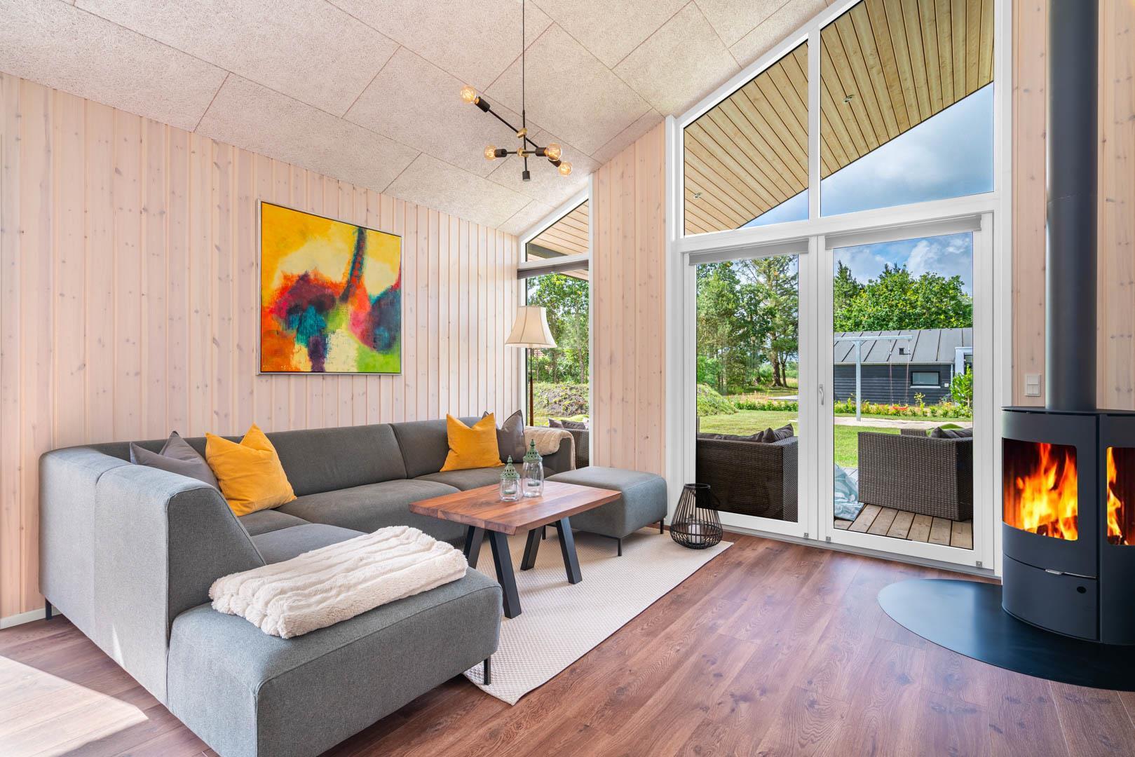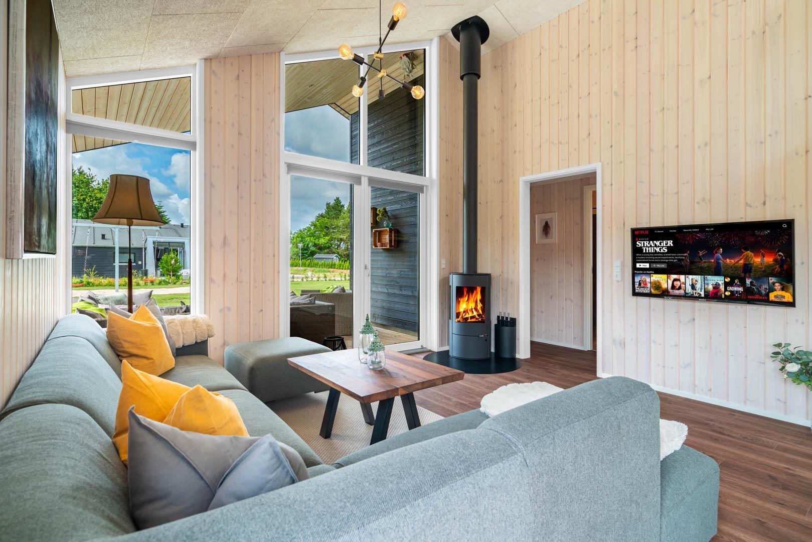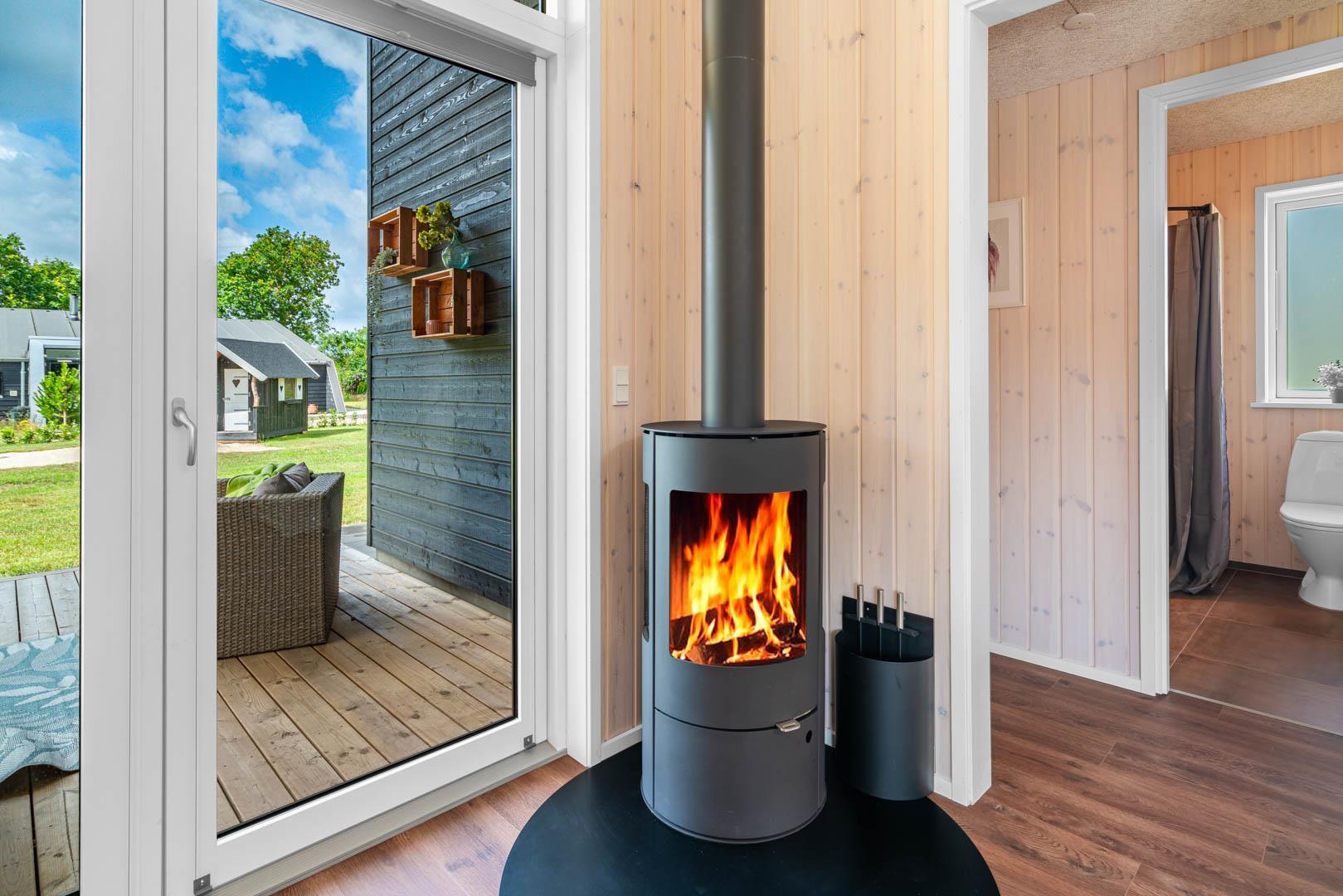 Husets naturlige samlingspunkt er det åbne opholdsrum med loft til kip og en hyggelig sofakrog. Tænd op i brændeovnen, læn dig tilbage og nyd stemningen, mens vinden rusker blidt i trætoppene udenfor. Med TV og Chromecast kan du streame dine yndlingsserier – præcis som derhjemme.