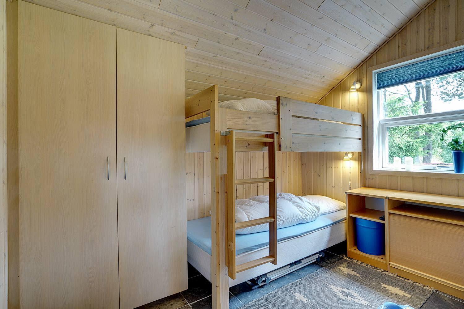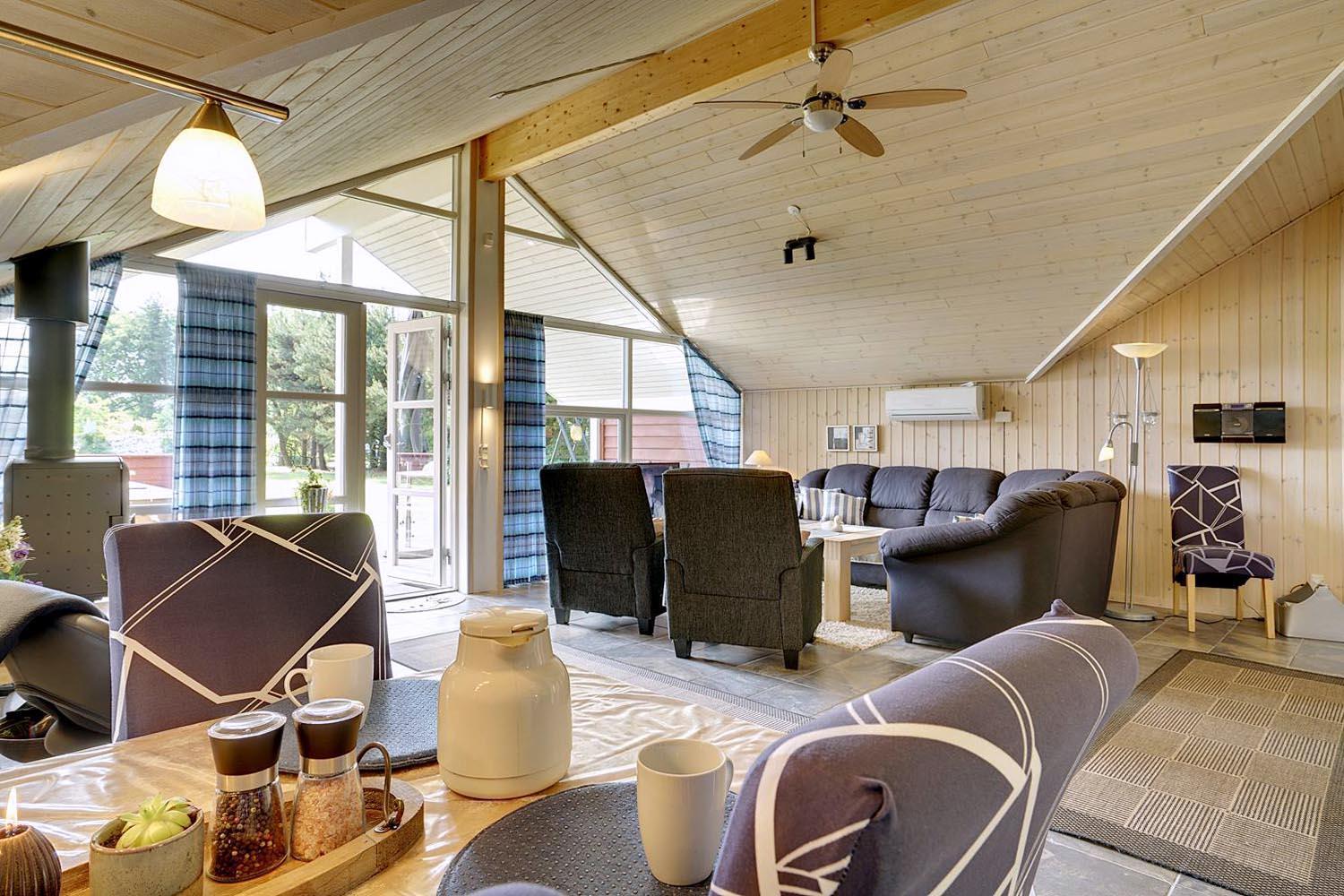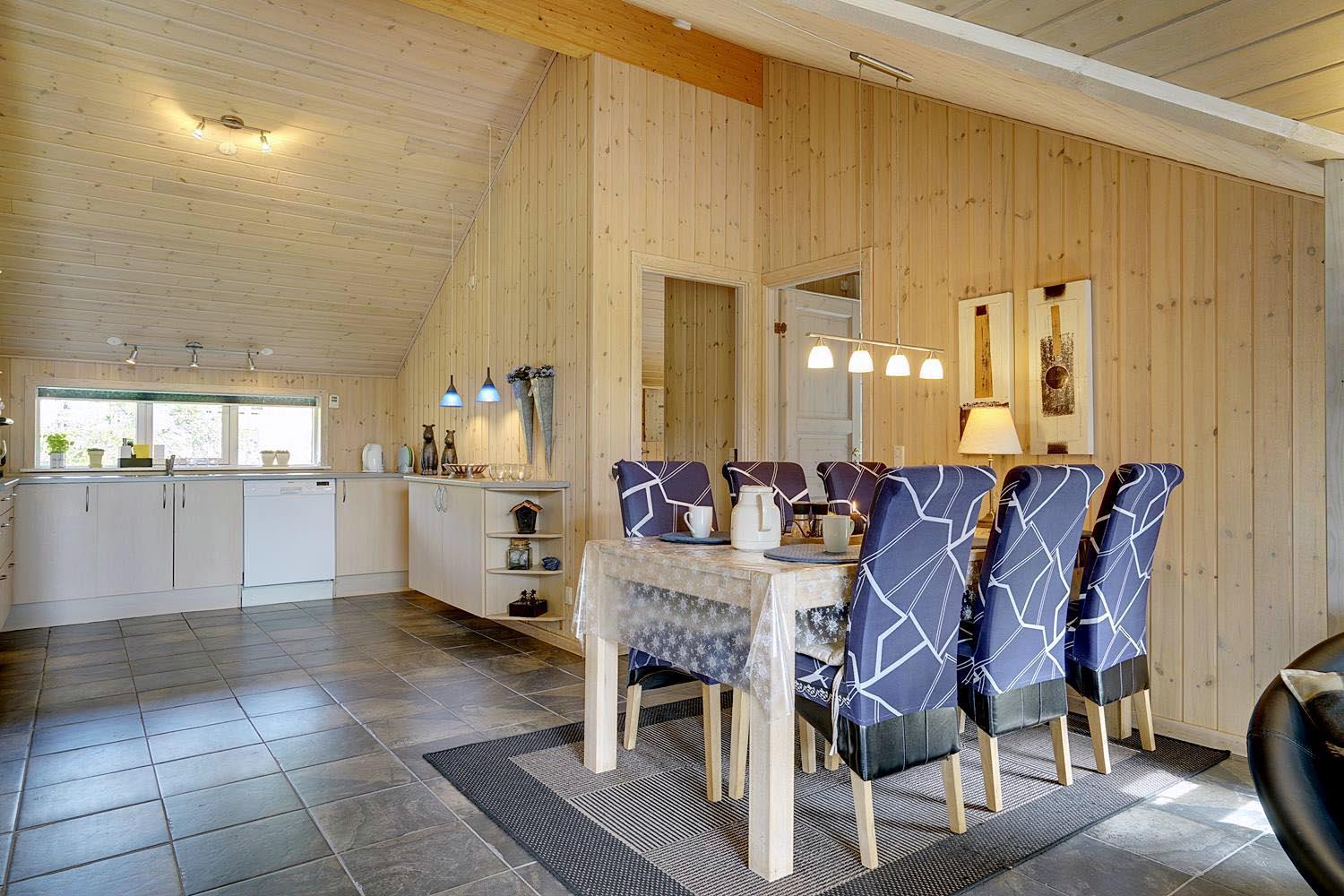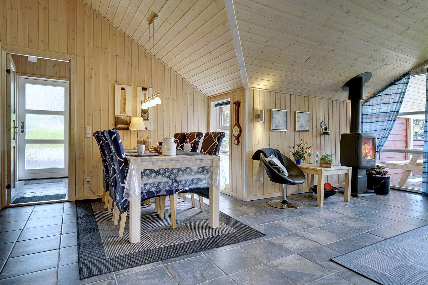 Husets hjerte er det indbydende opholdsrum, hvor stue og køkken smelter sammen i ét åbent og lyst fællesområde. Brændeovnen spreder varme og klassisk sommerhushygge på kølige dage, mens gulvvarme og varmepumpe sikrer et behageligt indeklima året rundt. Den åbne planløsning gør det nemt at være sammen – uanset om I slapper af i sofaen, spiller spil eller laver mad.