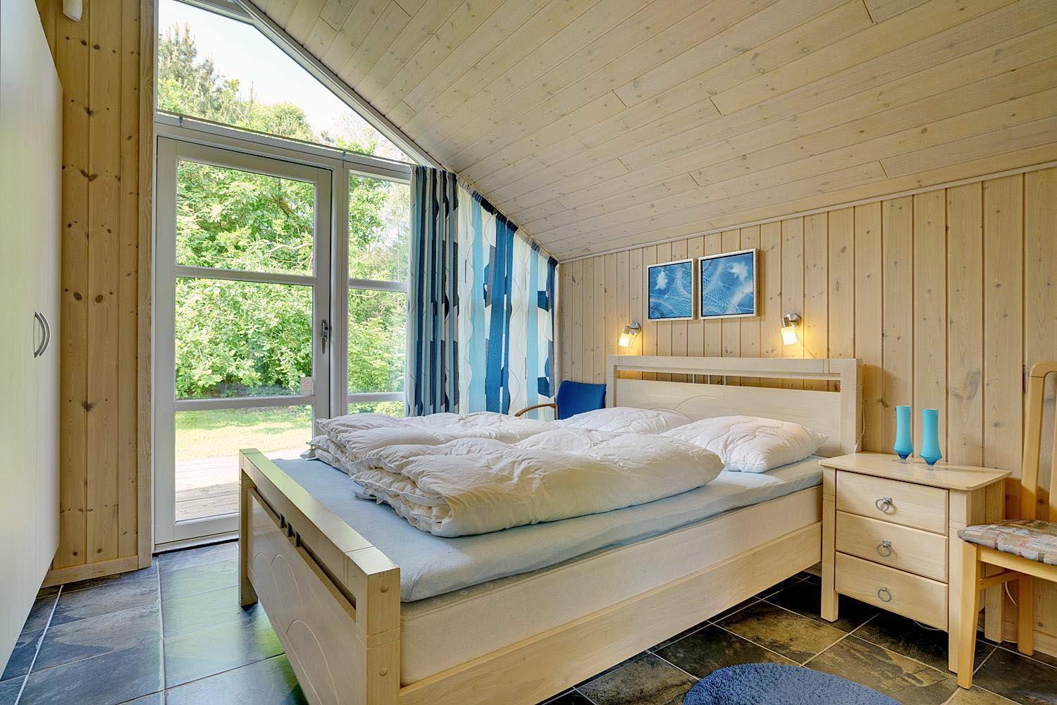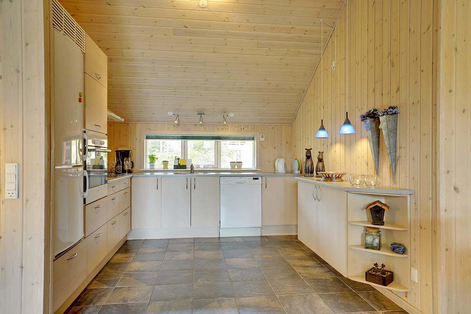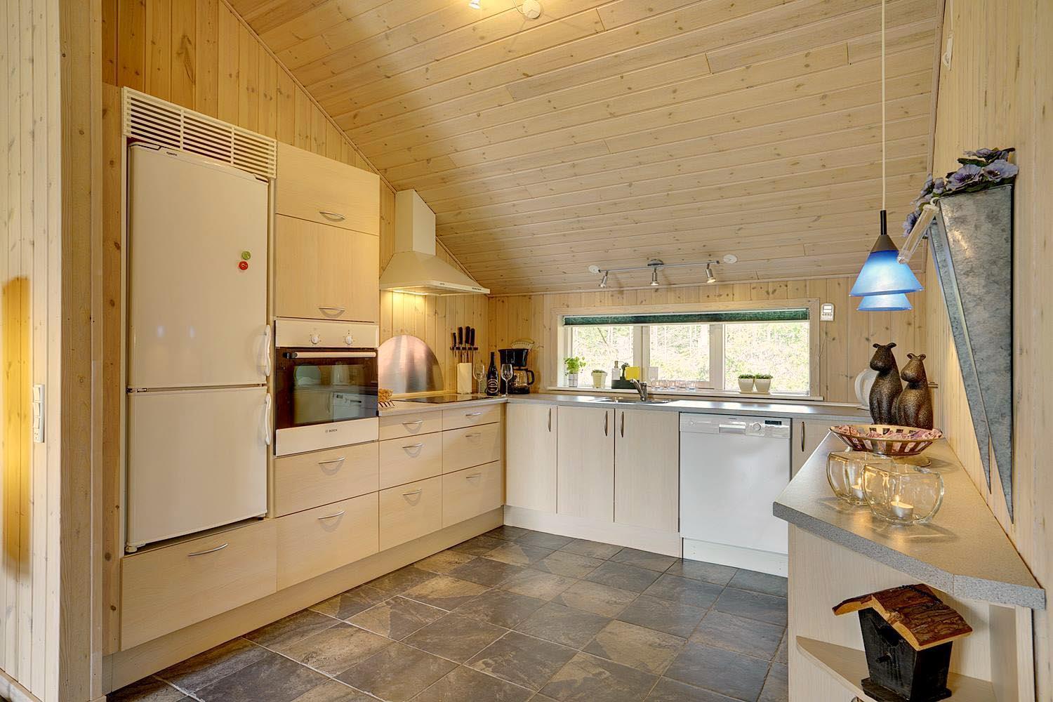 Husets hjerte er det indbydende opholdsrum, hvor stue og køkken smelter sammen i ét åbent og lyst fællesområde. Brændeovnen spreder varme og klassisk sommerhushygge på kølige dage, mens gulvvarme og varmepumpe sikrer et behageligt indeklima året rundt. Den åbne planløsning gør det nemt at være sammen – uanset om I slapper af i sofaen, spiller spil eller laver mad.