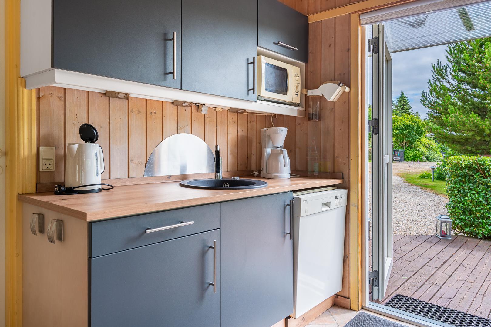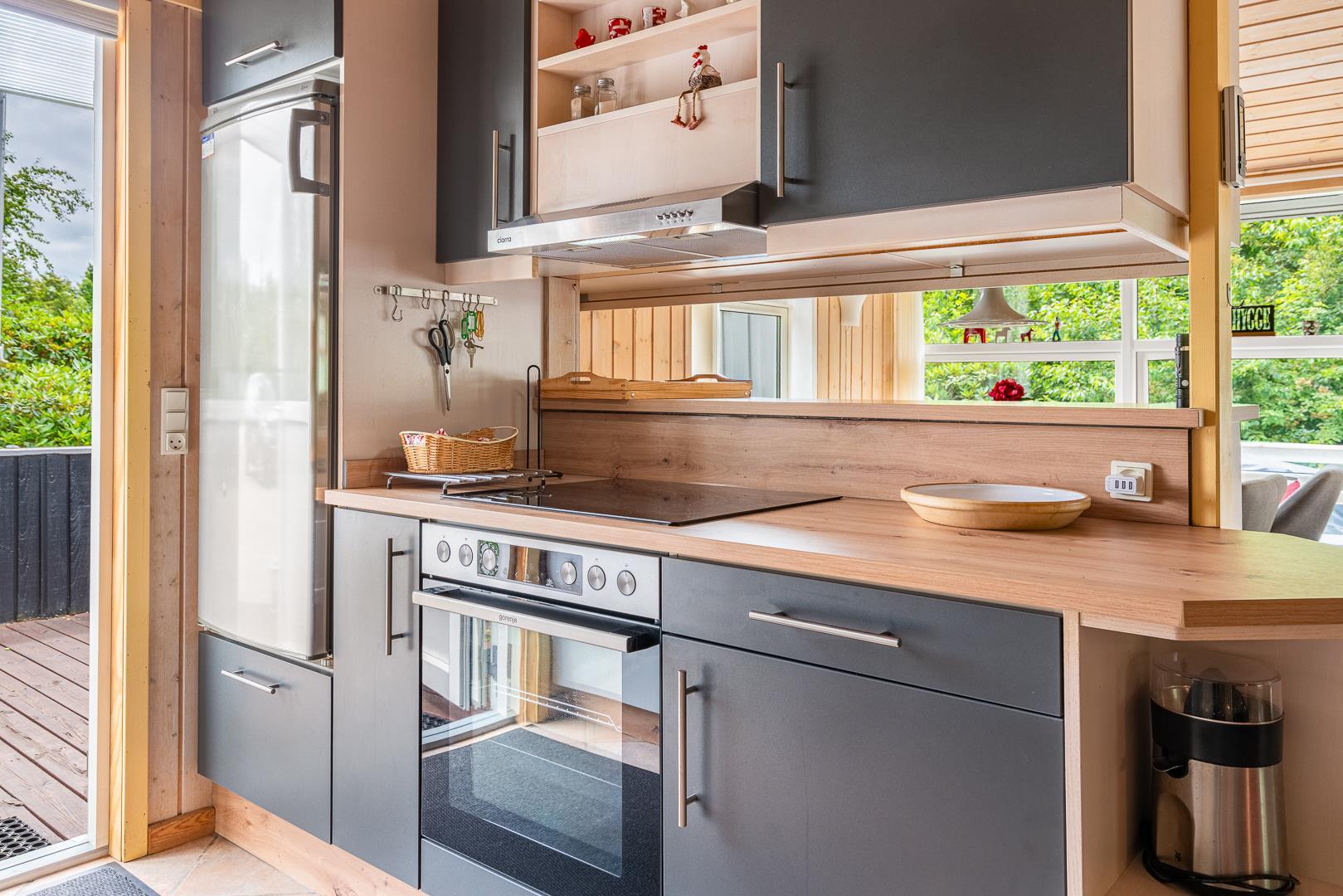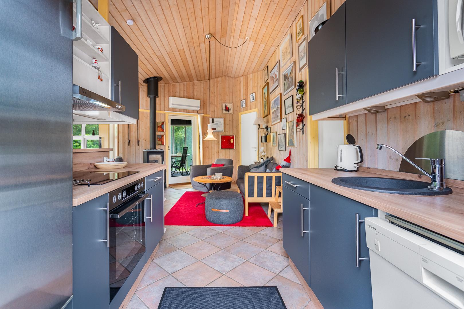 Det åbne køkken er veludstyret og har naturligvis opvaskemaskine – så der er mere tid til samvær frem for opvask.