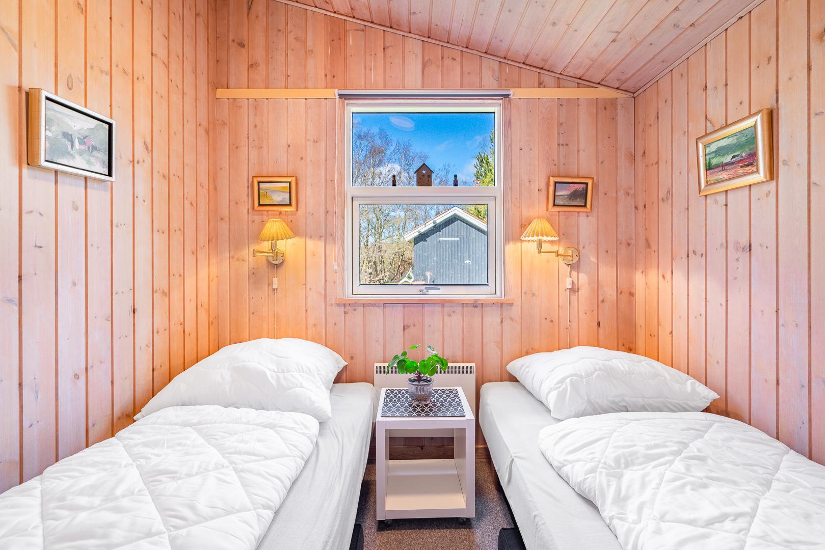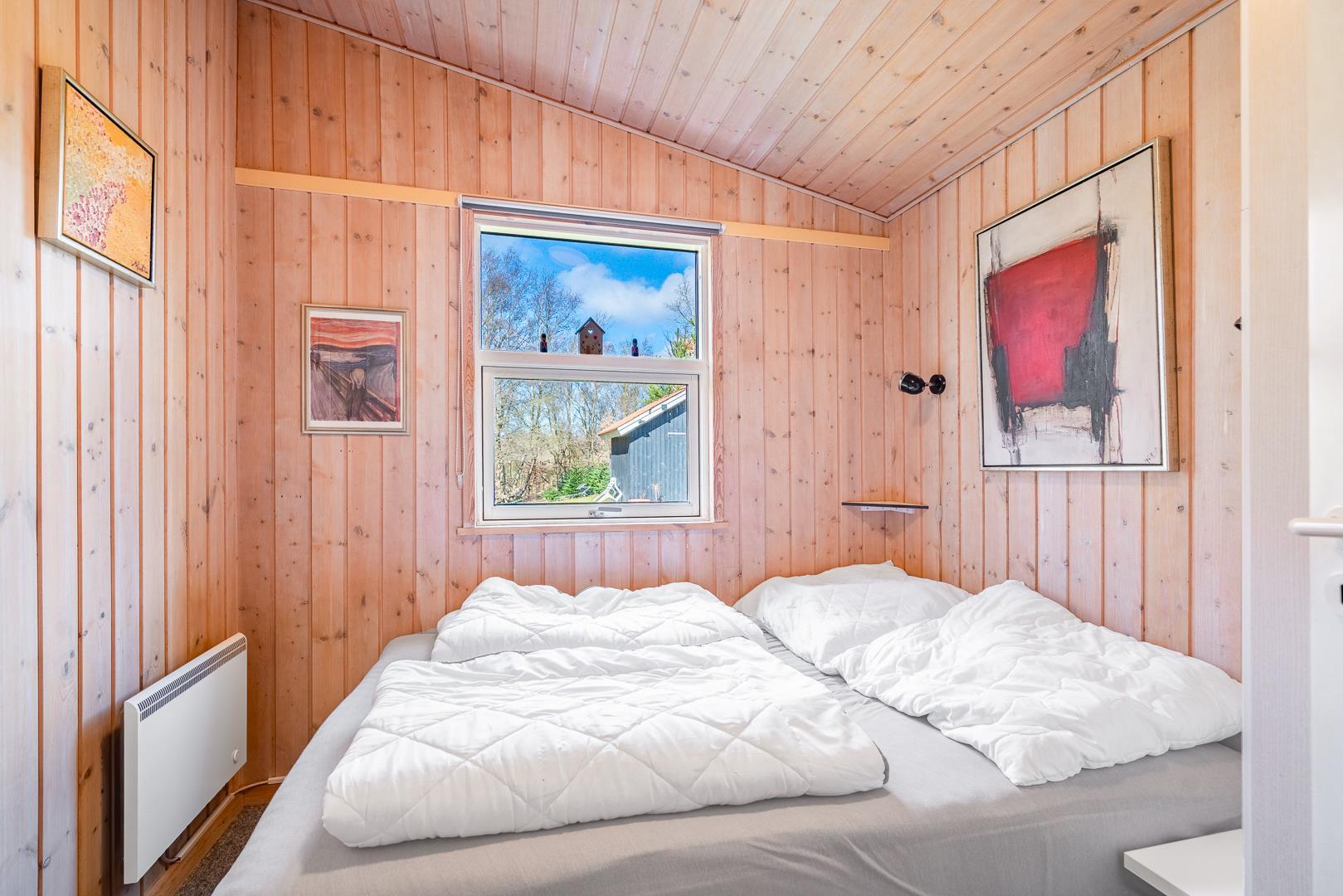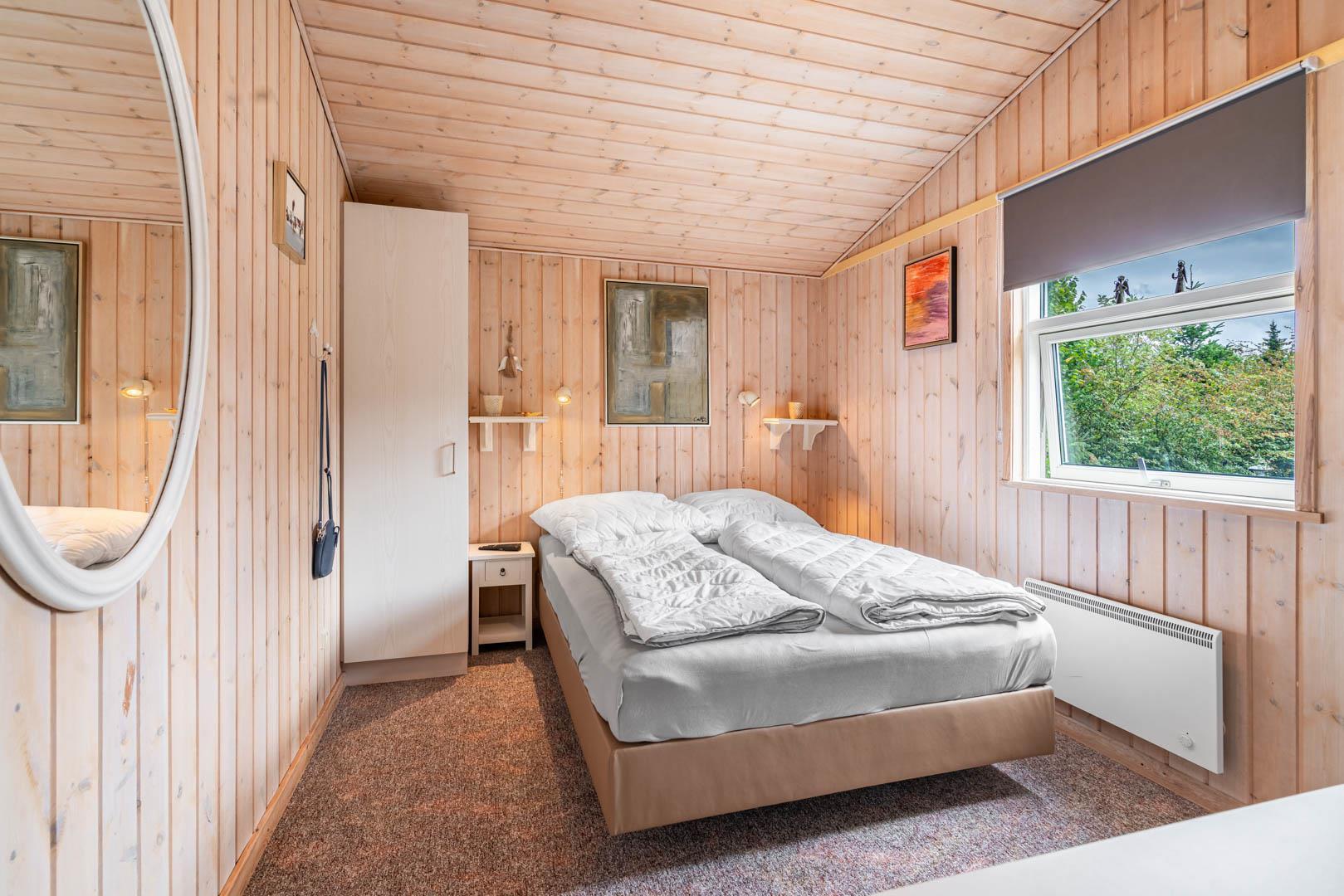 Sommerhuset har tre gode soveværelser: ét med dobbeltseng og to med hver to enkeltsenge – perfekt til børnefamilien. Badeværelset er moderne og byder på både spa og sauna – et lille wellness-paradis efter en dag i den friske luft.