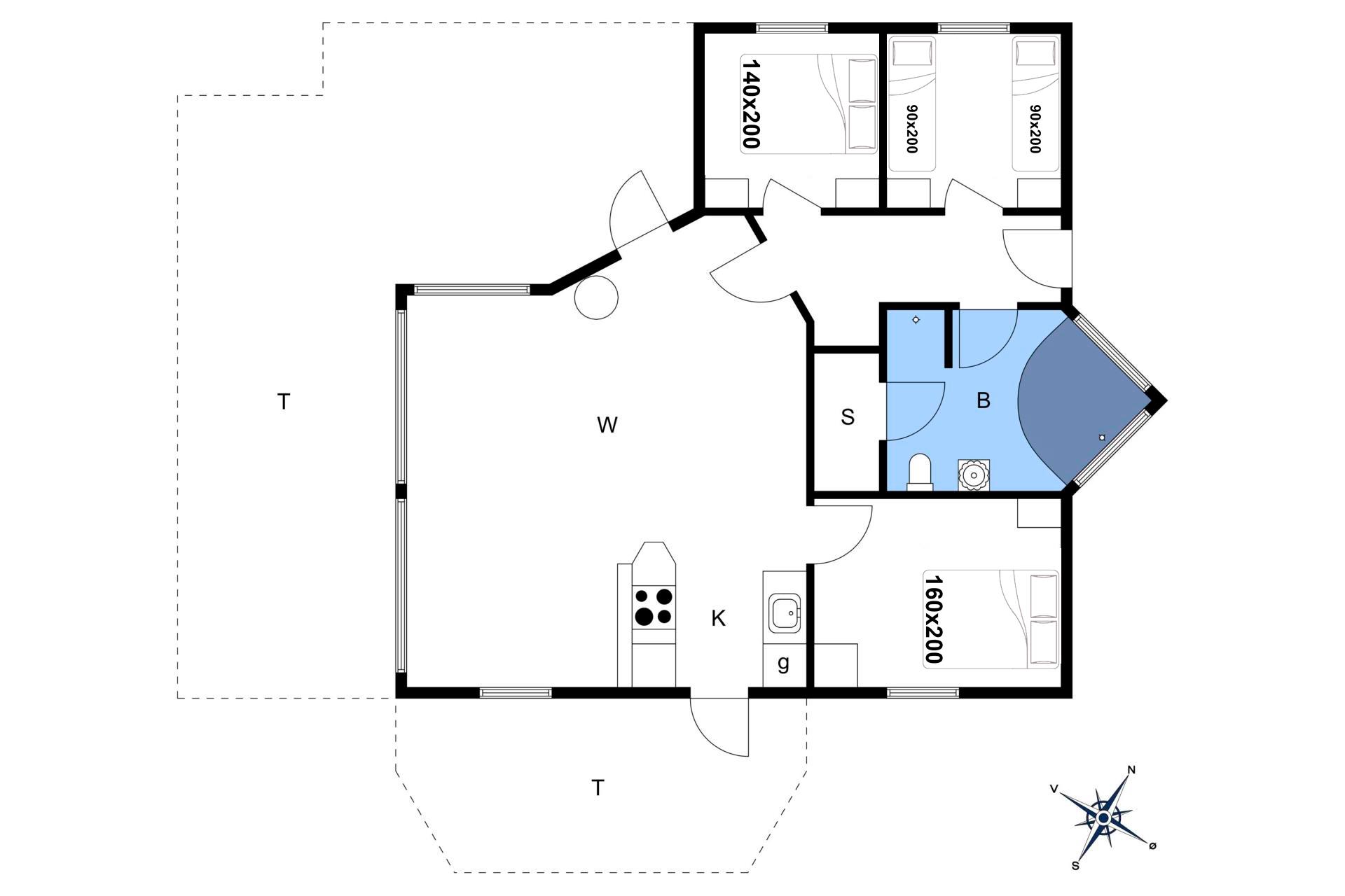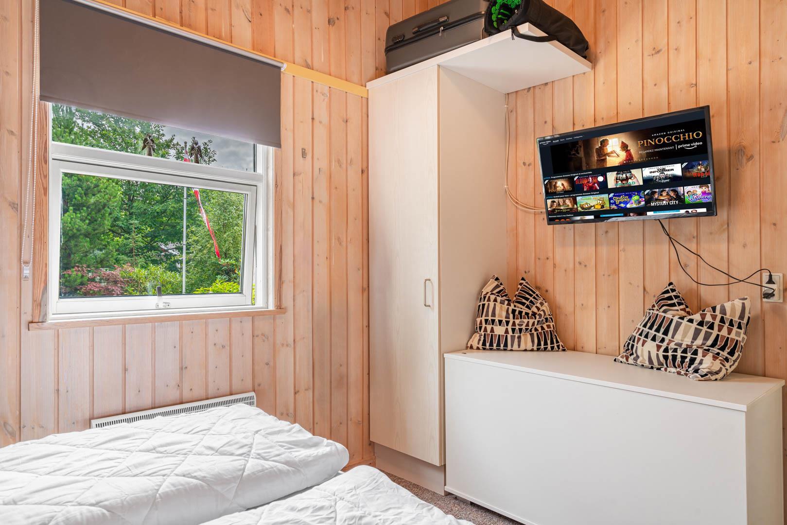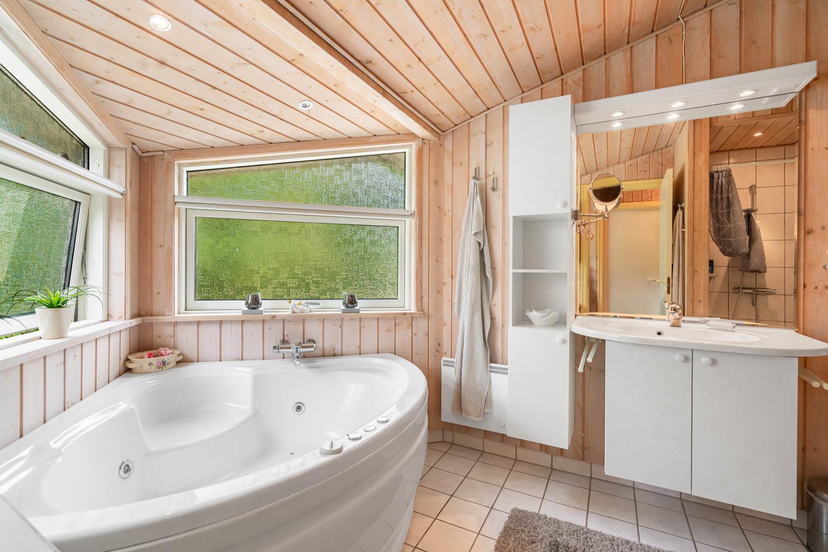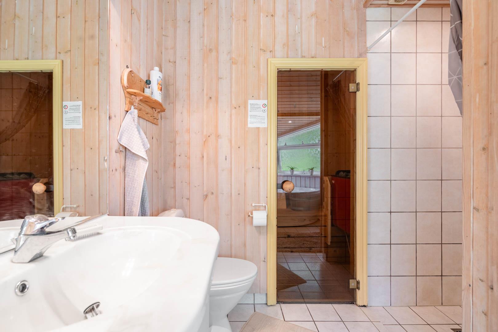 Sommerhuset har tre gode soveværelser: ét med dobbeltseng og to med hver to enkeltsenge – perfekt til børnefamilien. Badeværelset er moderne og byder på både spa og sauna – et lille wellness-paradis efter en dag i den friske luft.