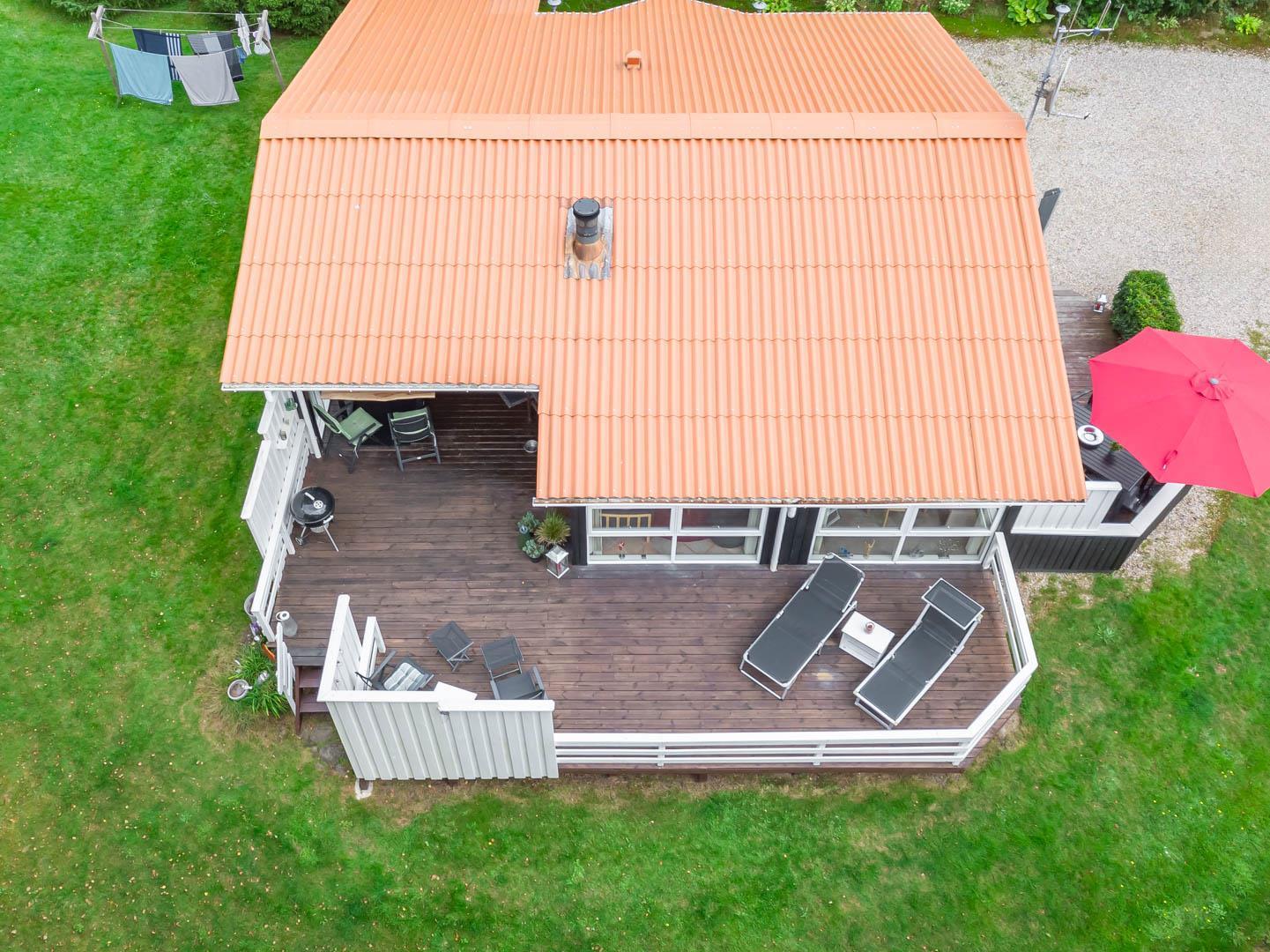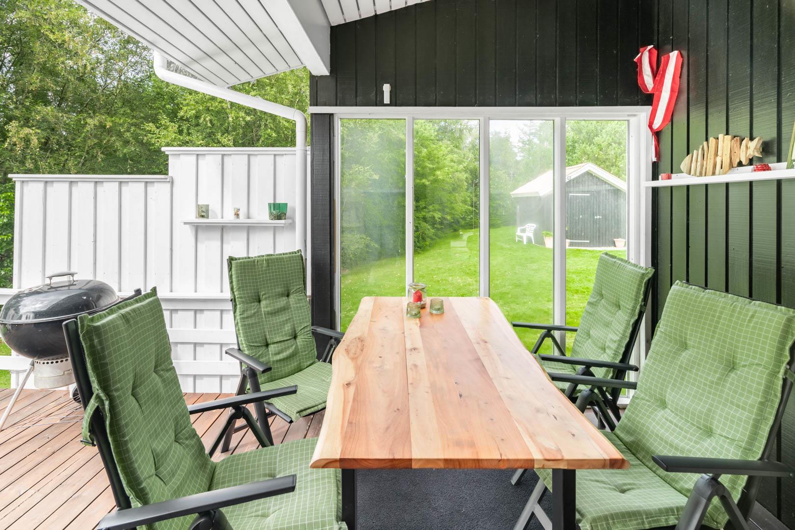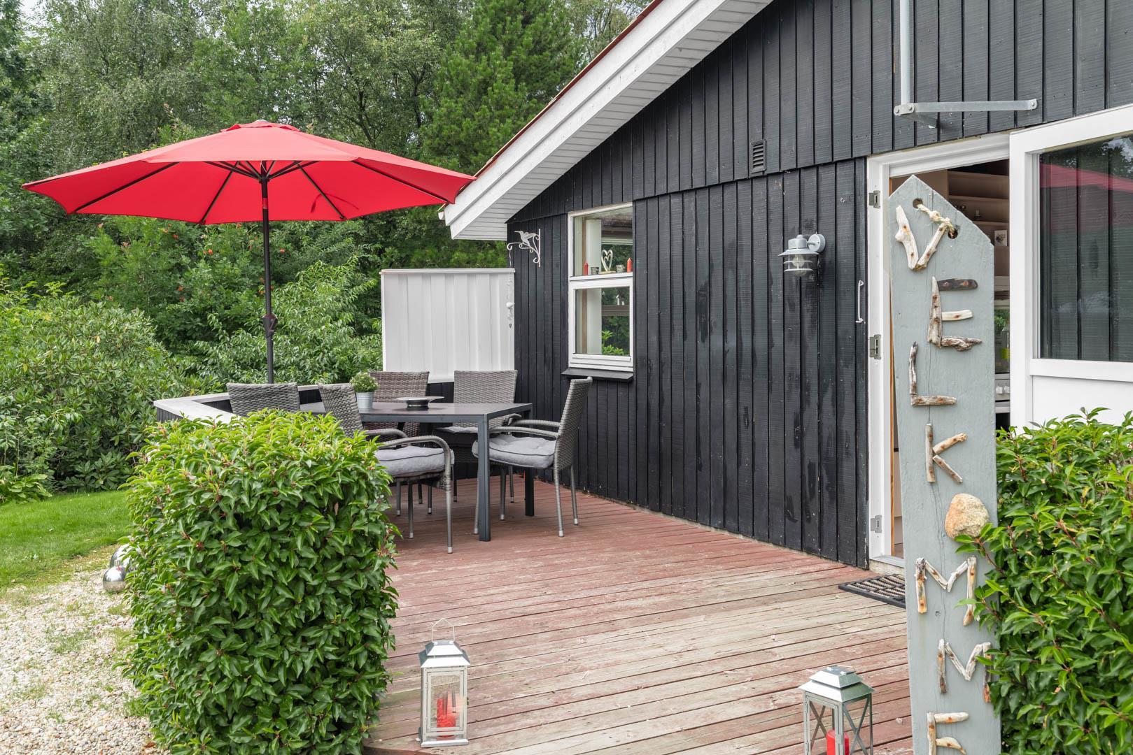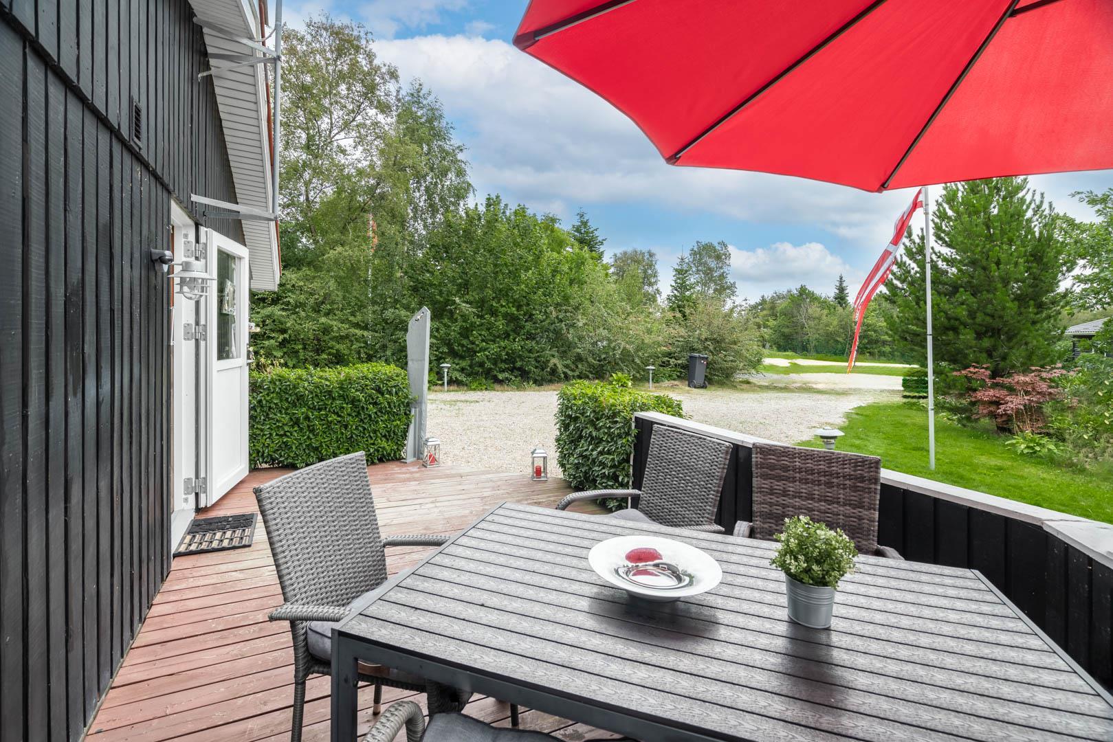 Terrassen er godt beskyttet mod vinden og indbyder til hyggelige grillaftener og fælles måltider i det fri. Haven omkring huset giver plads til leg, afslapning eller blot en stille stund med en god bog.