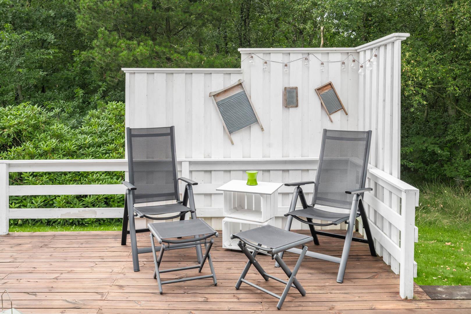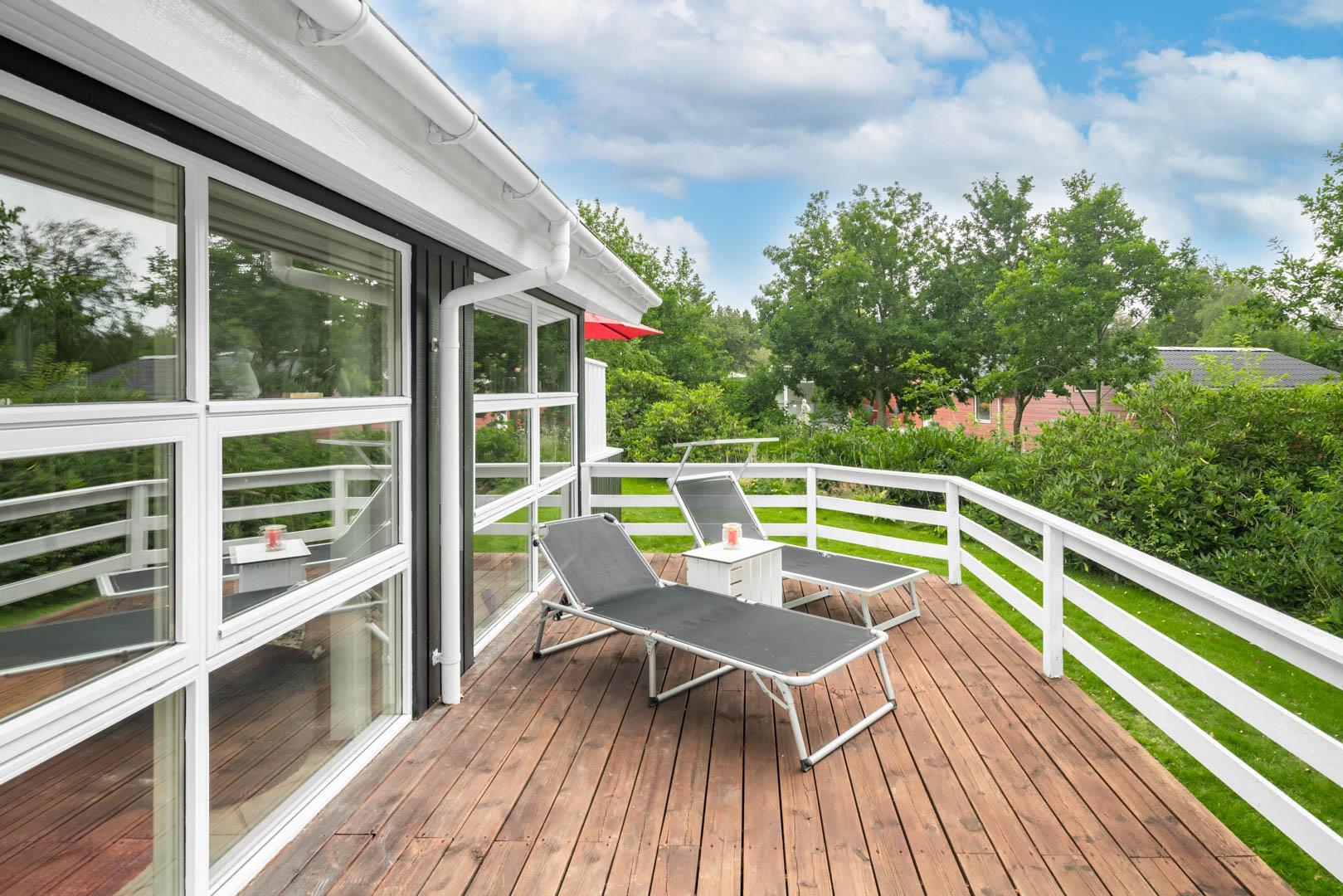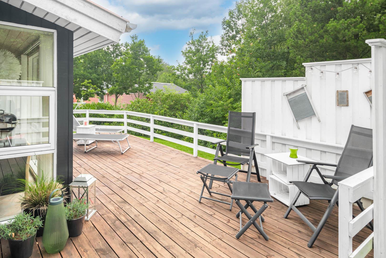 Udendørs venter en dejlig, lukket terrasse – ideel til både børn og hunde, der kan bevæge sig frit og sikkert, mens I nyder solen i liggestolene eller en kop kaffe i fred og ro.