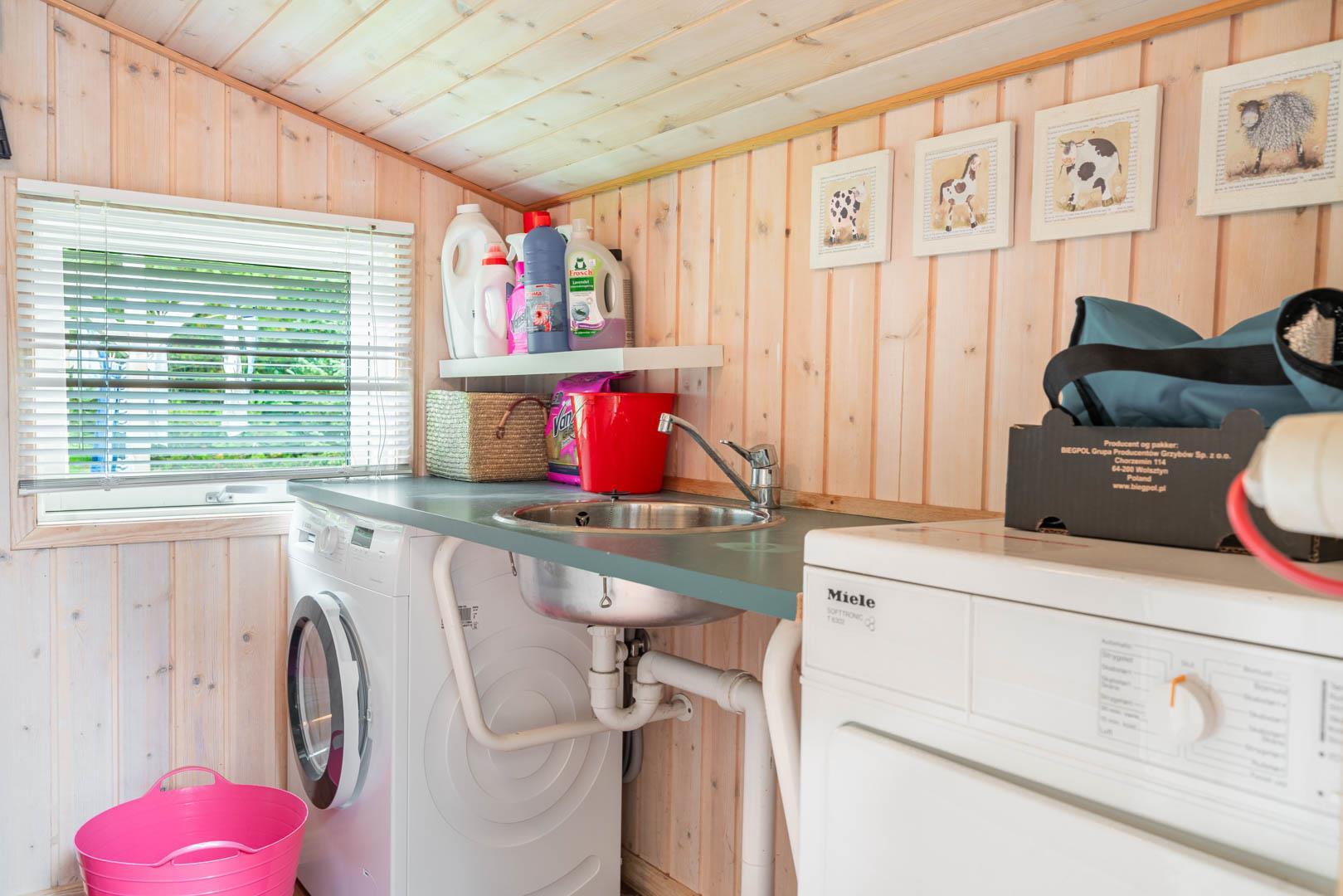 Der findes både vaskemaskine og tørretumbler – praktisk til længere ophold eller en dag ved stranden.
