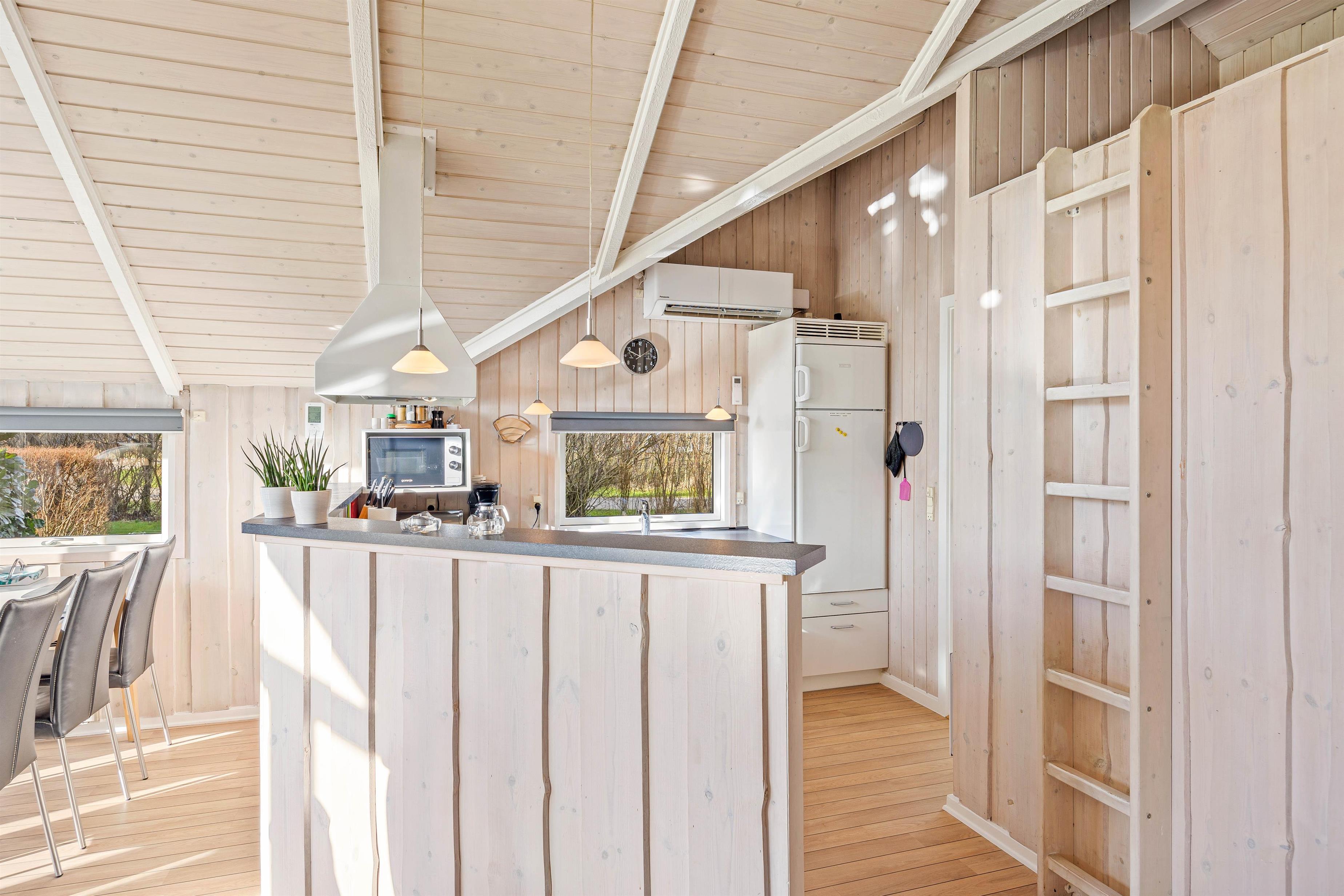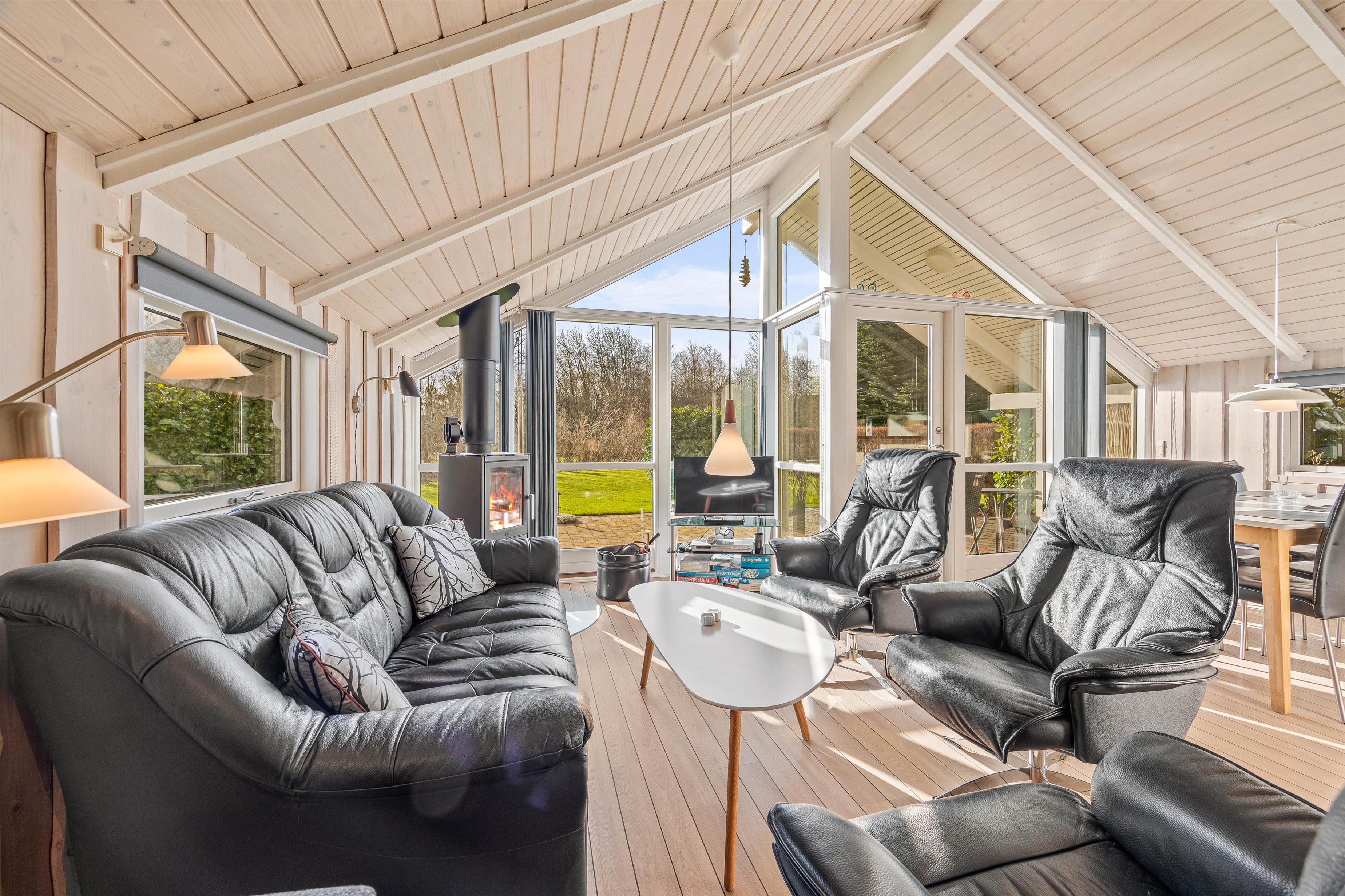 Det dejlige feriehus har en hyggelig opholdsstue, hvor I kan hygge jer i hinandens selskab – måske med et sjovt brætspil. Brændeovnen skaber en særlig hyggelig feriestemning med ildens knitren. I kan også bruge den energibesparende varmepumpe til at holde en behagelig temperatur i sommerhuset.
