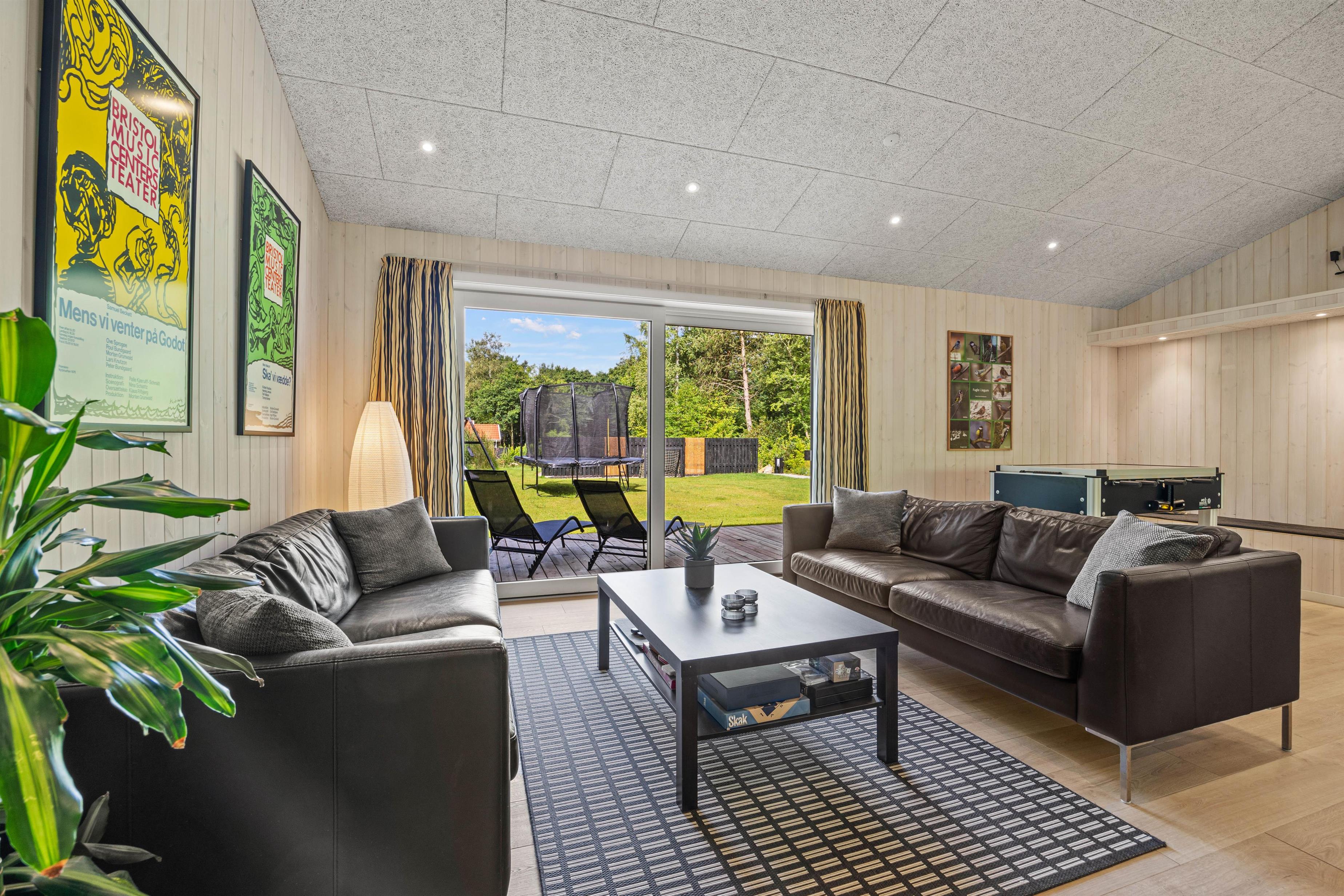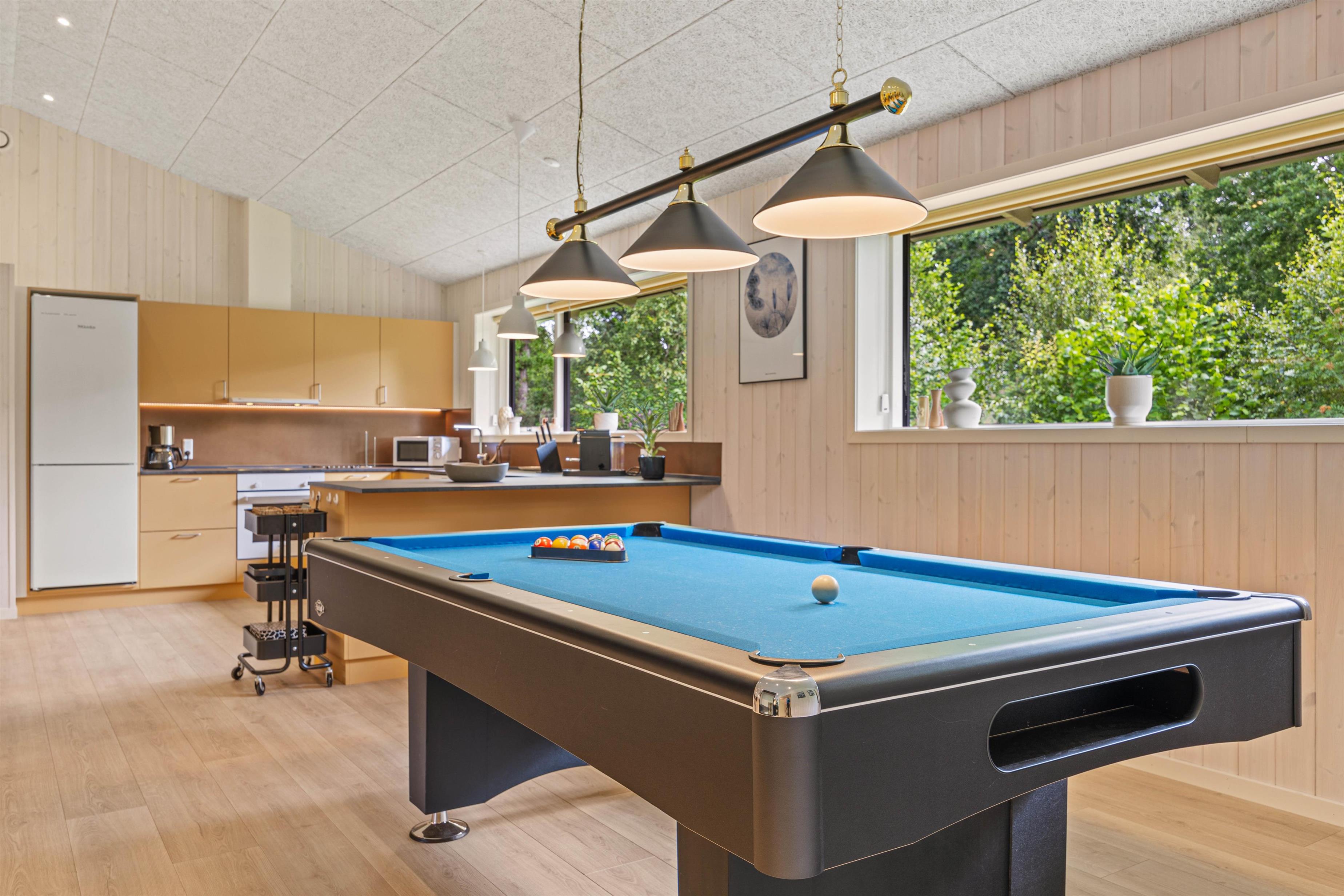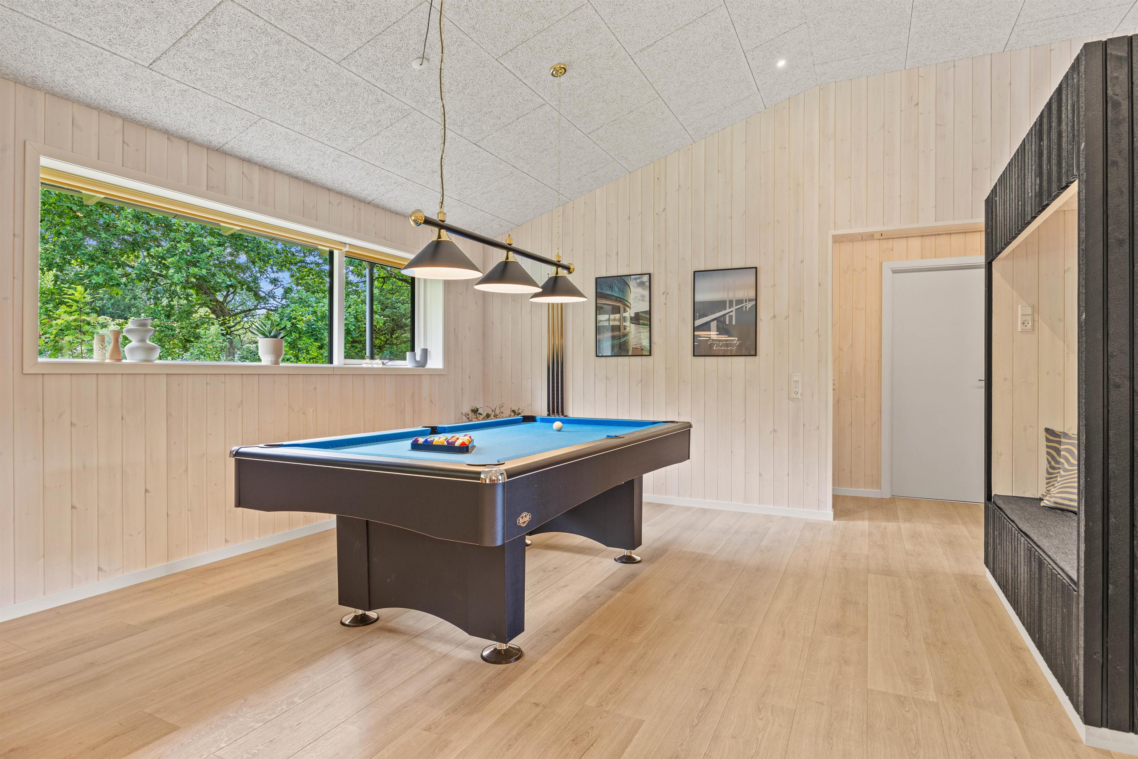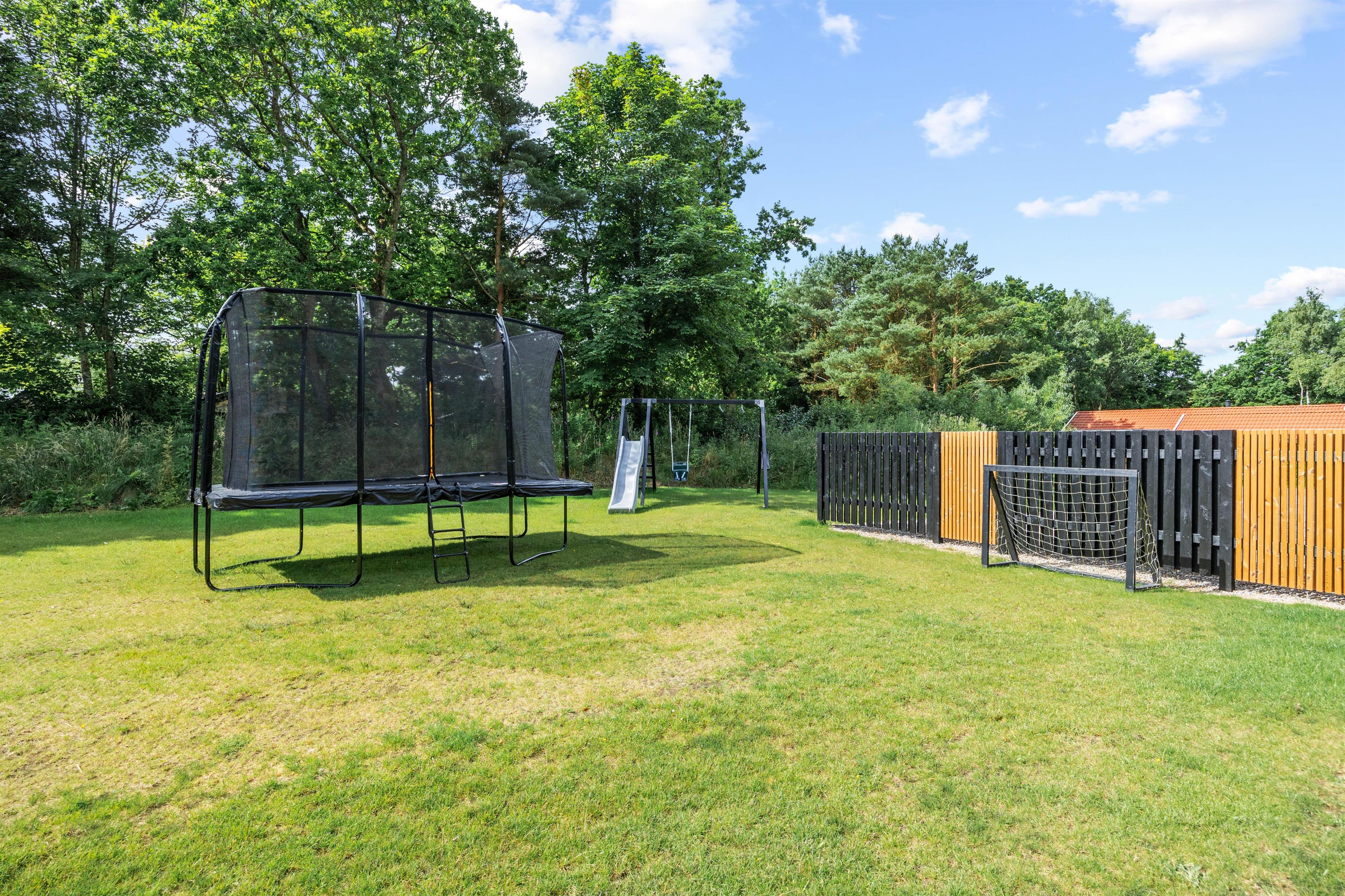 Sommerhuset er et aktivitetshus, fyldt med muligheder for underholdning for både børn og voksne. Prøv kræfter med et spil poolbillard, der inviterer til timevis af sjov og konkurrence. Udendørs er her en gynge, som sikkert vil være til glæde for børnene, mens trampolinen sørger for mange timers leg og latter. For de voksne kan den overdækkede terrasse med havemøbler danne ramme om hyggelige aftener. Det skønne vildmarksbad og den indbydende sauna tilbyder velværeoplevelser i særklasse, perfekte til afslapning og nærvær efter en dag fyldt med eventyr.