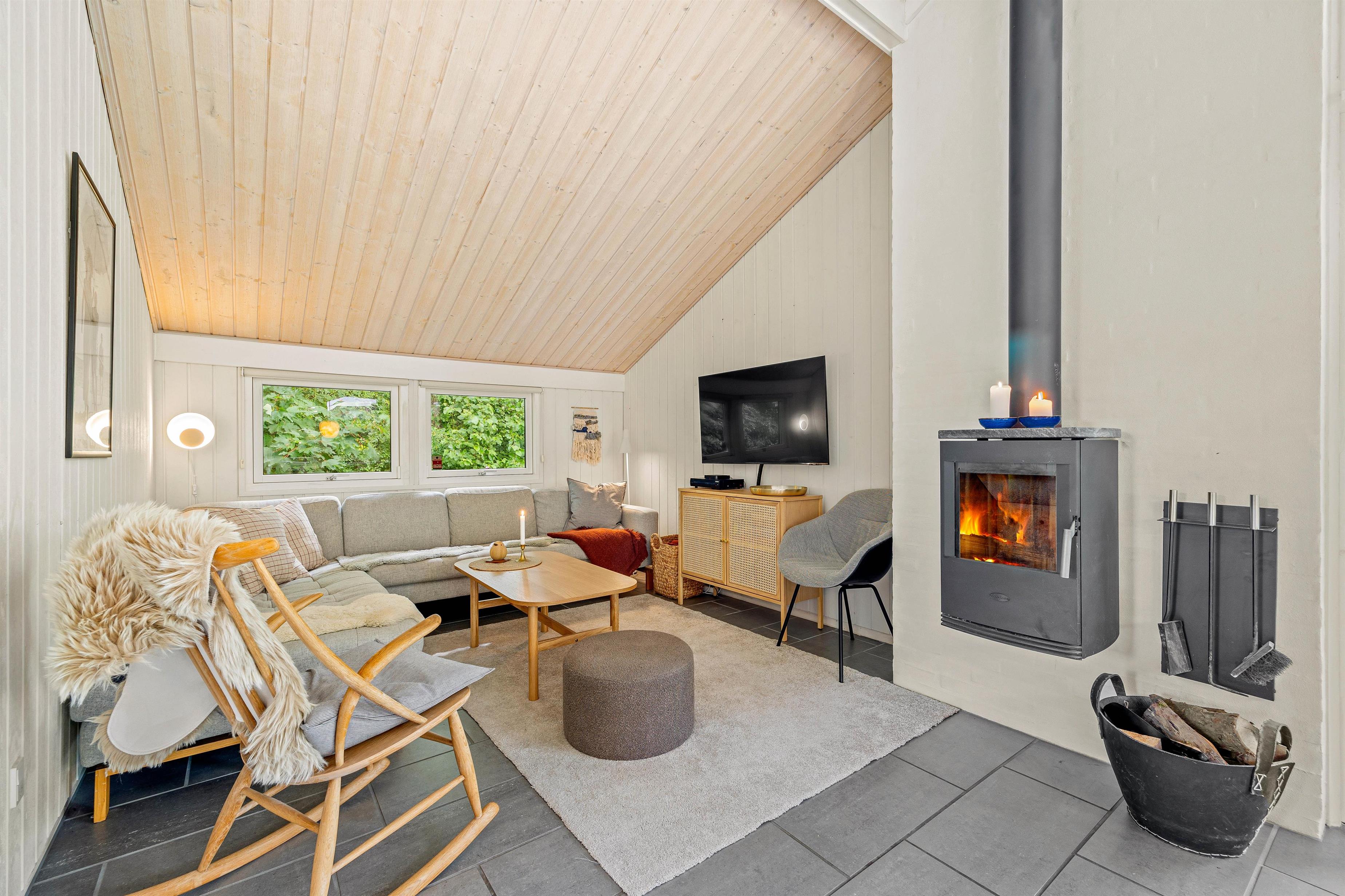 Indretningen er lys og indbydende med en åben planløsning, hvor køkken, spiseplads og stue smelter sammen i ét hyggeligt opholdsrum. Her kan I være sammen hele dagen – uanset om der laves mad, spilles spil eller hygges foran brændeovnen, som skaber både varme og stemning. Køkkenet er naturligvis udstyret med opvaskemaskine, så ferien kan nydes uden besvær.