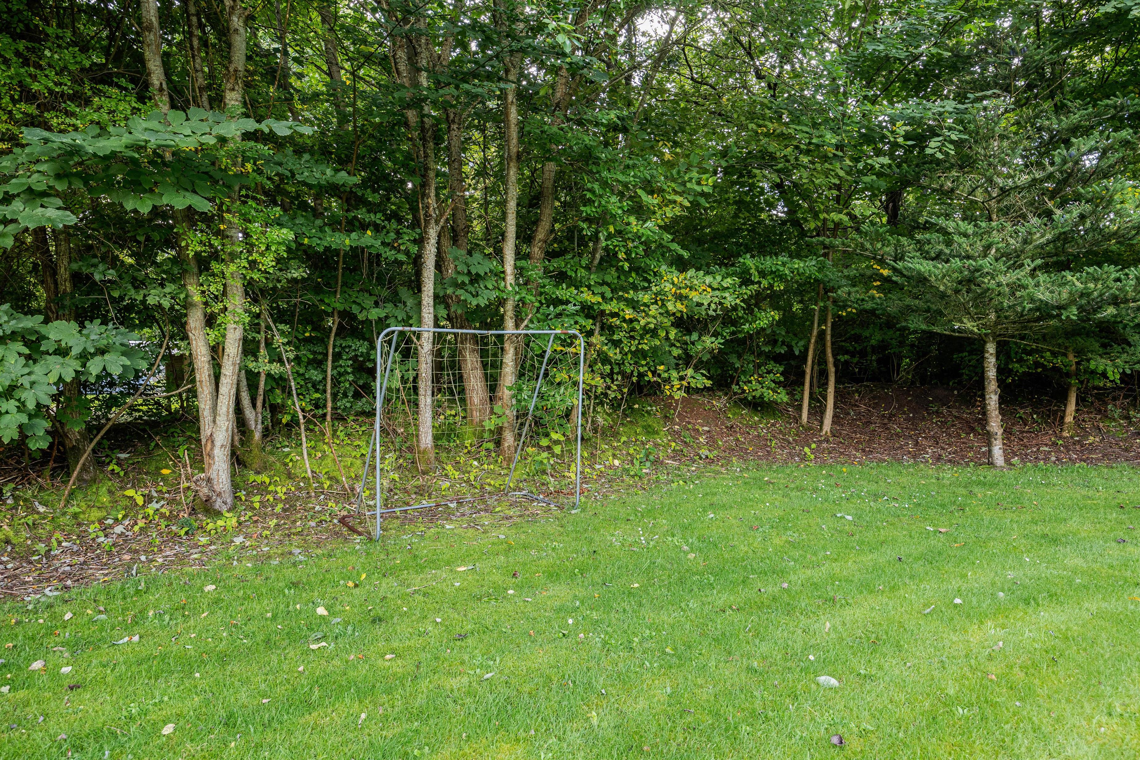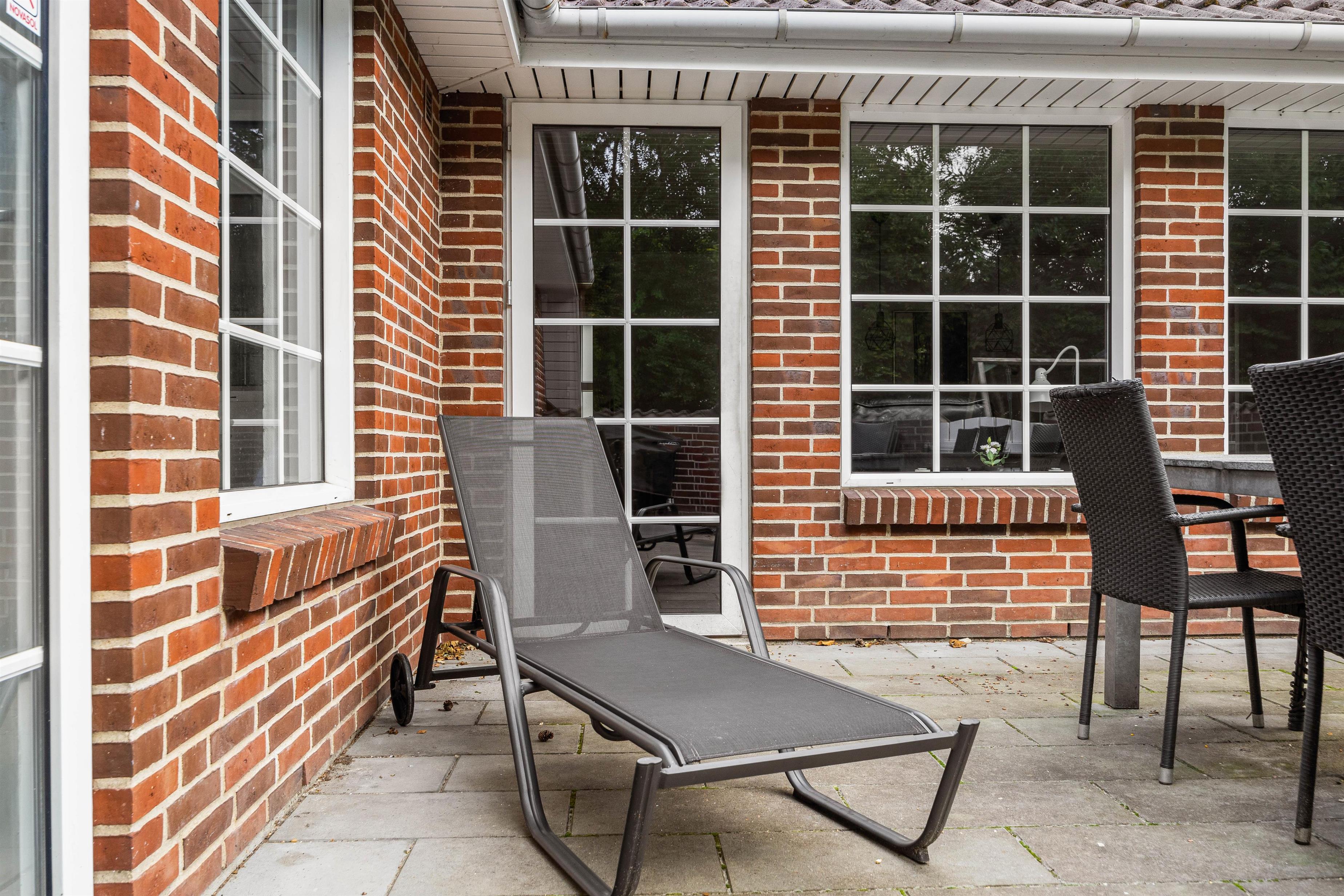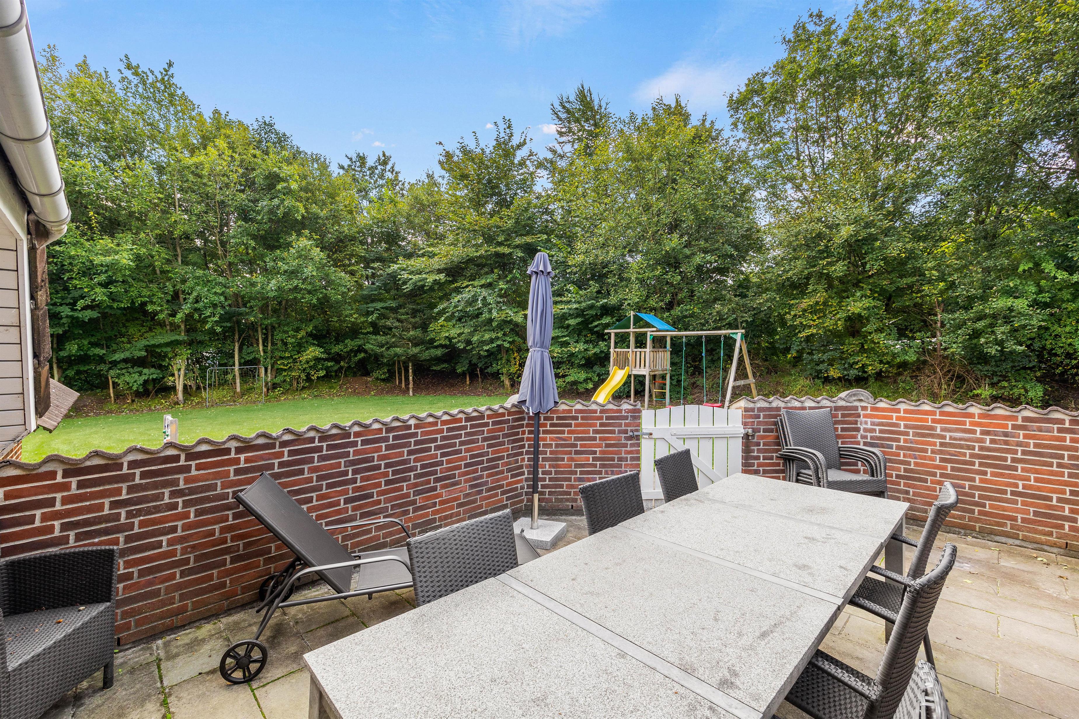 Fra opholdsrummet er der adgang til den indhegnede, flisebelagte terrasse. Her venter havemøbler og liggestolene på jer! Her kan I nyde en dejlig frokost i solen, solbade og lade børnene tumle rundt på den store plænegrund. Haven er helt perfekt til action og leg med både fodboldmål og legetårn med gynger og rutsjebane. Mens der leges, kan familiens grillmester tænde op i grillen. Slut den lune sommeraften af med en rigtig sommermenu.
