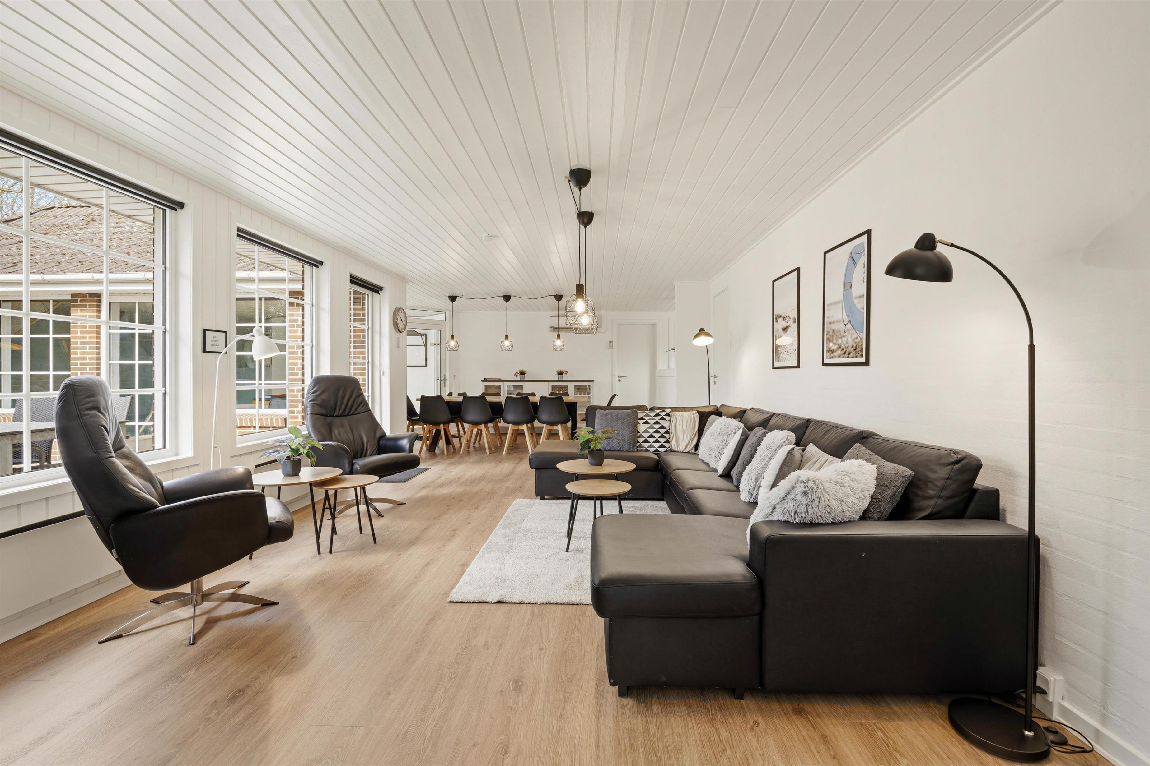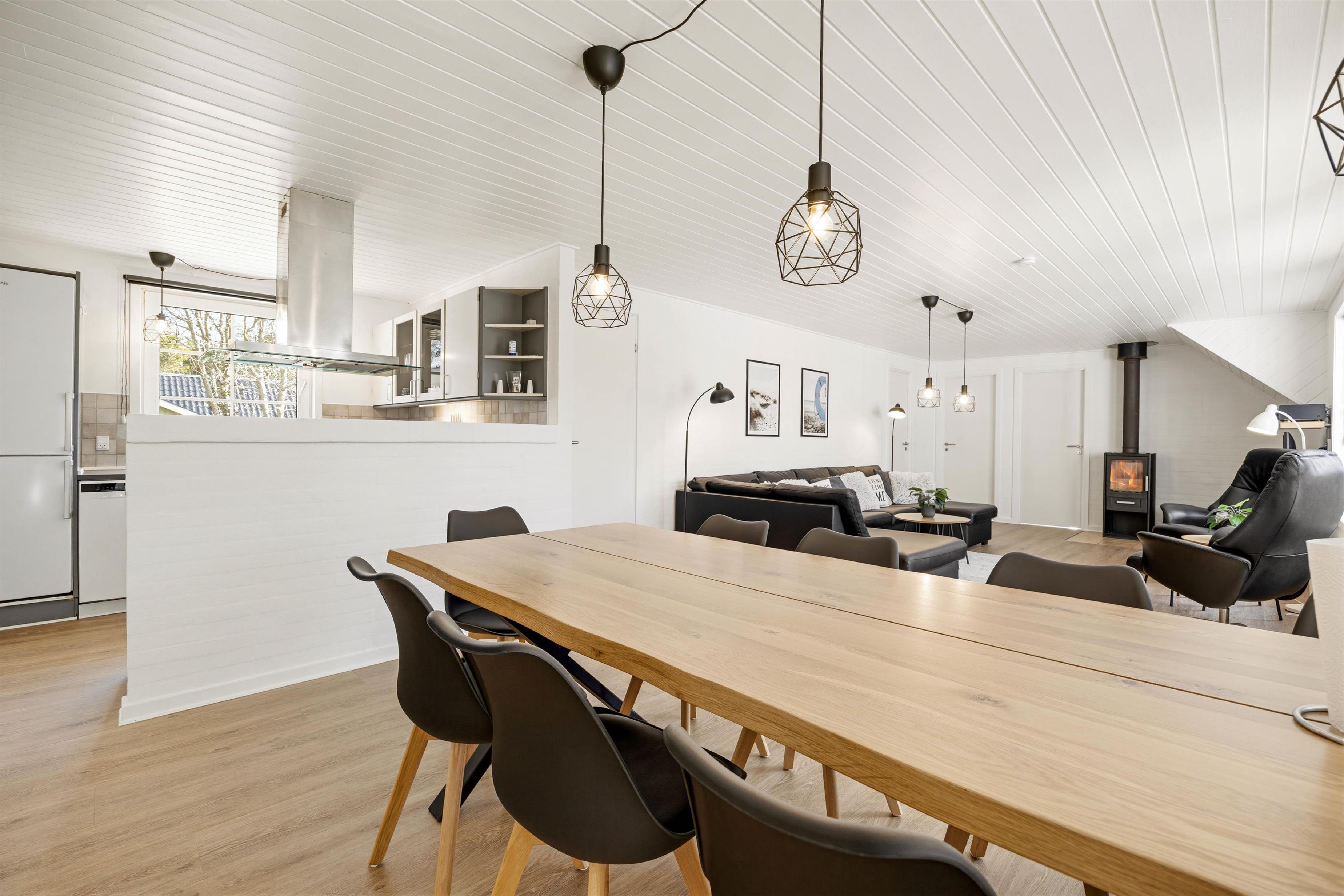 Højdepunkterne for dette dejlige feriehus er opholdsrummet, hvor stue og køkken er i åben forbindelse, og selvfølgelig poolrummet. Her er den 19 m2 store swimmingpool samt spa og sauna til afslapning. Her sætter fantasien kun grænser, og I er sikret mange dejlige stunder uanset vind og vejr. Efter en lang dag i poolen, kan I alle samles omkring det lange spisebord. Lad opvaskemaskinen klarer oprydningen, mens I slænger jer i den komfortable sofa. Pop popcornene og se en god film, mens brændeovnens varme breder sig i rummet.