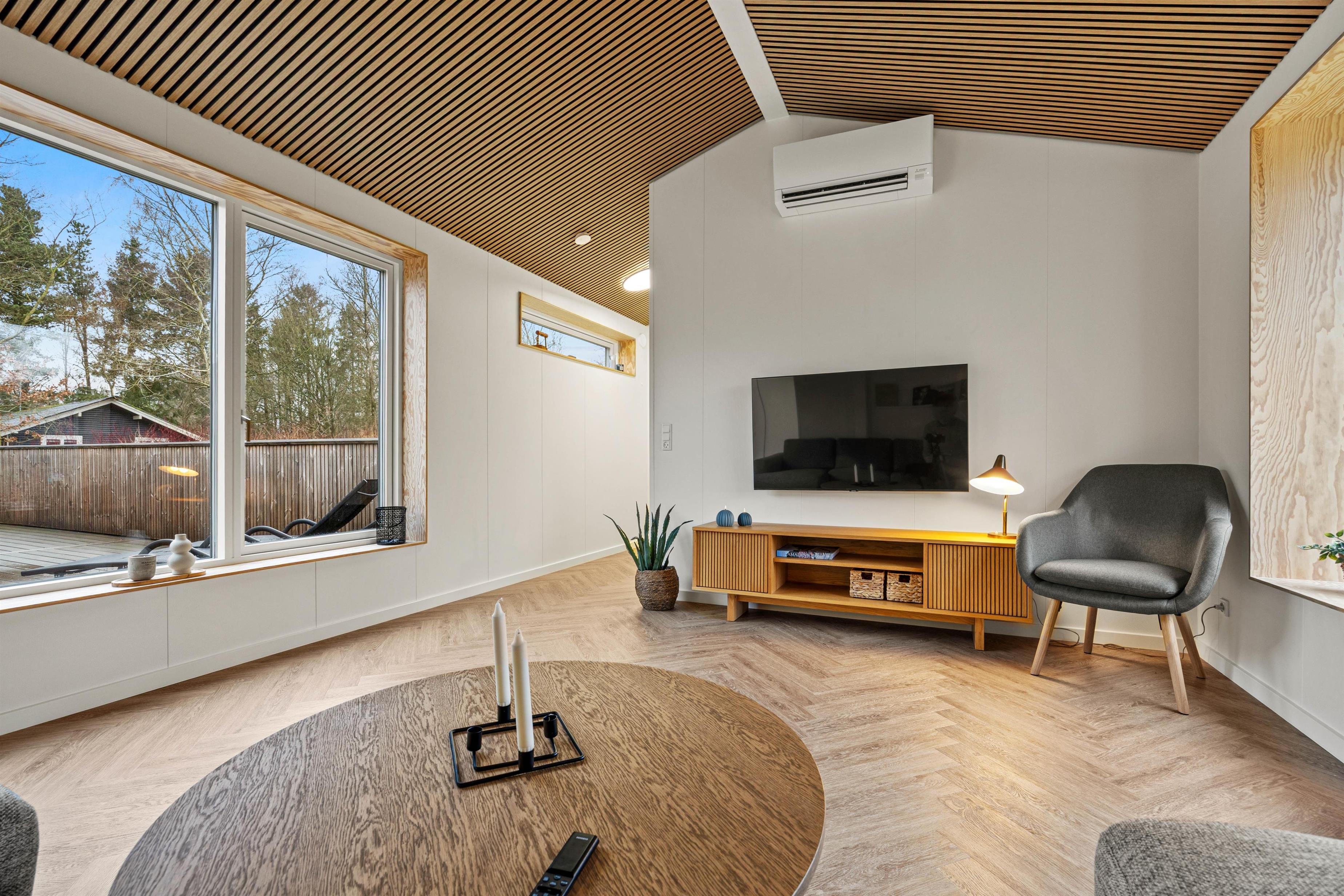 Badeværelset byder på et rummeligt bruseområde og god opbevaringsplads, så alle let kan dele faciliteterne. Her finder I også en vaskemaskine, som er praktisk til længere ophold. Den energivenlige luft-til-luft varmepumpe sørger samtidig for et behageligt og lunt indeklima – ideelt efter en dag ude i naturen.