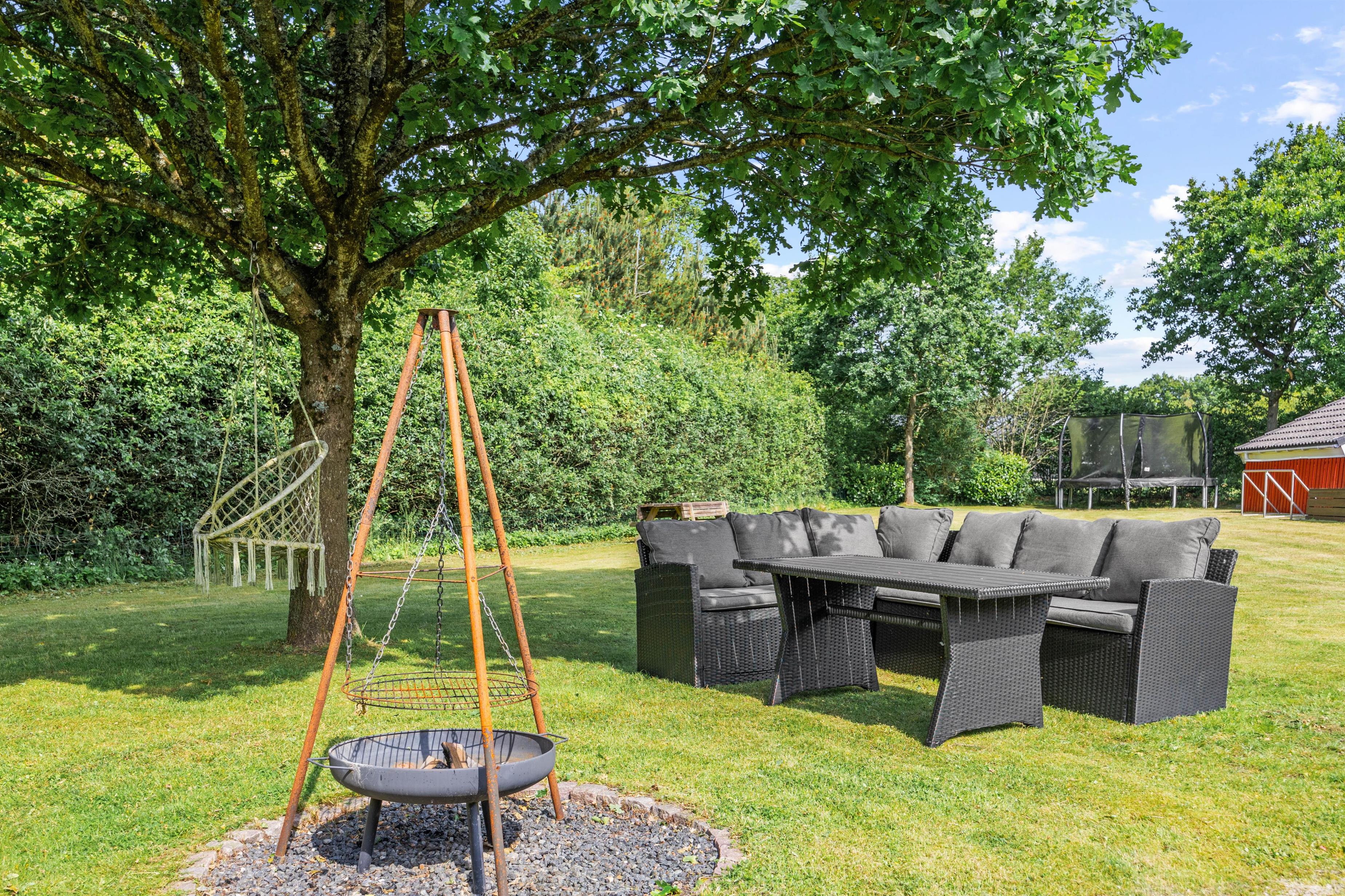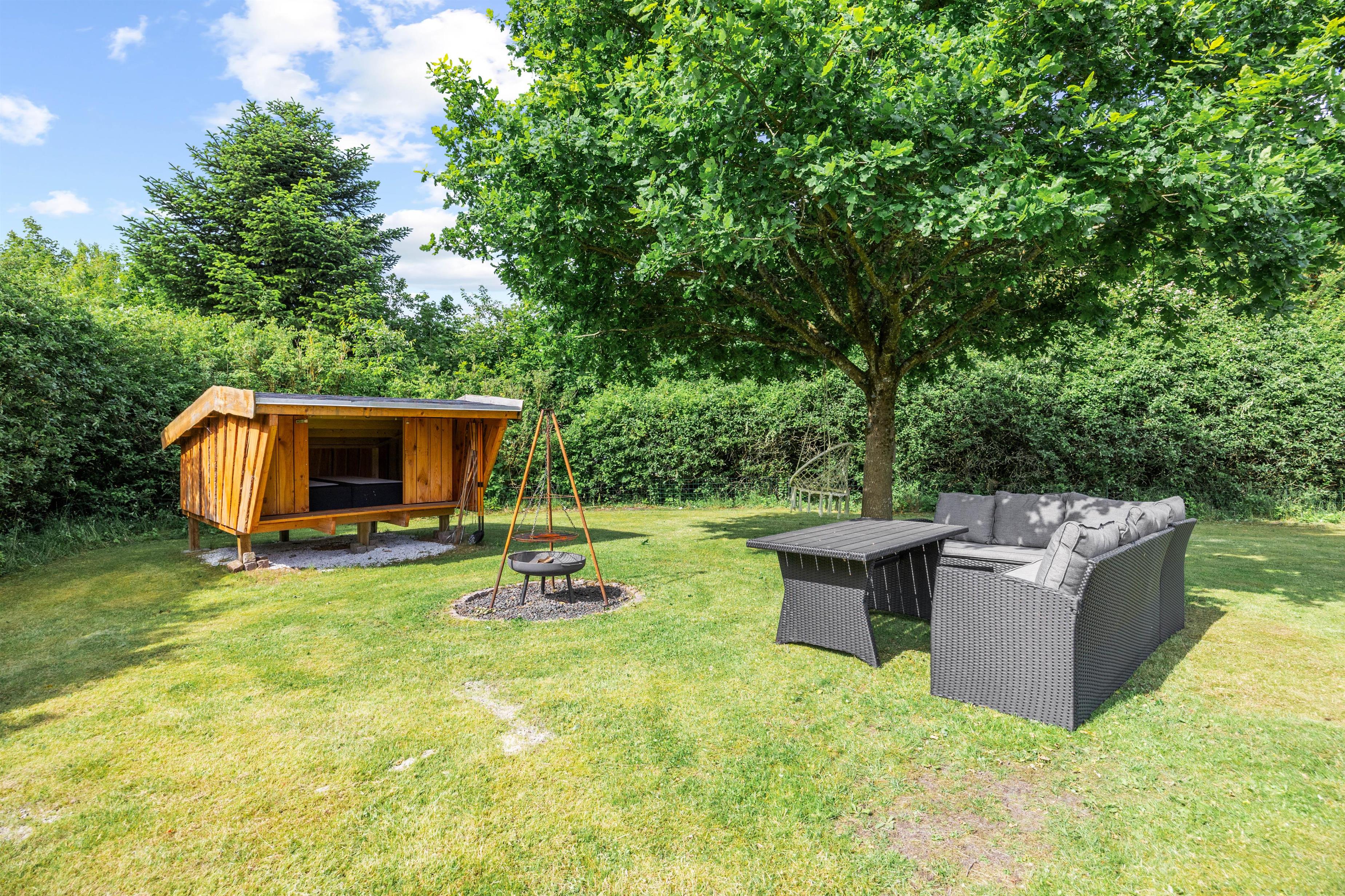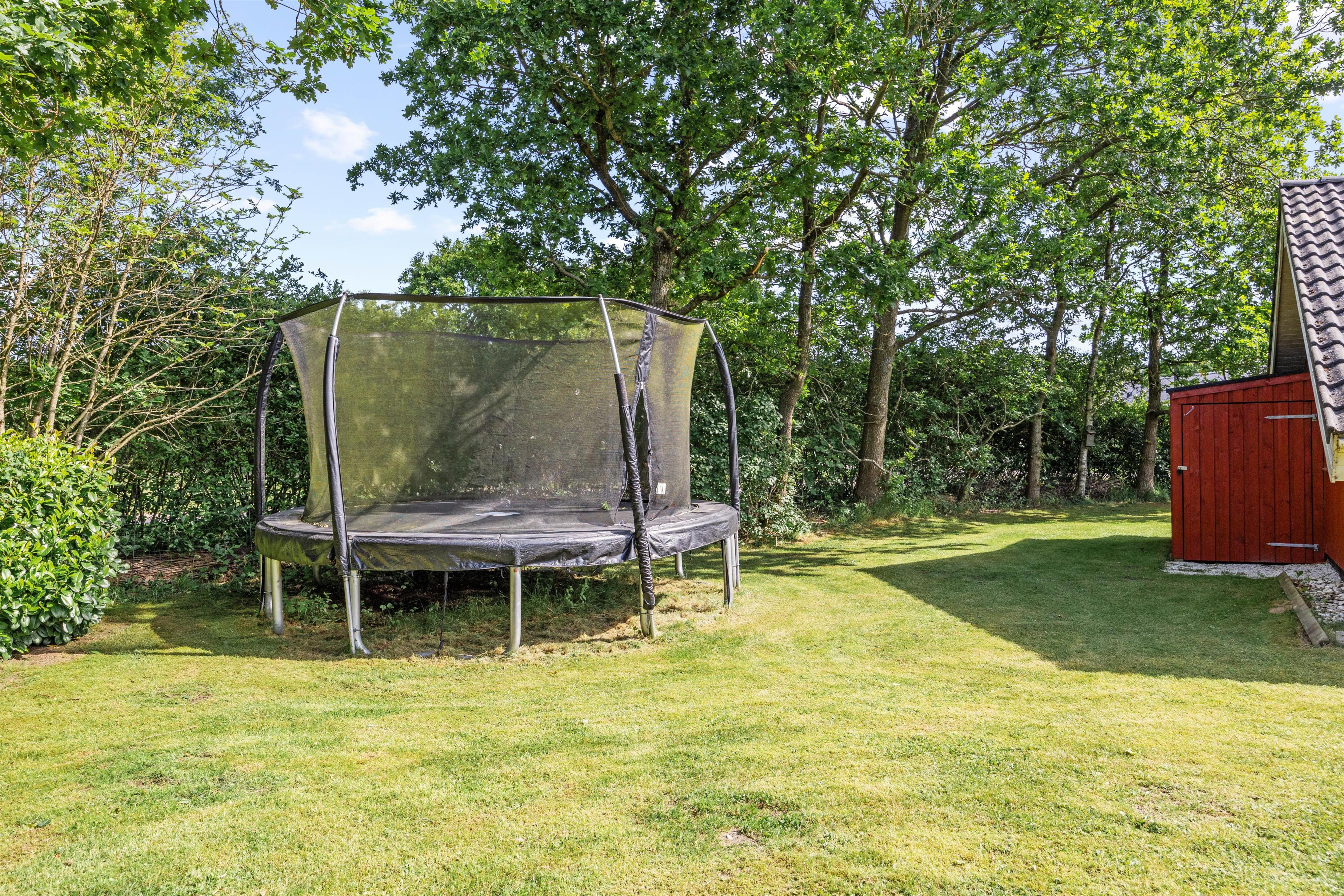 Udover indendørs komfort tilbyder sommerhuset fantastiske muligheder for udendørs aktiviteter. Sommerhuset ligger på en 1827m2 stor indhegnet grund, der er perfekt til at nyde det fri. Børnene kan more sig, da her både er gynge og trampolin, mens resten af familien nyder afslappende aftener på terrassen, der er udstyret med en grill. Havemøblerne inviterer til både middagsselskaber og stille stunder med en bog eller podcast. Plænegrunden er ideel til spil og leg, og jeres hund er også velkommen, så hele familien kan være samlet. Om aftenen kan I gå til ro shelteren og nyde en overnatning i det fri. Skulle I eje el-bil, er her et praktisk ladestik til rådighed, så I nemt kan oplade bilen under opholdet.