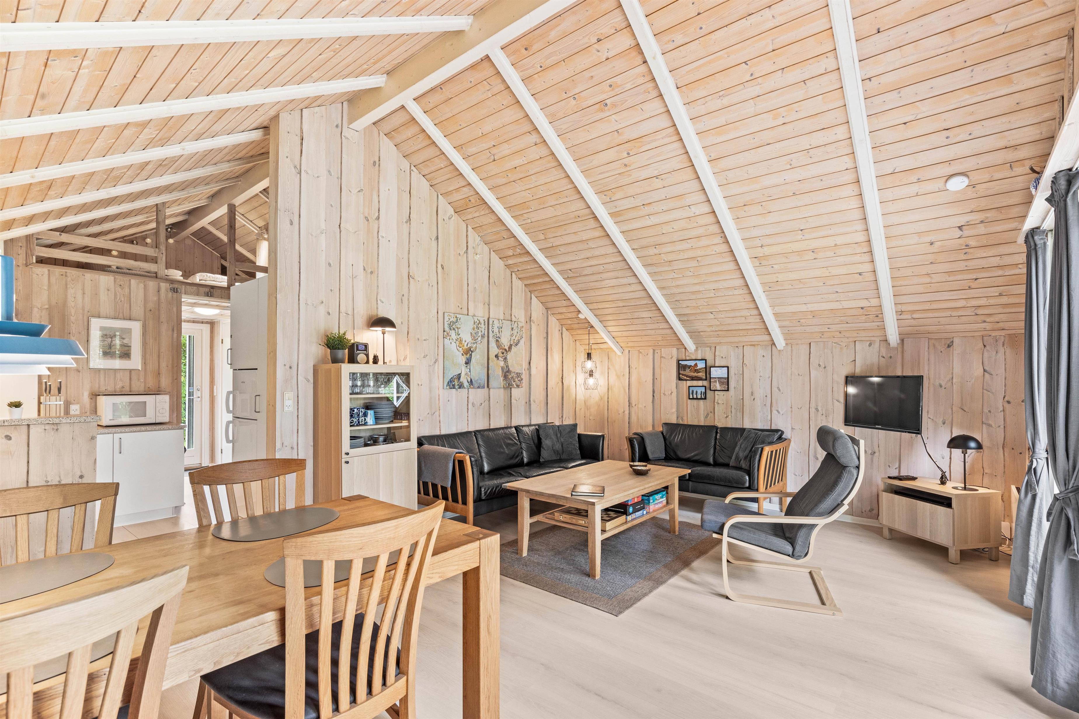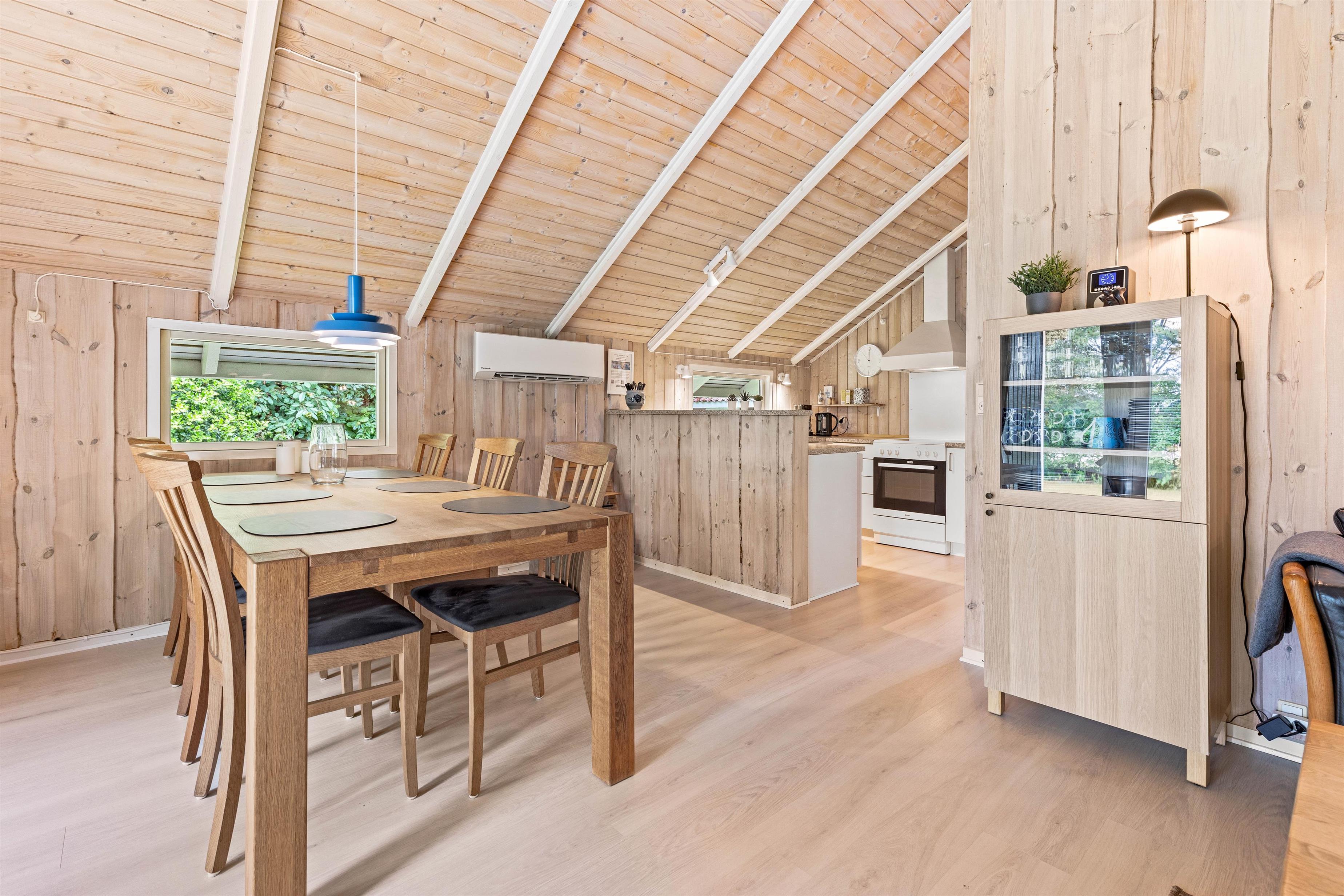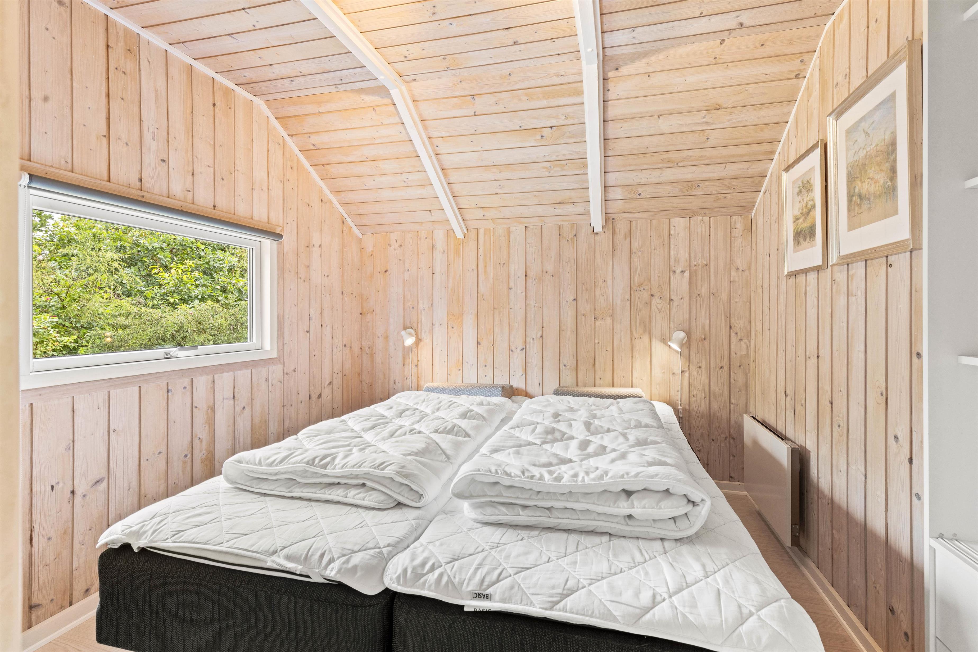 Sommerhuset er smagfuldt indrettet med lyse træpaneler i både opholdsrummene og soveværelserne, hvilket giver en varm og hyggelig atmosfære. Feriehuset byder på to komfortable soveværelser begge indrettet med dobbeltseng.
