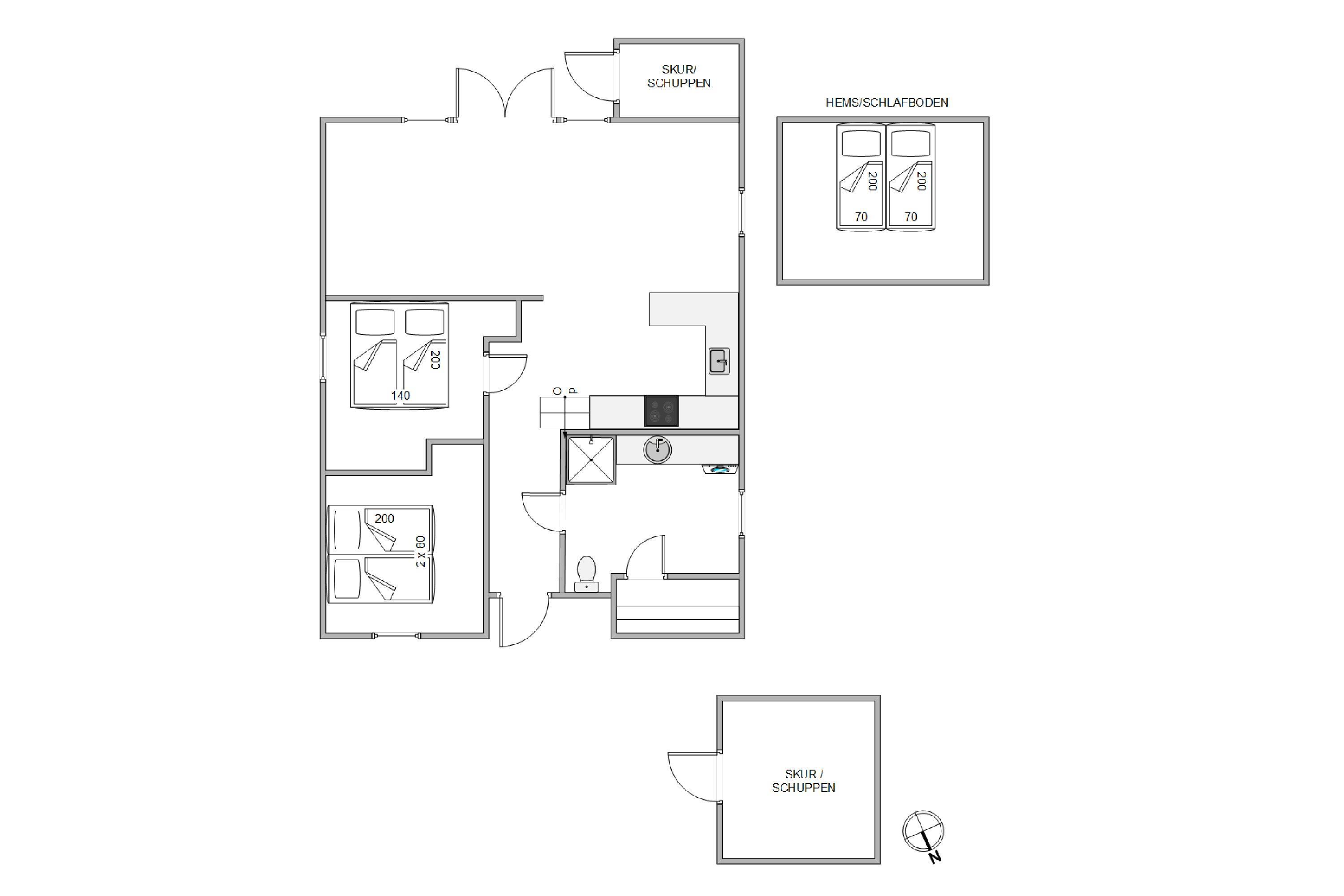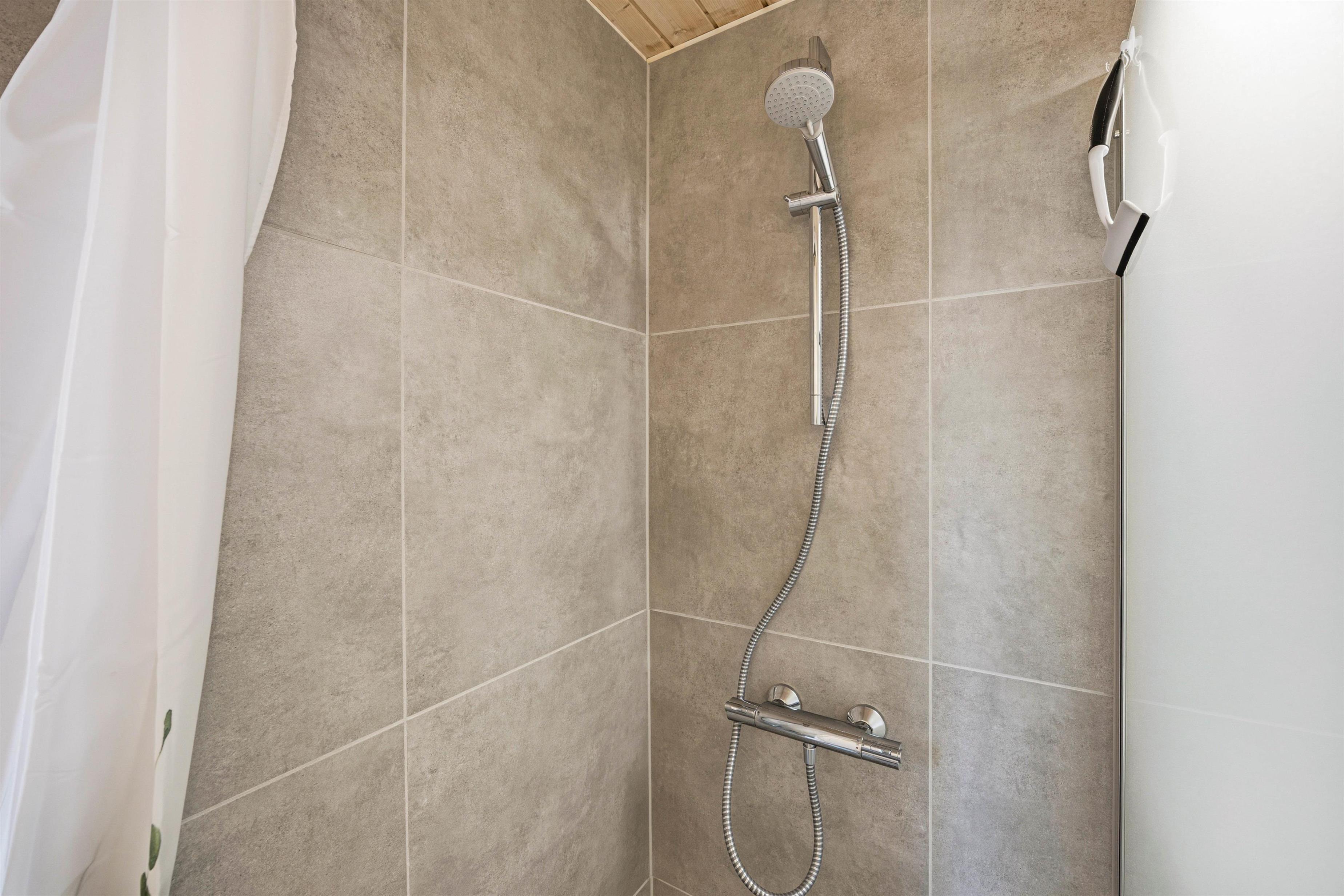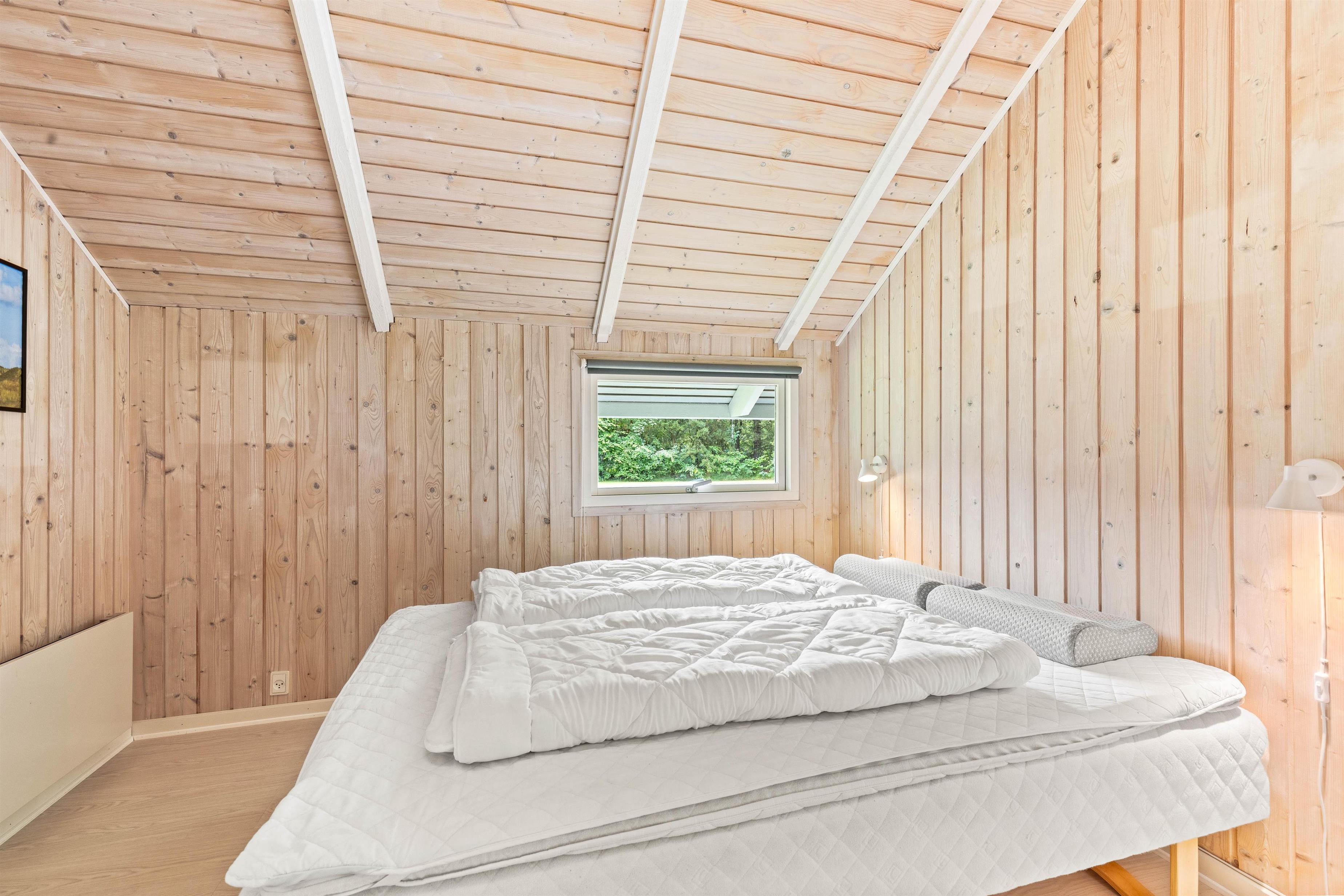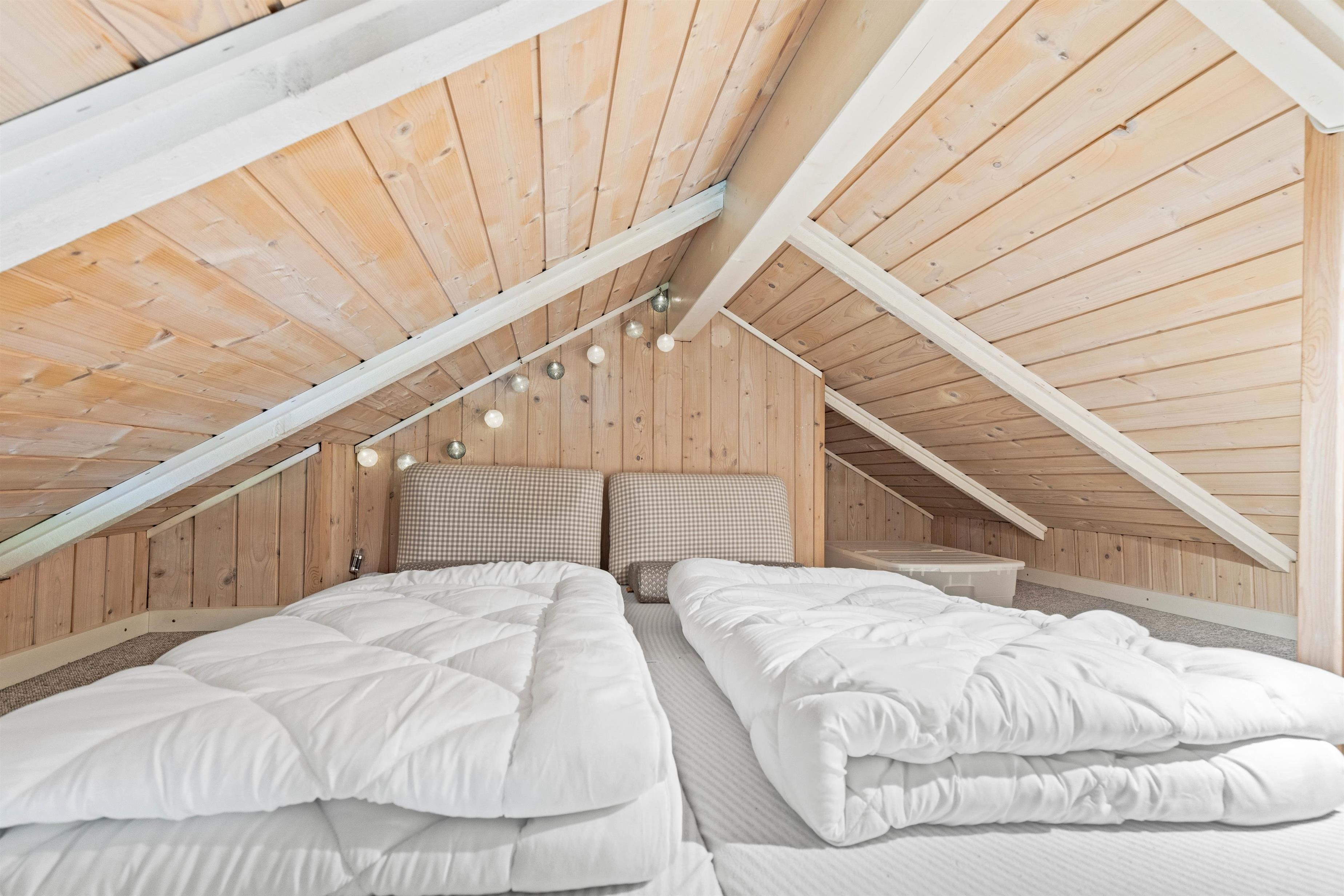 Derudover er der to sovepladser på sommerhusets hyggelige hems, hvor madrasserne giver børnene mulighed for at trække sig tilbage og finde en hyggelig krog. Feriehuset har også et badeværelse, der byder på en sauna, hvor I kan lade musklerne slappe af og nyde en beroligende pause.
