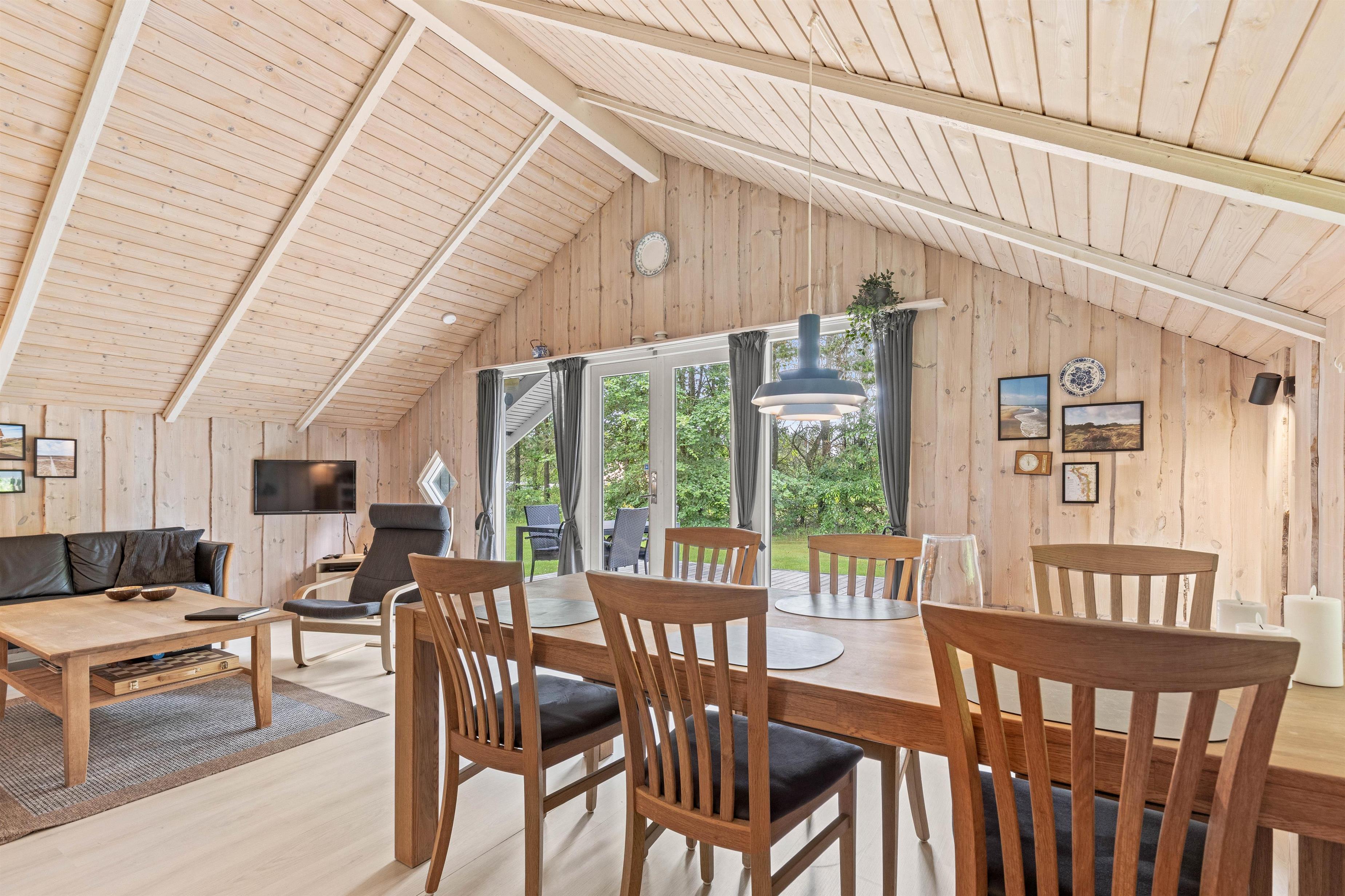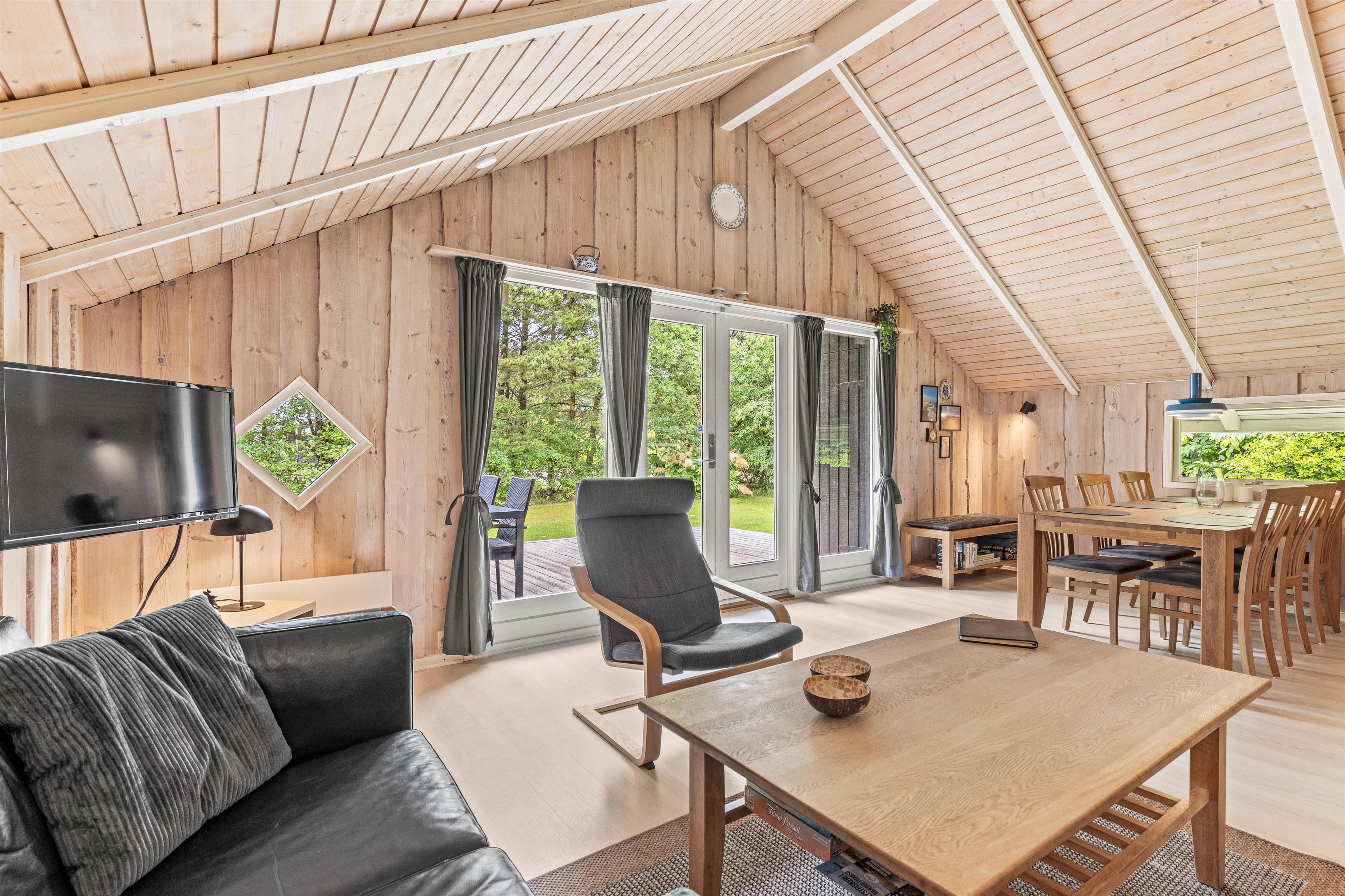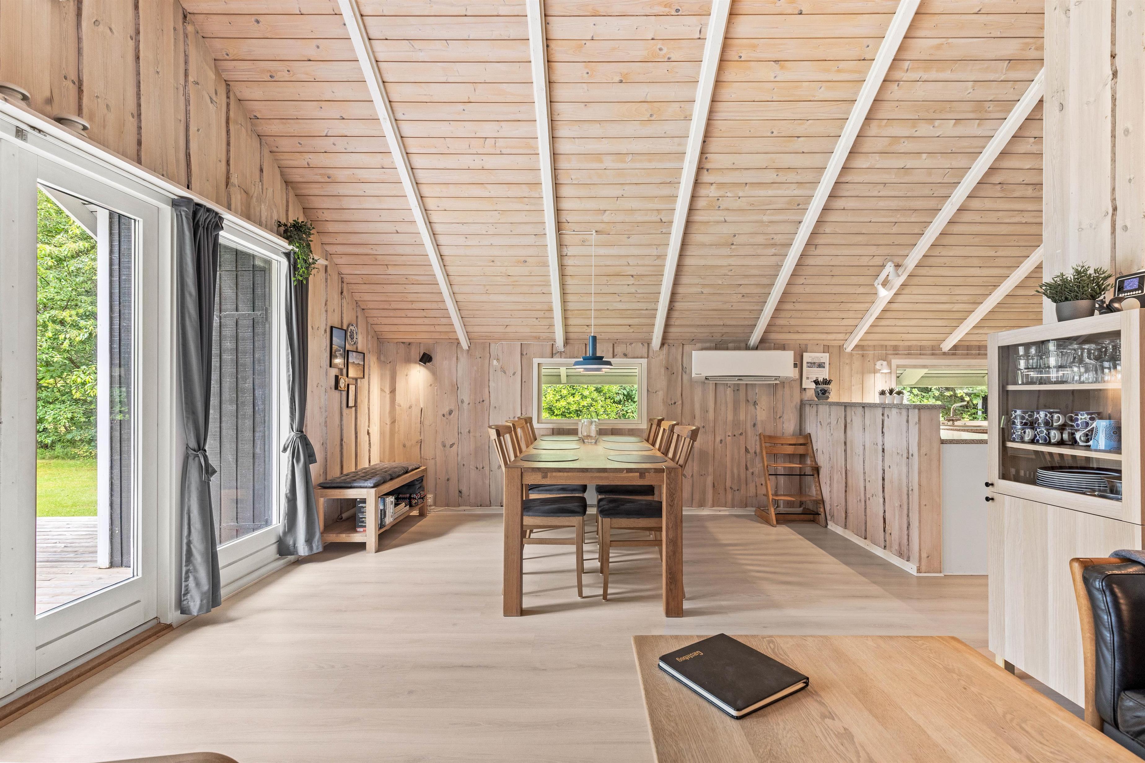 Sommerhuset er lyst indrettet, hvilket skaber en varm og indbydende atmosfære med masser af plads i de komfortable møbler, ideelt for familiehygge. Det åbne køkken i forbindelse med stuen skaber et samlet rum, hvor I kan tilberede måltider og samtidig holde øje med børnene, mens de er optaget af dagens brætspil eller puslespil. Store vinduer fylder rummet med naturligt lys og giver en dejlig udsigt til den grønne have, som fremhæver nærheden til naturen.