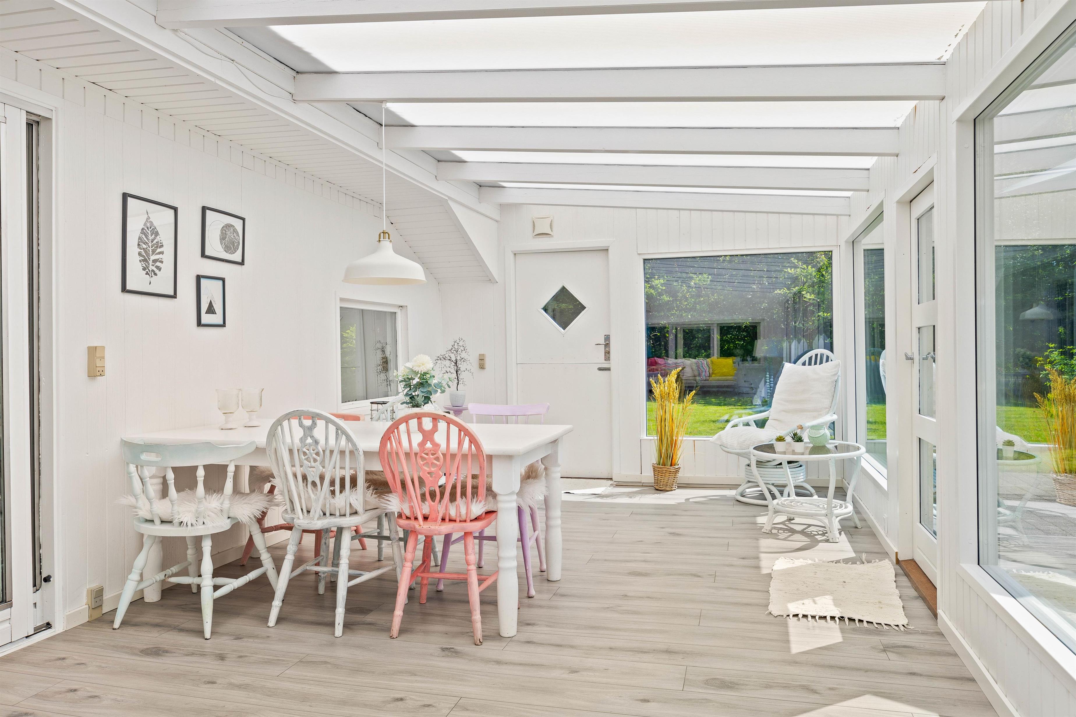 Udendørs byder sommerhuset på en dejlig, åben terrasse, som er delvist afskærmet og lukket, hvilket giver masser af privatliv og sikkerhed, især hvis I har små børn eller en hund med. Terrassen er perfekt til afslapning, med komfortable havemøbler og solsenge, hvor I kan nyde solen og den friske luft.