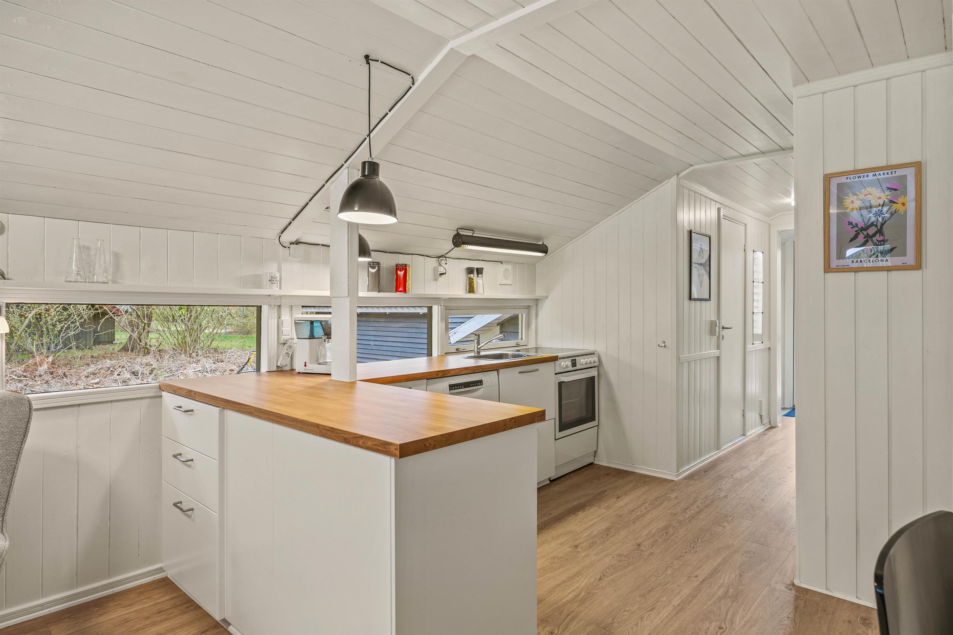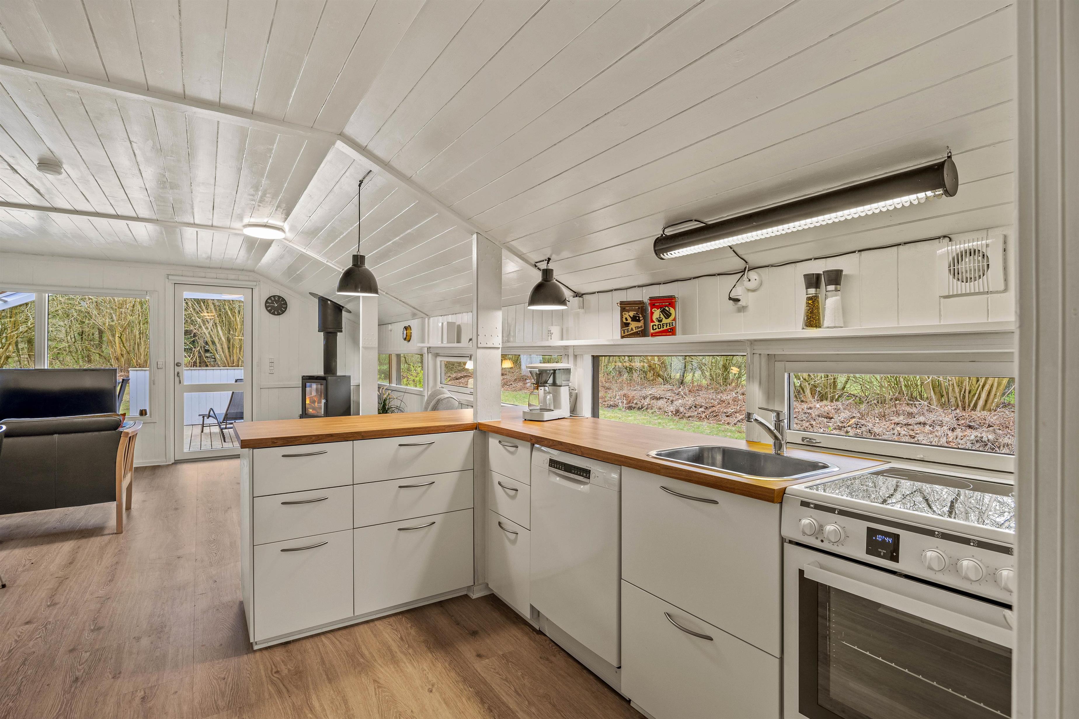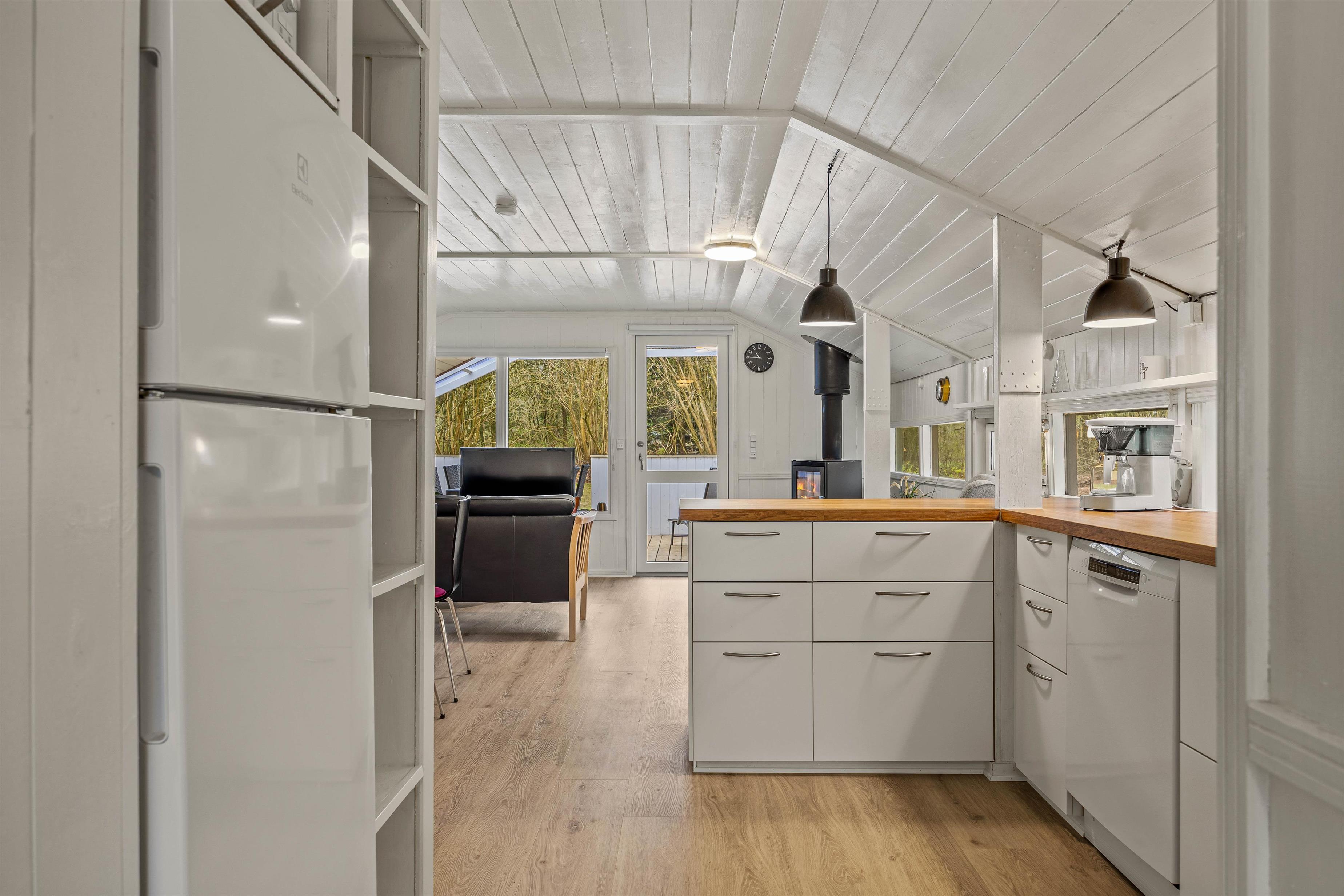 Det smukke, åbne køkken er fuldt udstyret, inklusive en praktisk opvaskemaskine, så I nemt kan tilberede jeres måltider uden at skulle bekymre jer om opvasken. I alt 3 soveværelser, udstyret med 2 dobbeltsenge og 1 enkeltseng, sikrer afslappende nætter og privatliv for alle gæster. Det lille badeværelse har gulvvarme og sikrer, at I ikke får kolde fødder, selv på køligere dage.